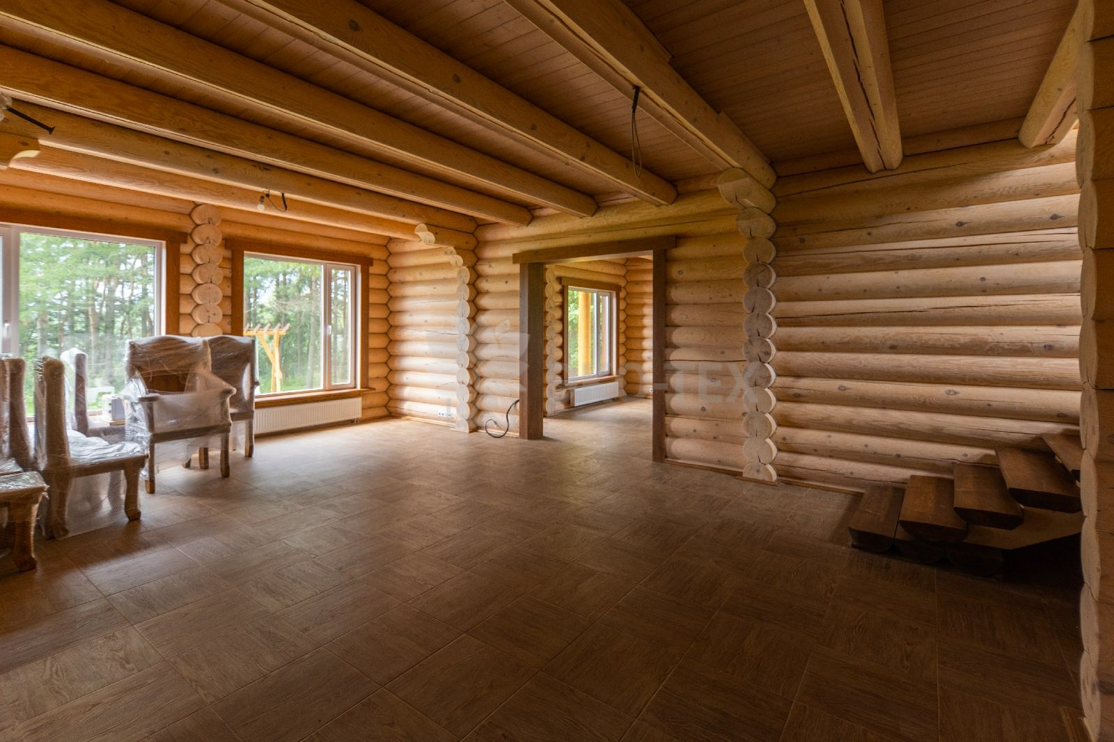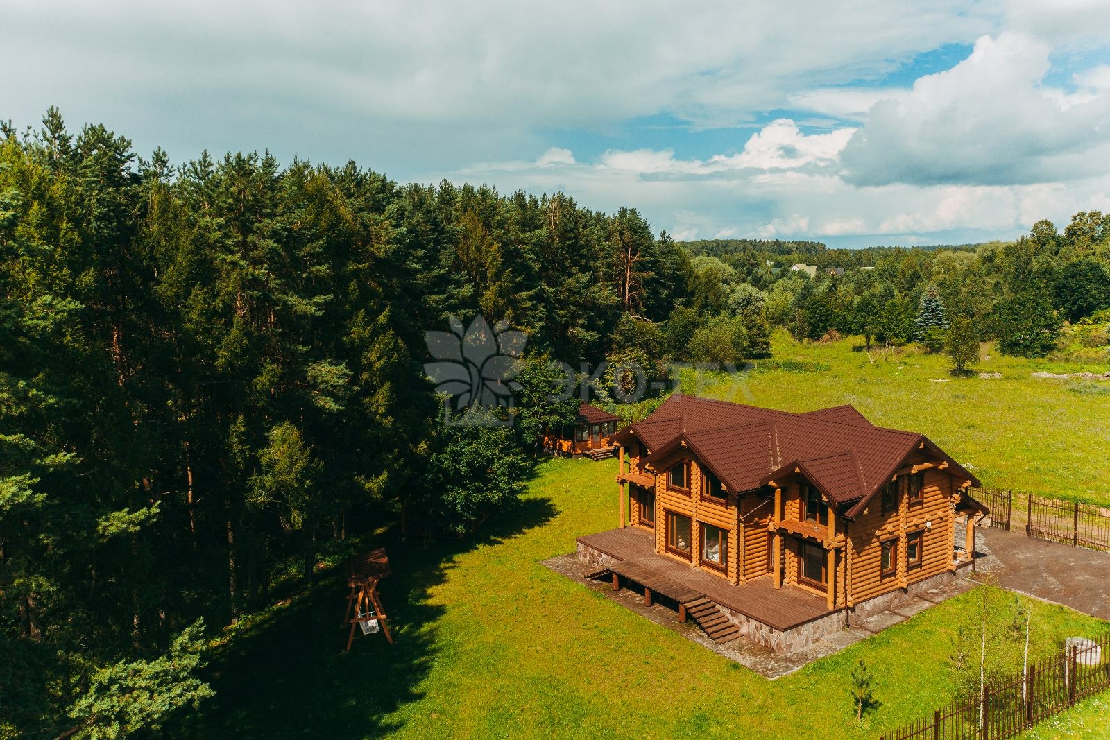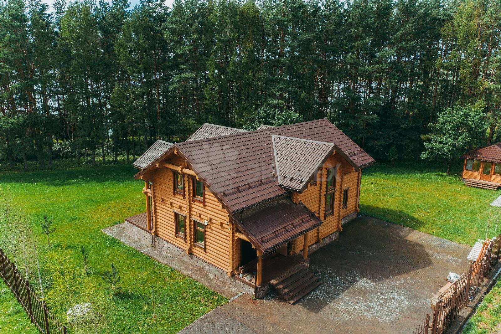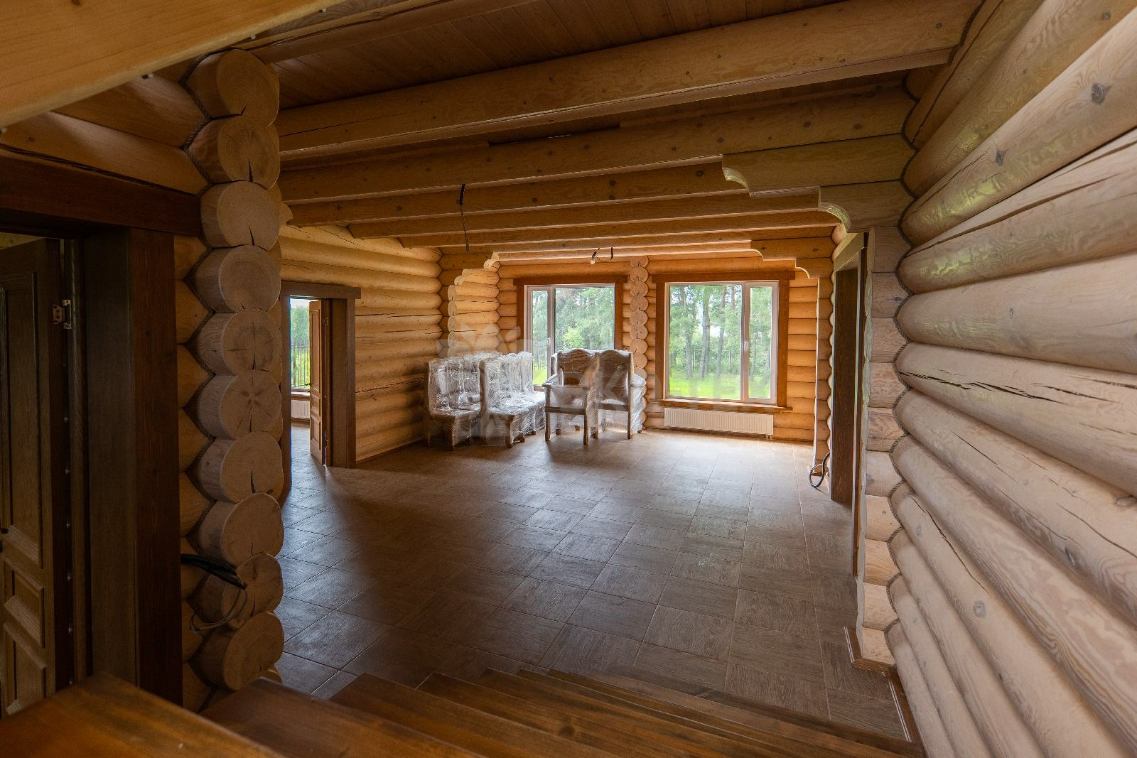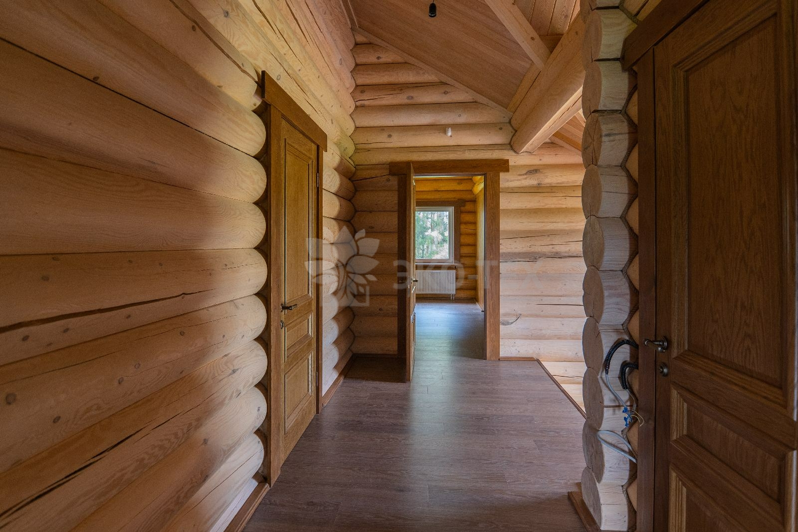 Удобное крыльцо — терраса защищено надежным навесом от любых капризов природы. Просторное двухэтажное здание, главный фасад которого украшен роскошными панорамными окнами, образующие единую композицию выполнено из оцилиндрованного бревна.