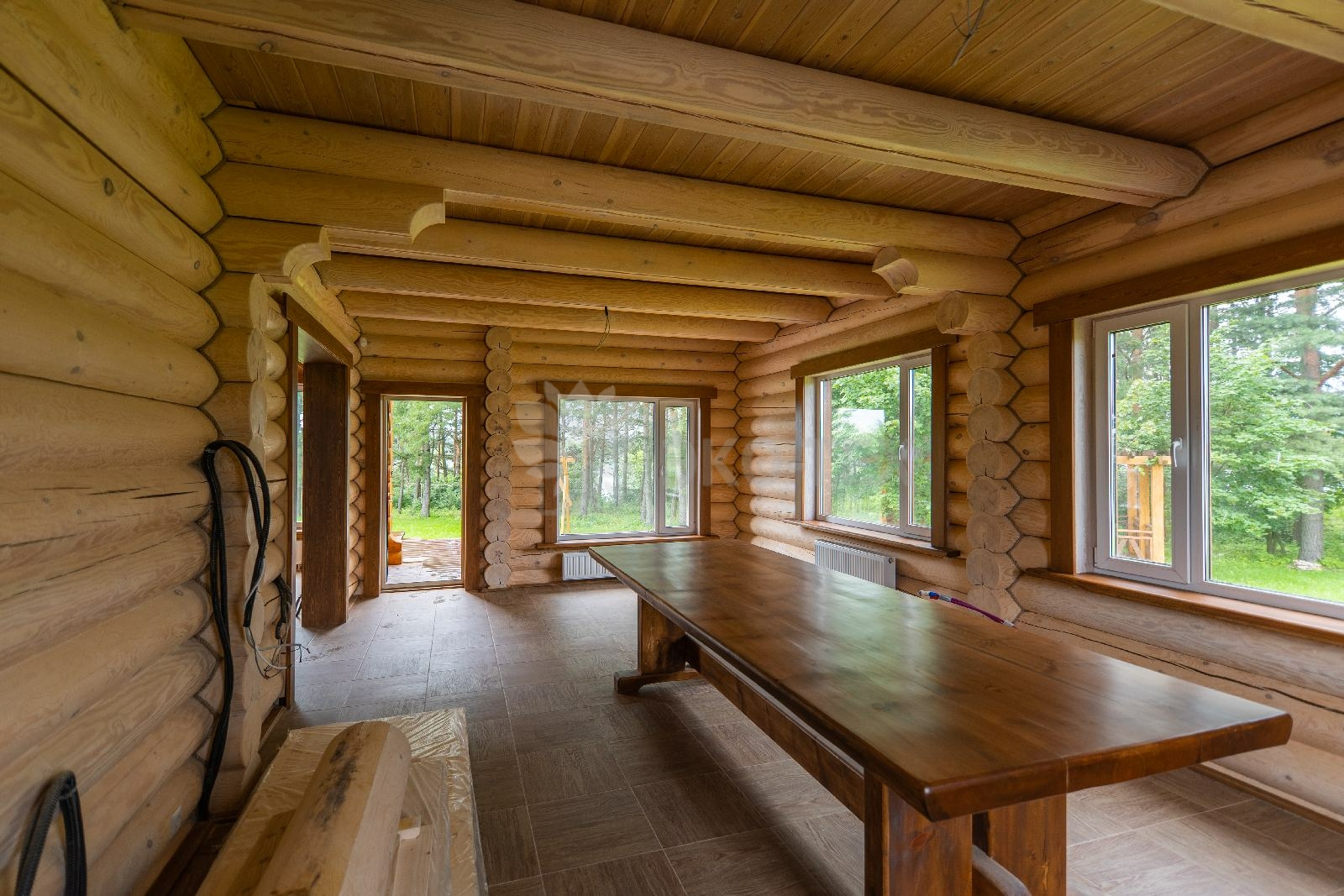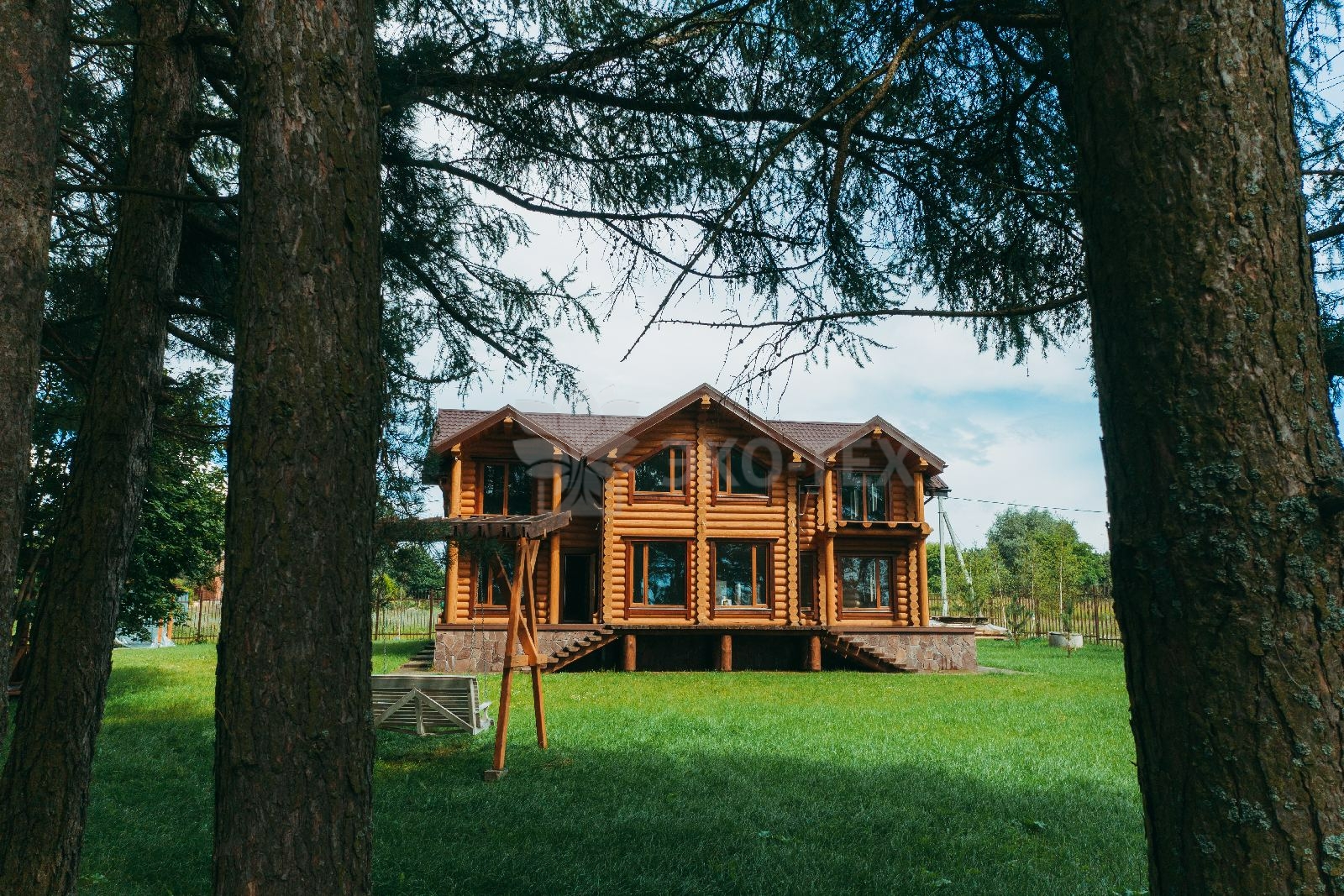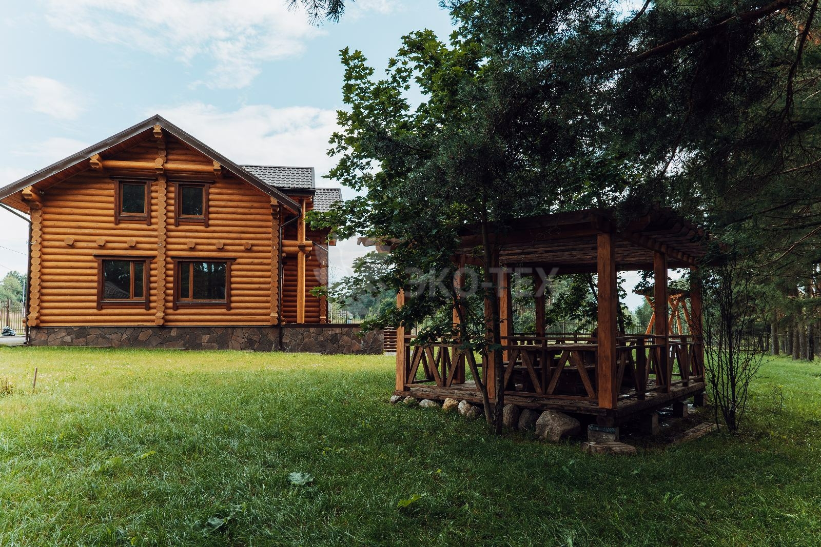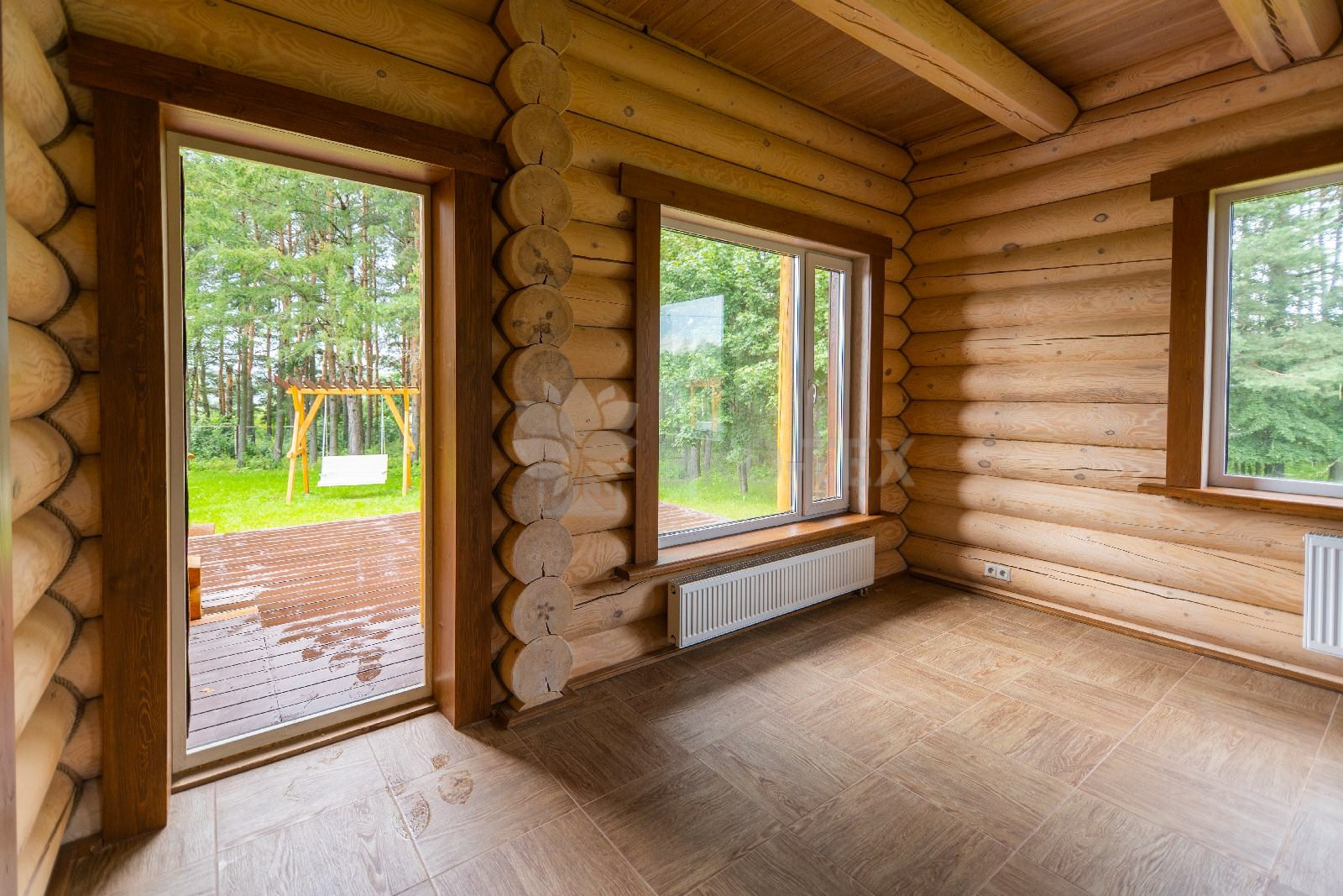 Удобное крыльцо — терраса защищено надежным навесом от любых капризов природы. Просторное двухэтажное здание, главный фасад которого украшен роскошными панорамными окнами, образующие единую композицию выполнено из оцилиндрованного бревна.