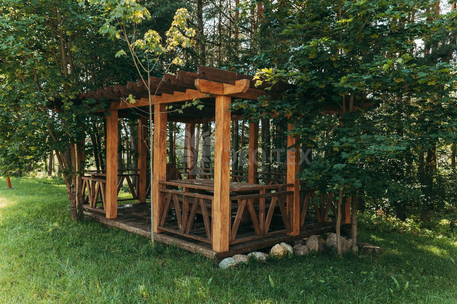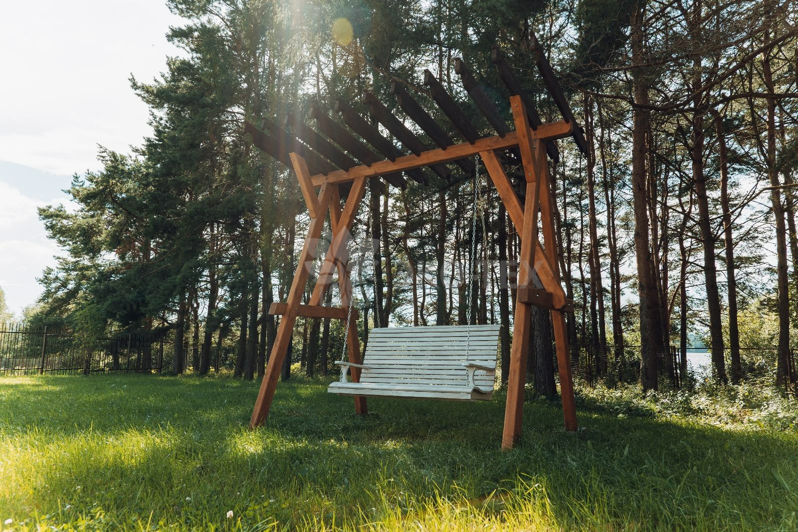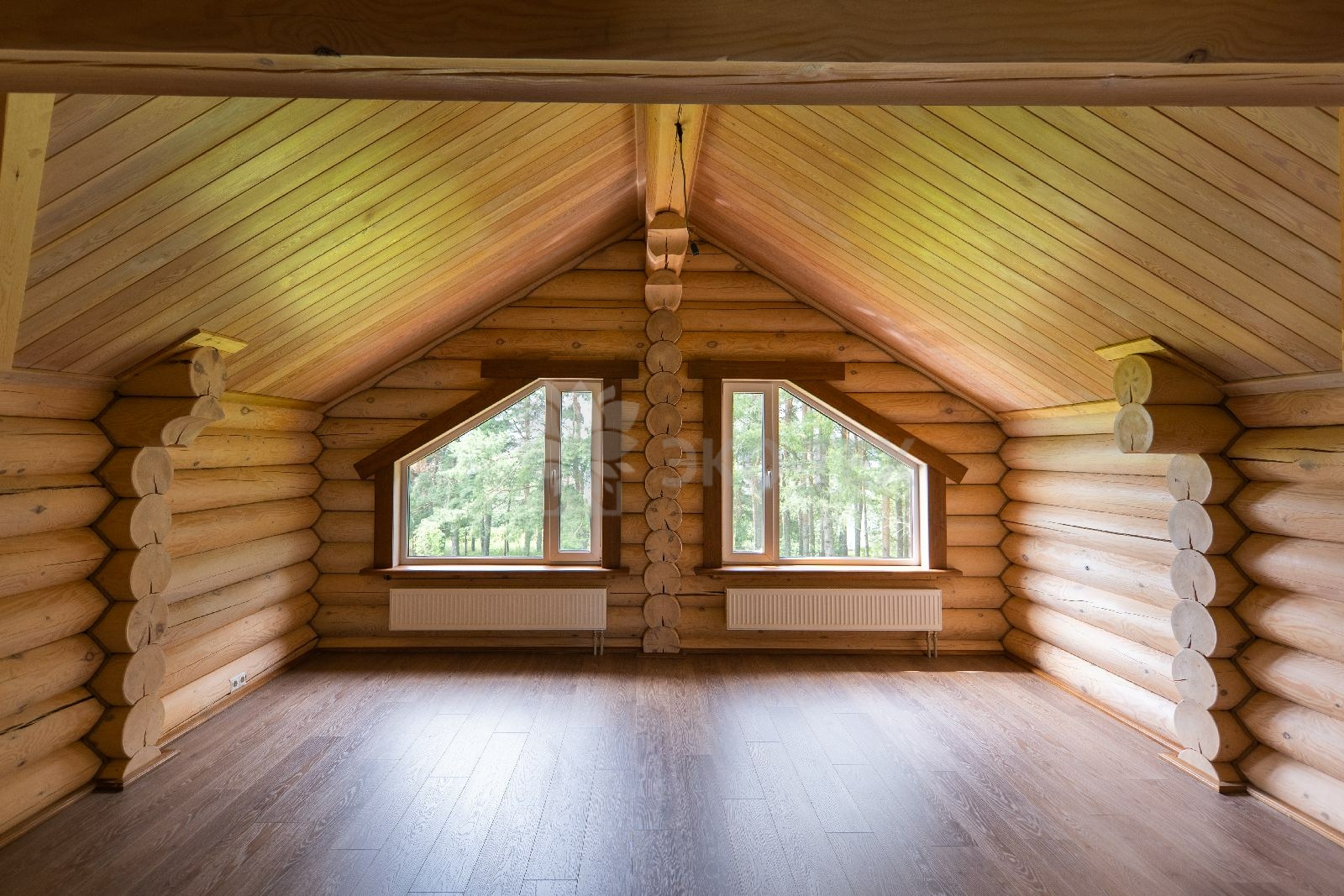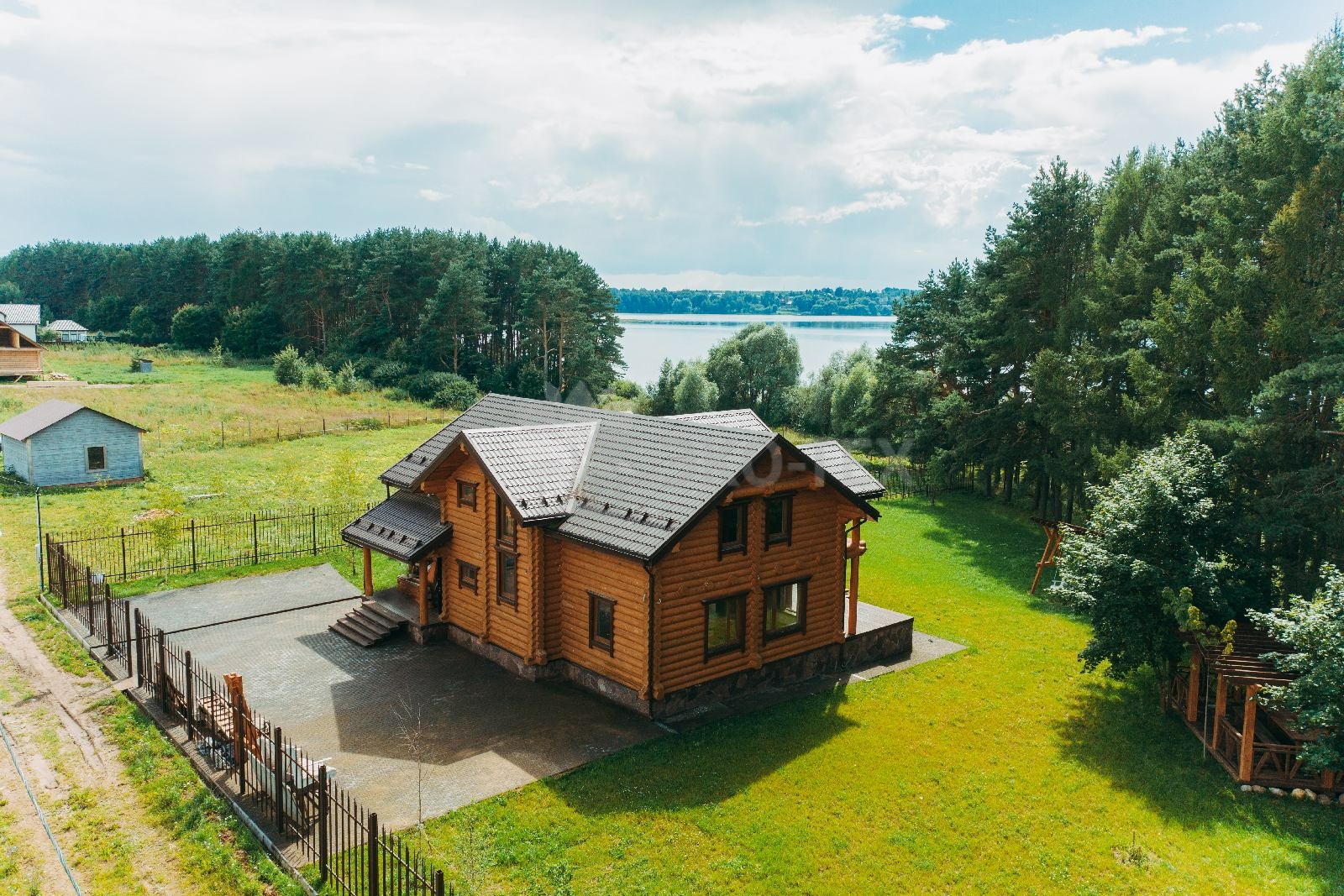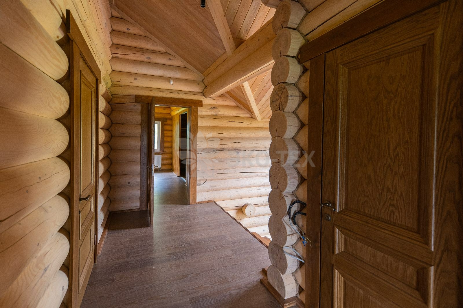 Удобное крыльцо — терраса защищено надежным навесом от любых капризов природы. Просторное двухэтажное здание, главный фасад которого украшен роскошными панорамными окнами, образующие единую композицию выполнено из оцилиндрованного бревна.