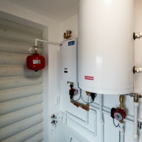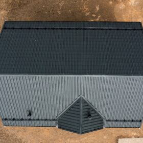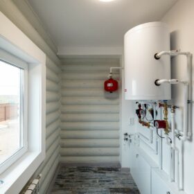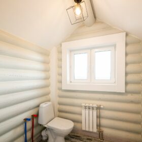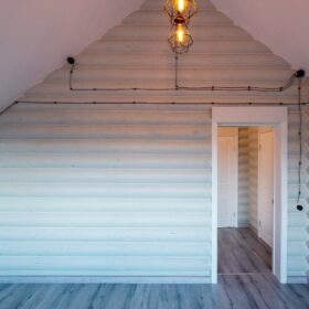 Здесь же находится ещё одна комната, которая, по желанию, может быть гостевой, спальней, кабинетом или творческой студией. Санузел находится рядом с техническим помещением, в котором располагаются котельная и система водоподготовки. Уютная прихожая предваряет выход на крытое металлочерепицей крыльцо.