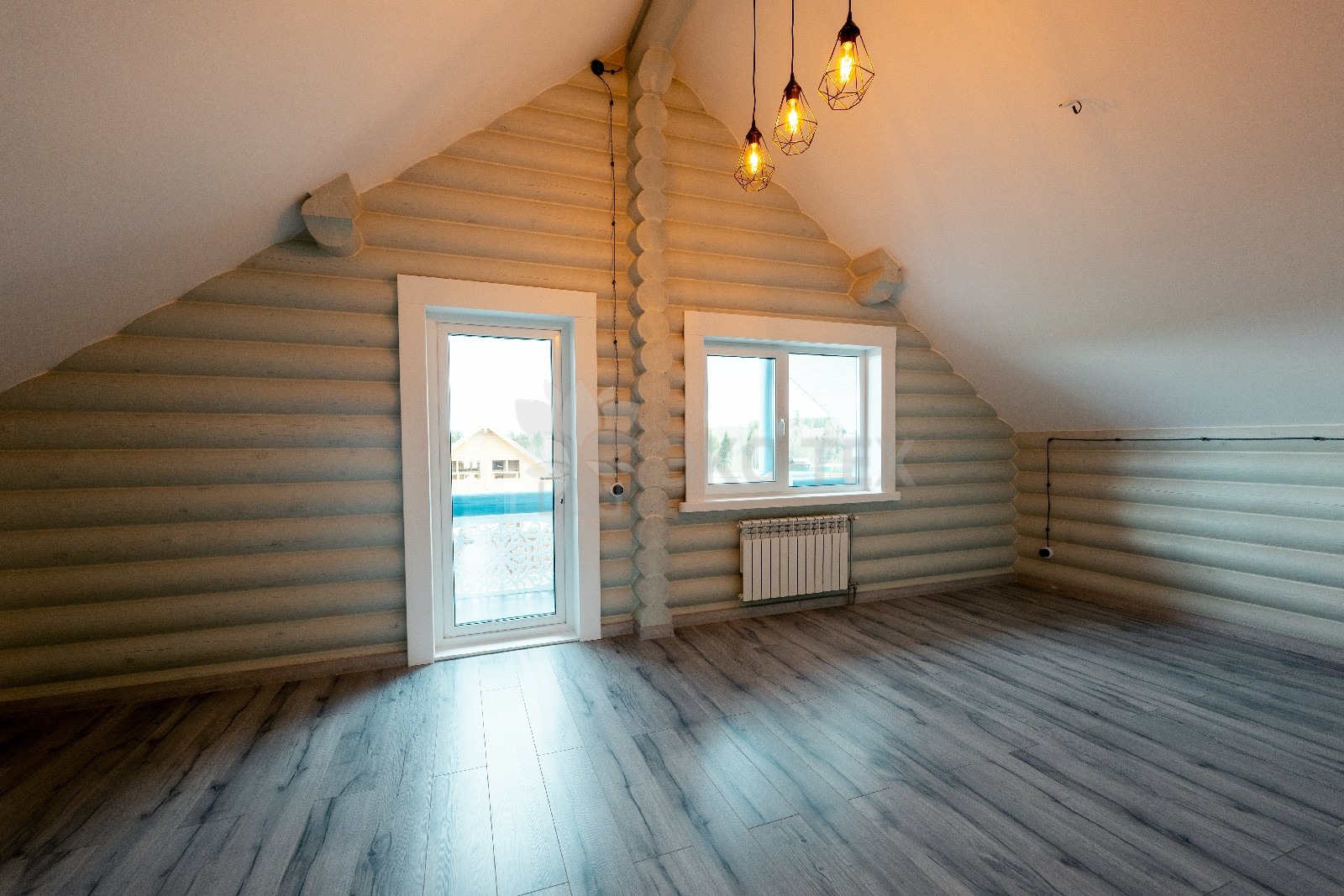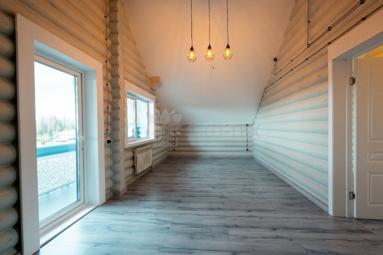 Двухэтажный дом с террасой и мансардой, материал оцилиндрованное бревно