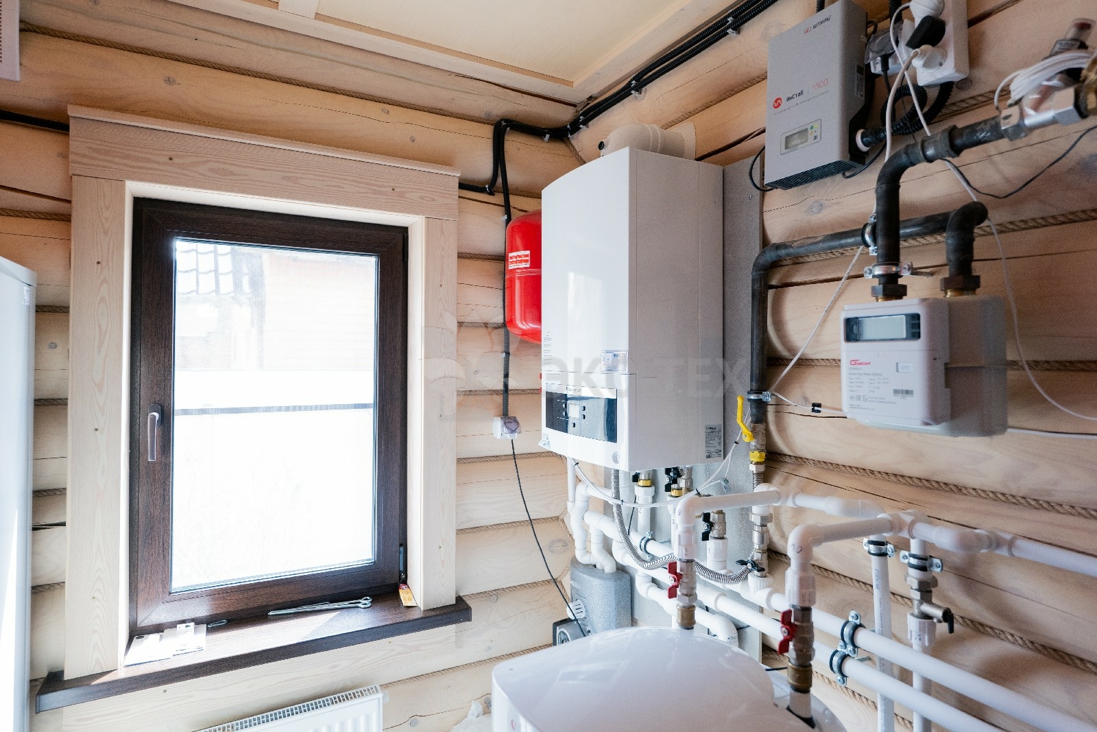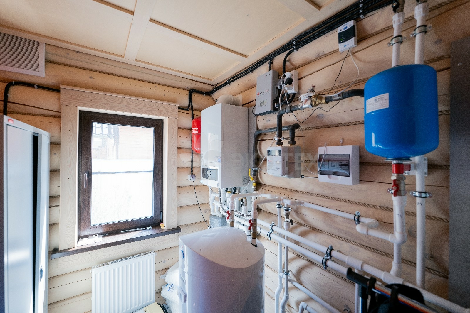 Сбоку расположено ещё одно крыльцо, укрытое навесом. Оно позволяет попадать в дом, практически минуя гостиную. Рядом с этим крыльцом находится техническое помещение, в котором размещён котёл, а также система водяных фильтров.