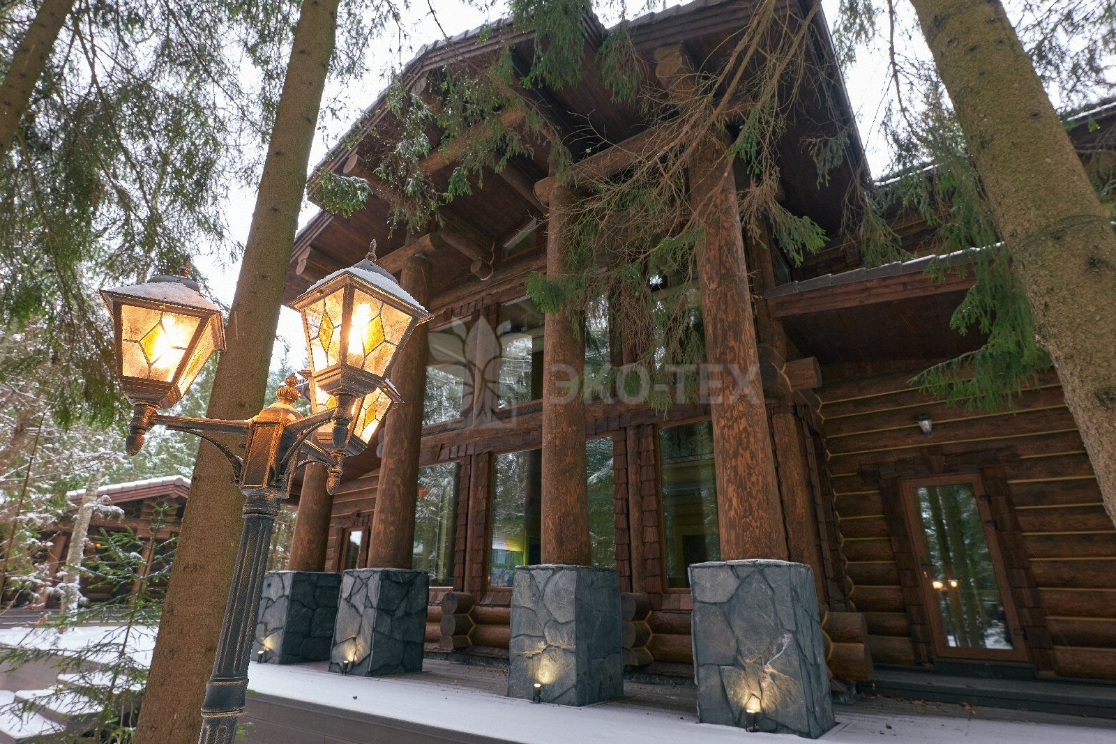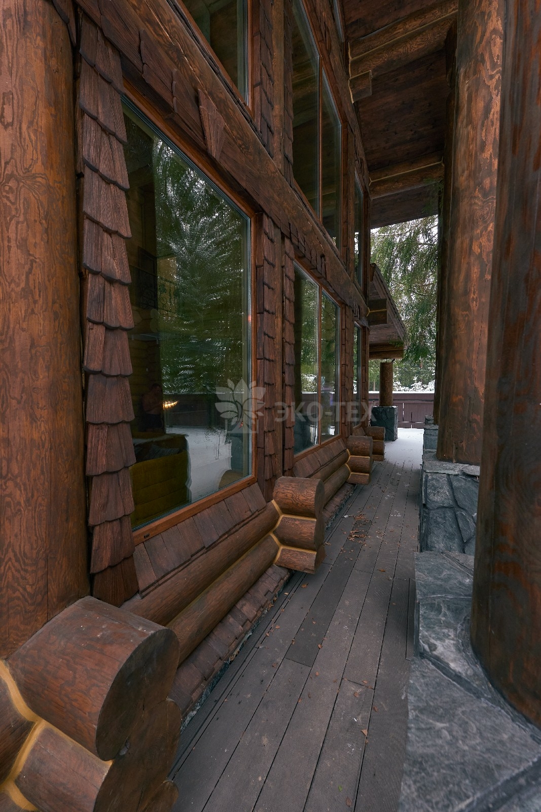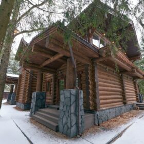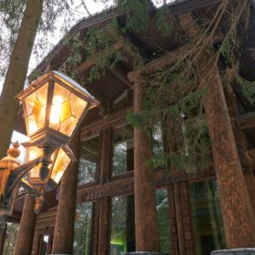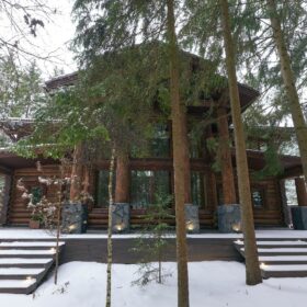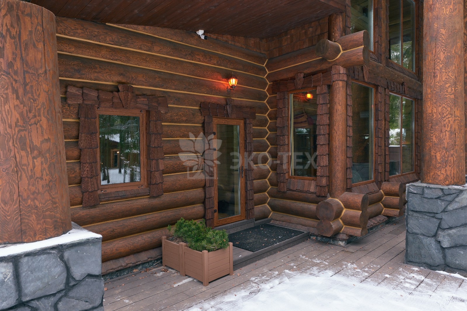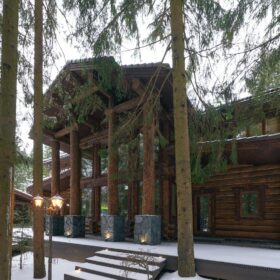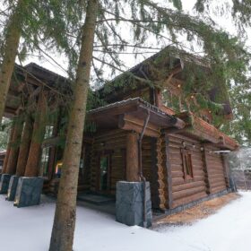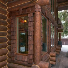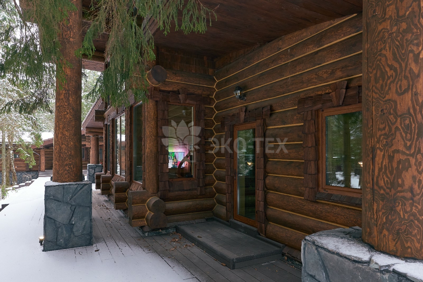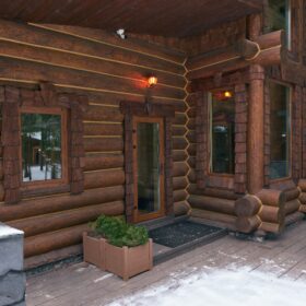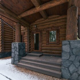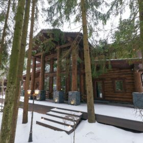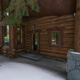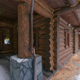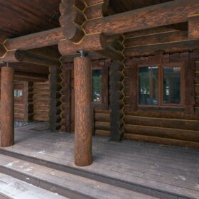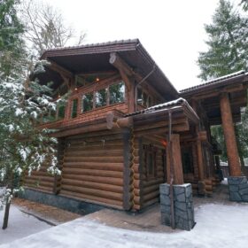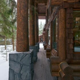 Его необычный роскошный фасад напоминает дворцовые колонны античных времён, а бревенчатые стены из брёвен ручной рубки, придают неповторимый живой колорит.