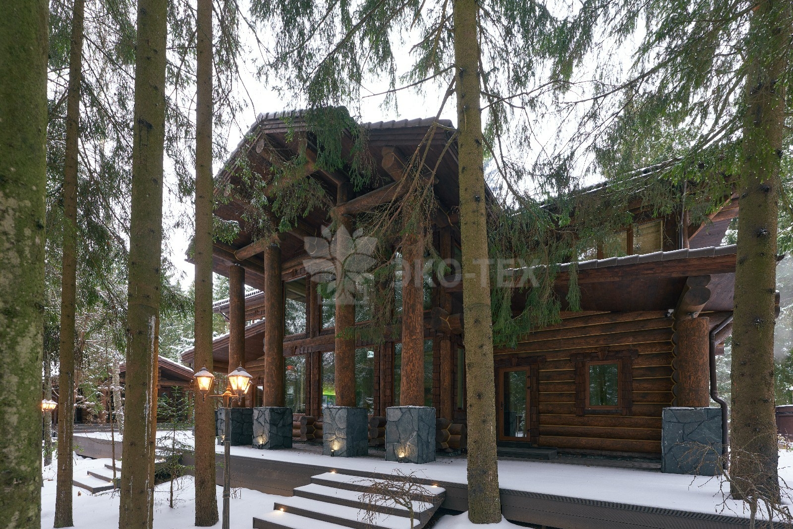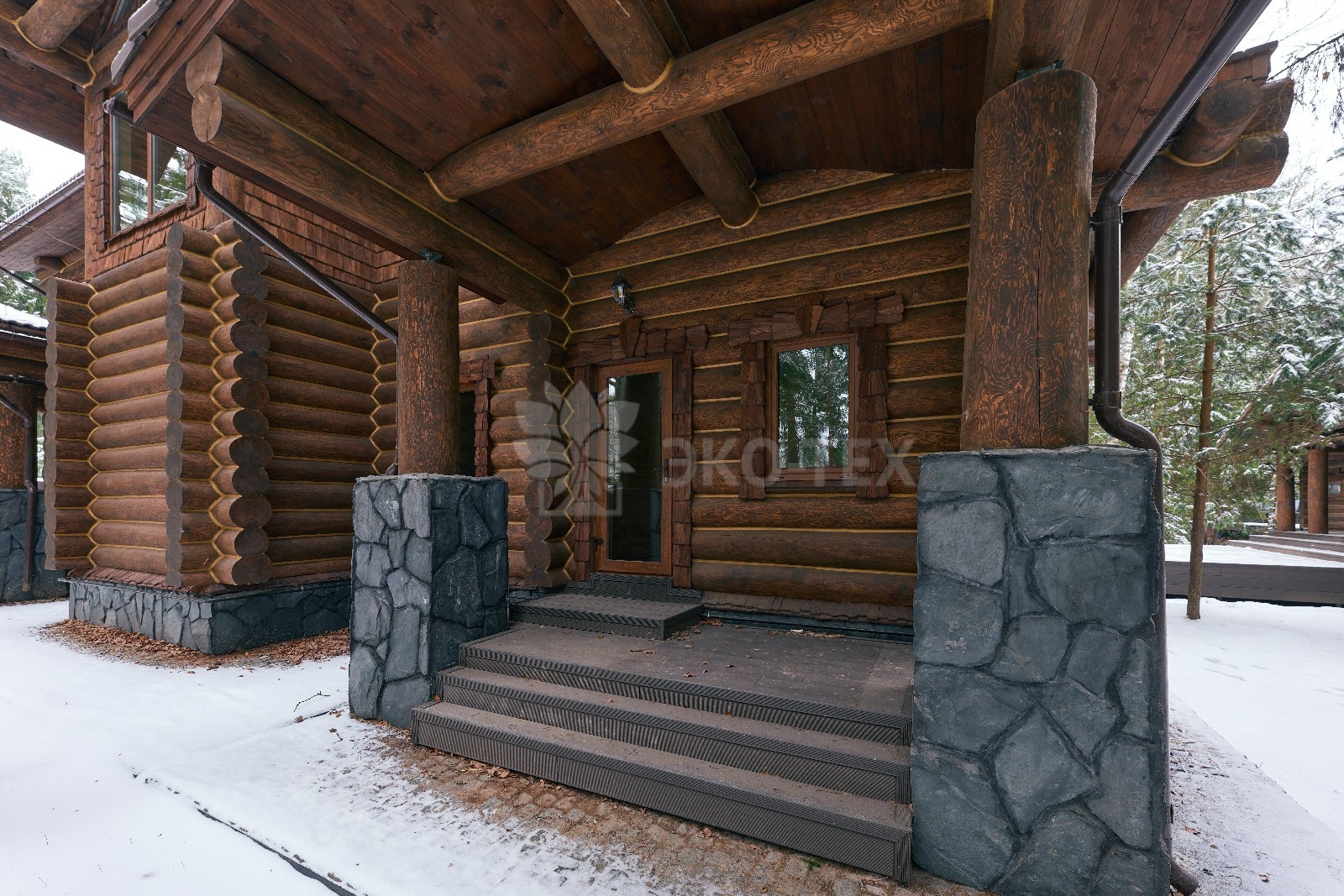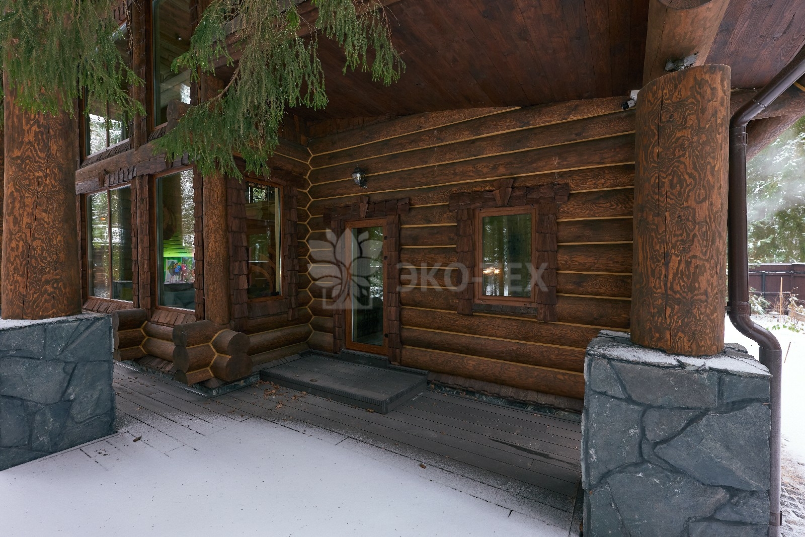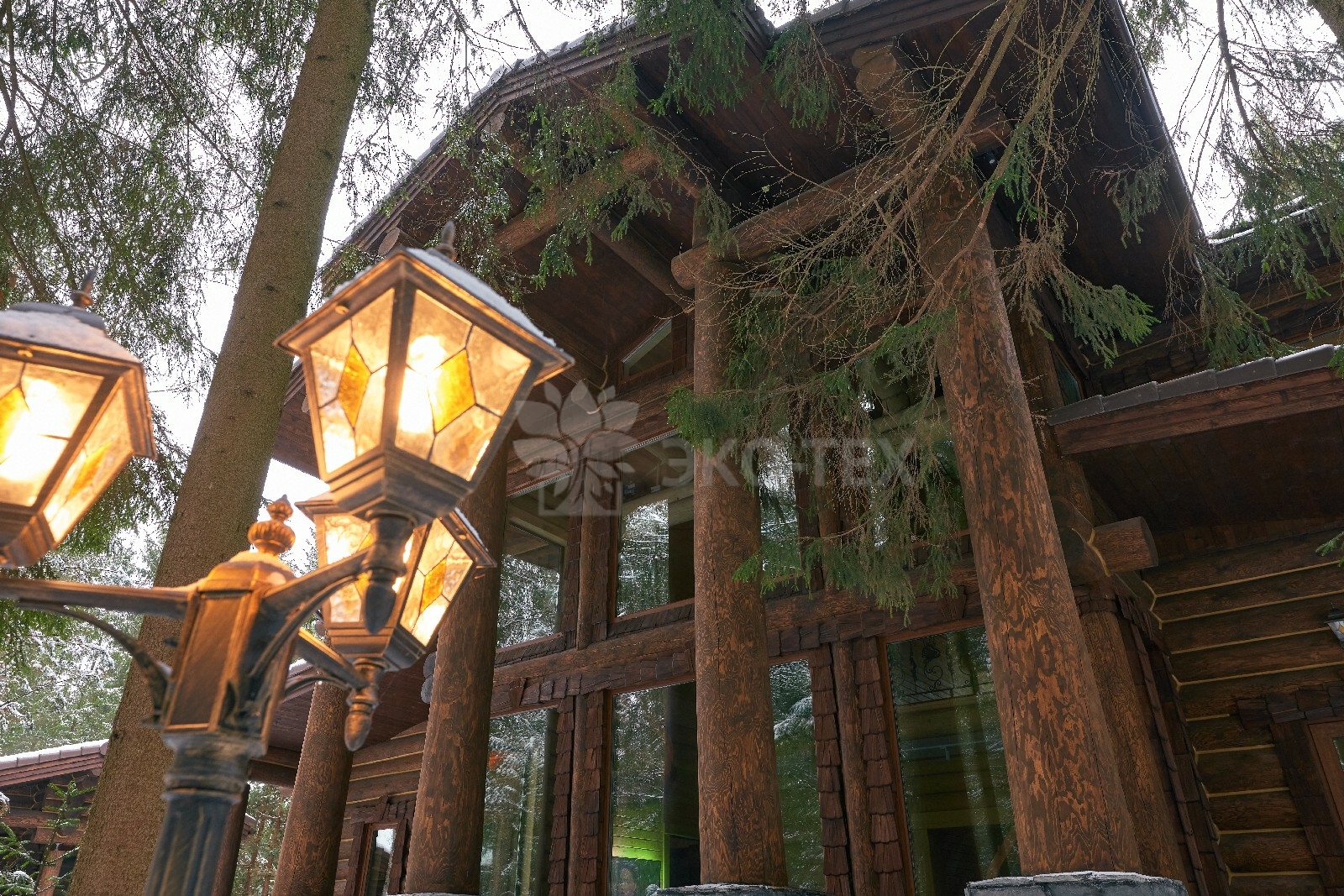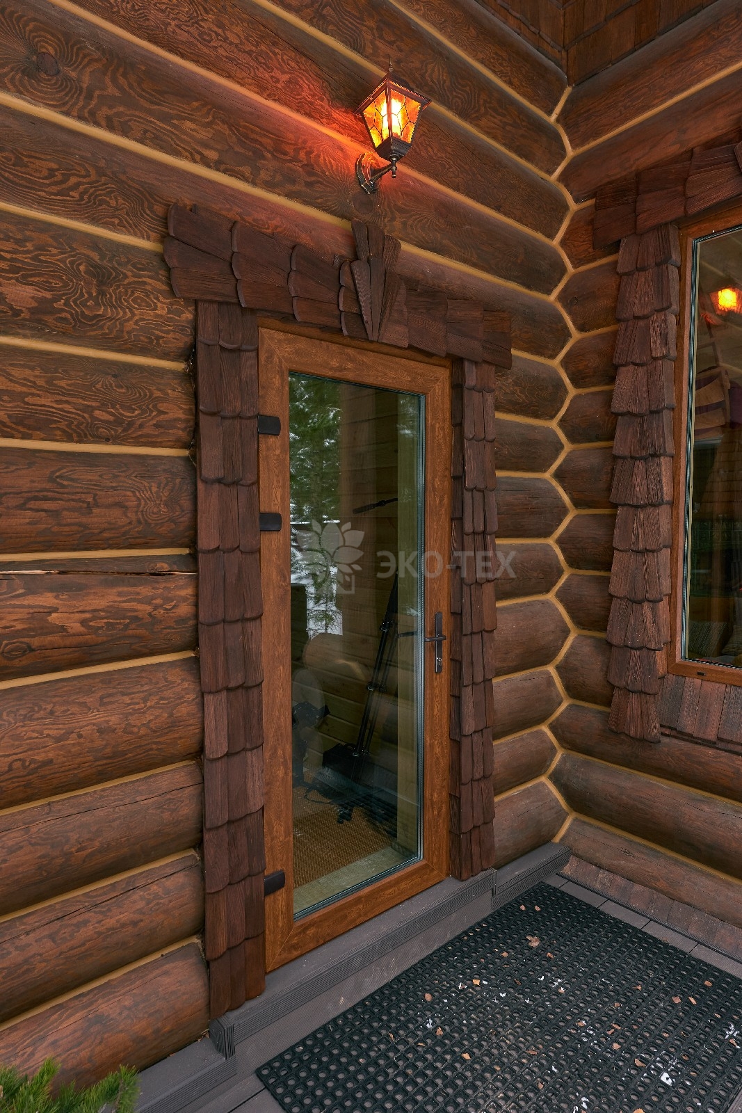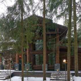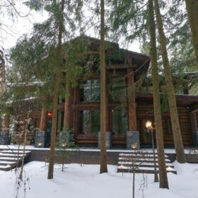 Его необычный роскошный фасад напоминает дворцовые колонны античных времён, а бревенчатые стены из брёвен ручной рубки, придают неповторимый живой колорит.