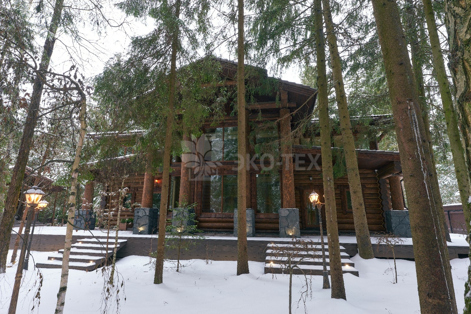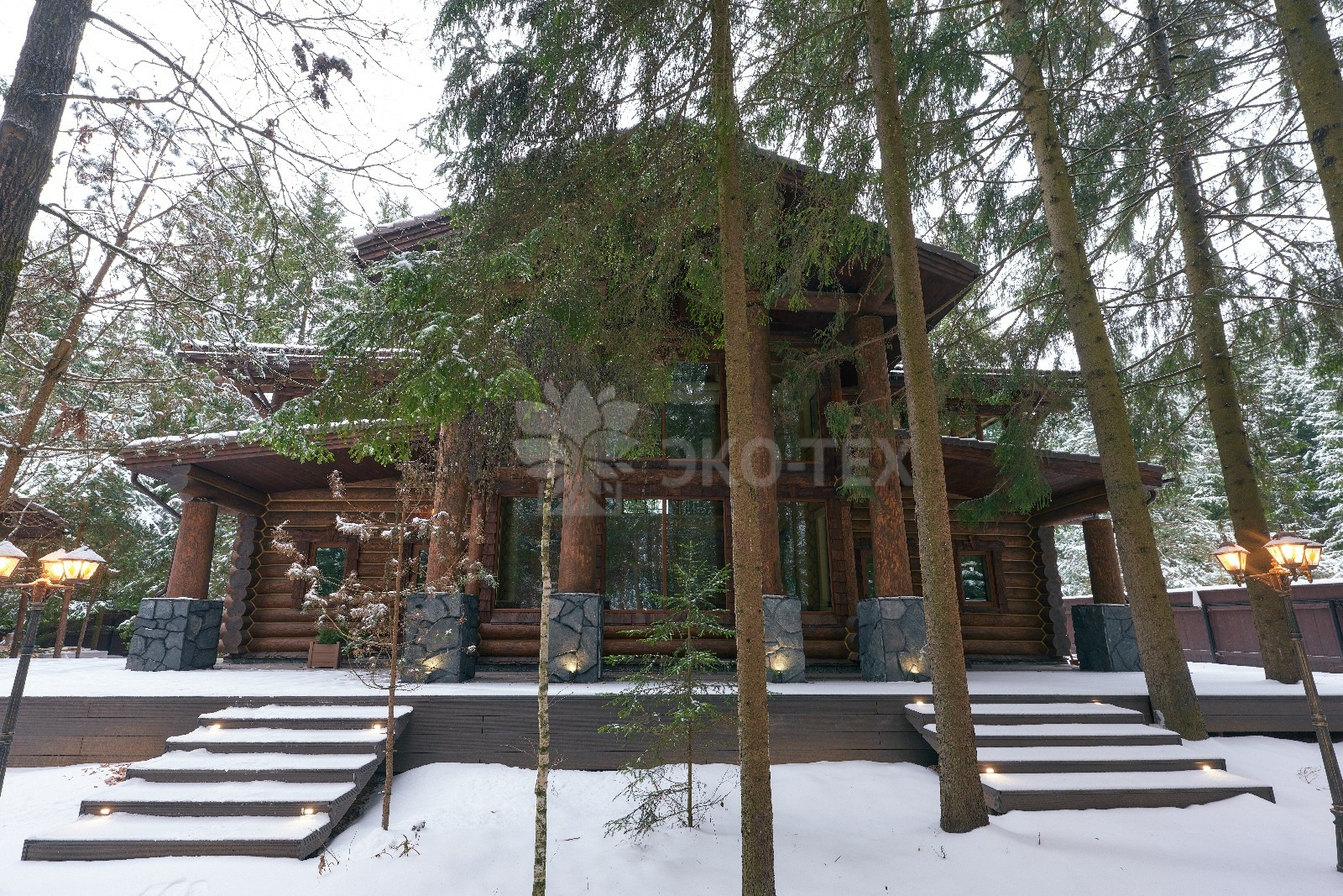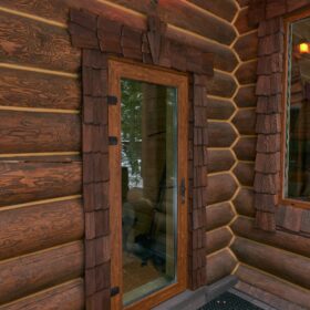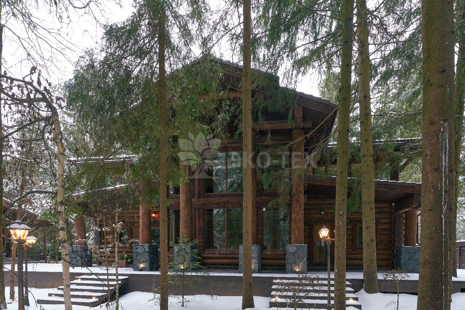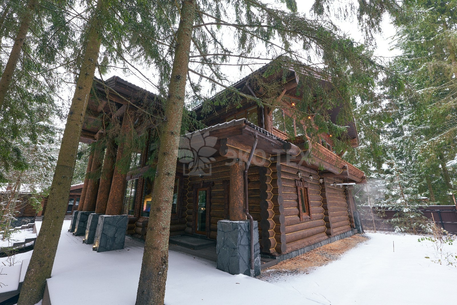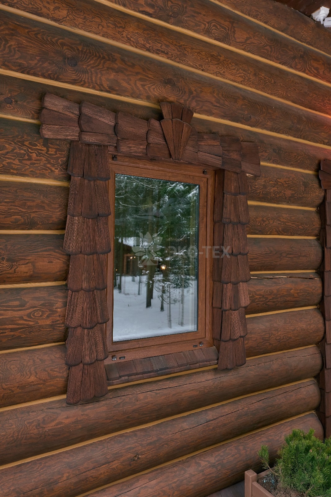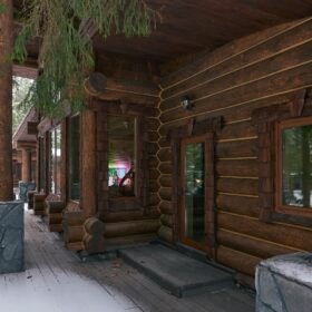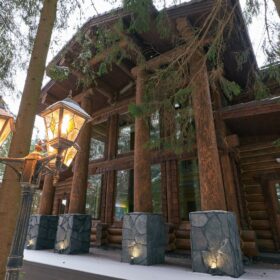 Его необычный роскошный фасад напоминает дворцовые колонны античных времён, а бревенчатые стены из брёвен ручной рубки, придают неповторимый живой колорит.