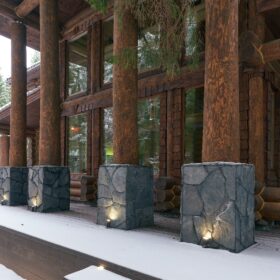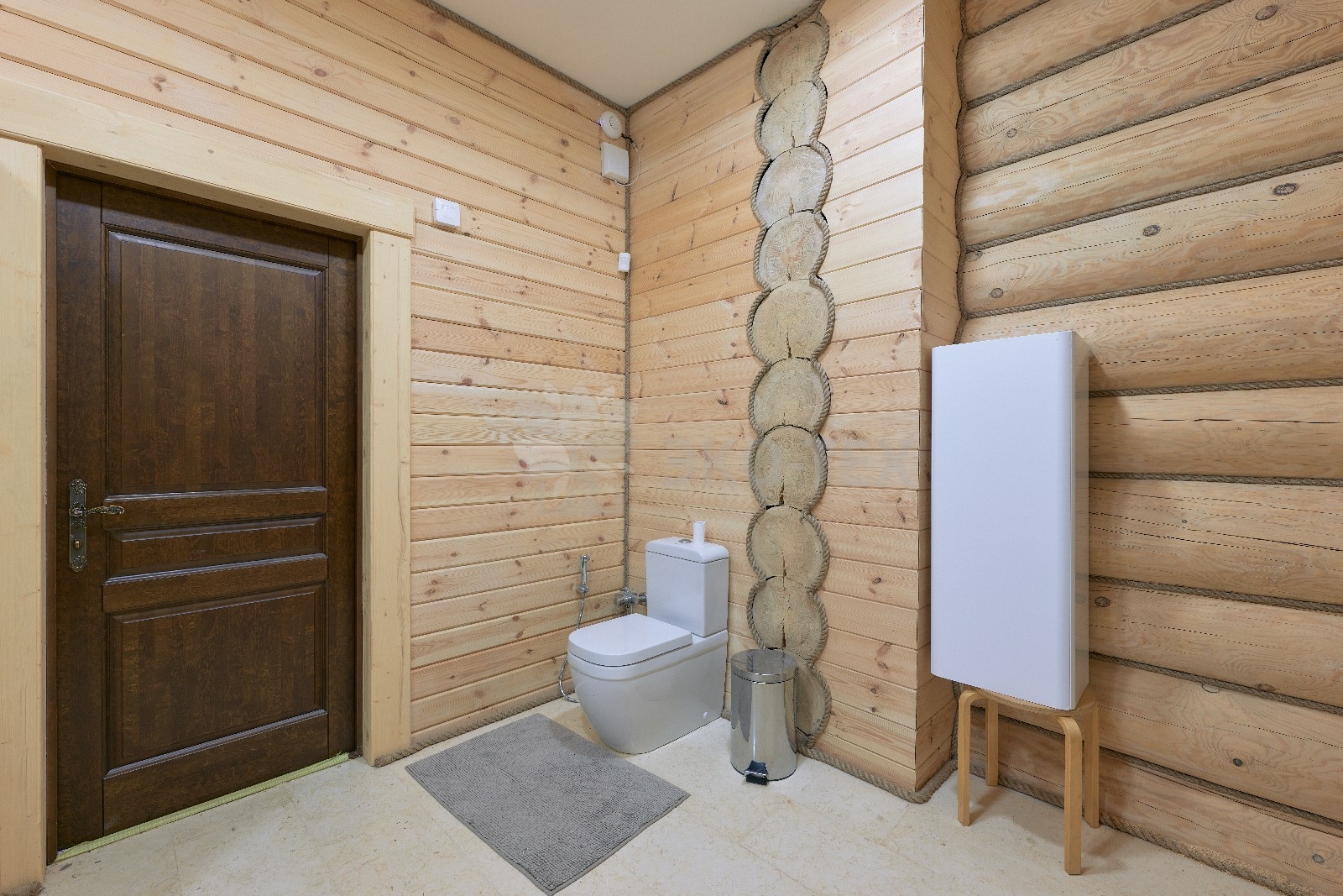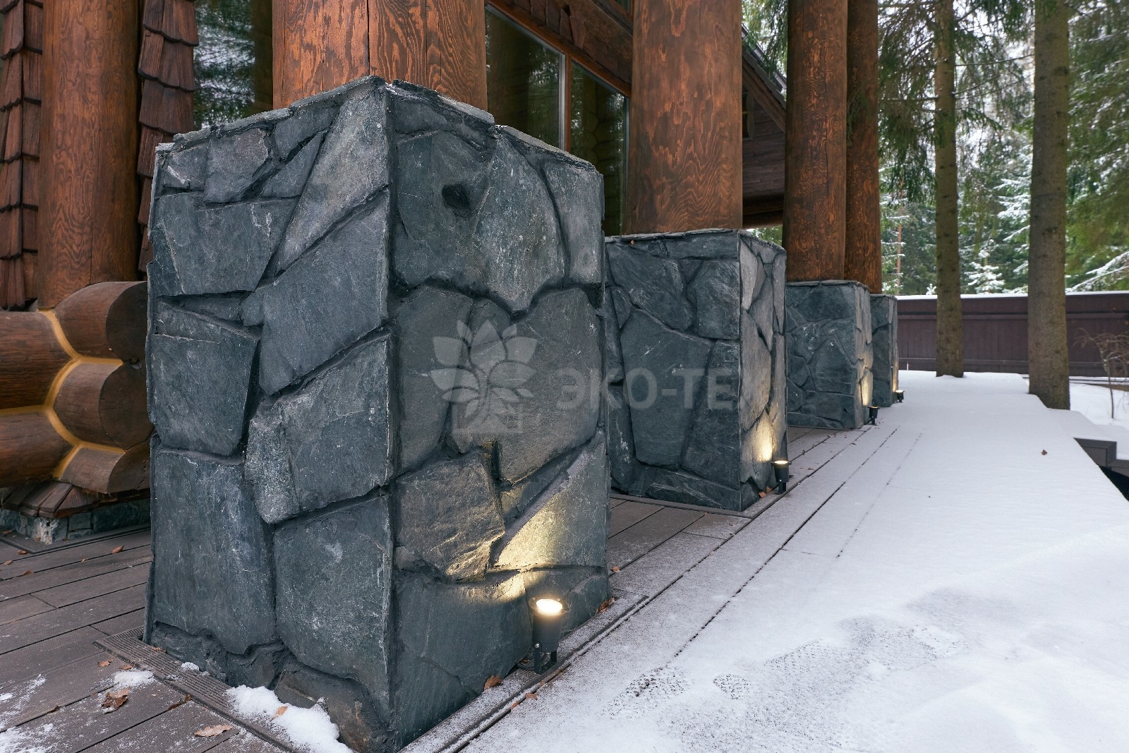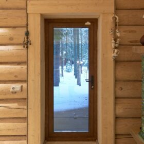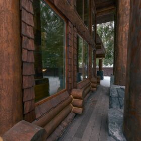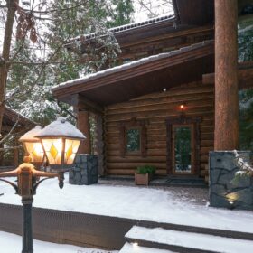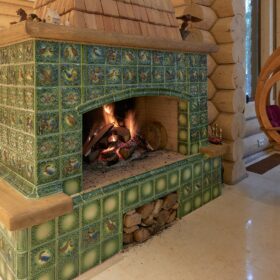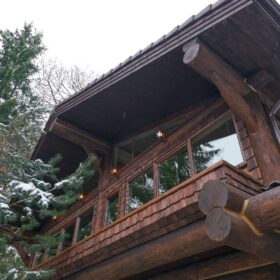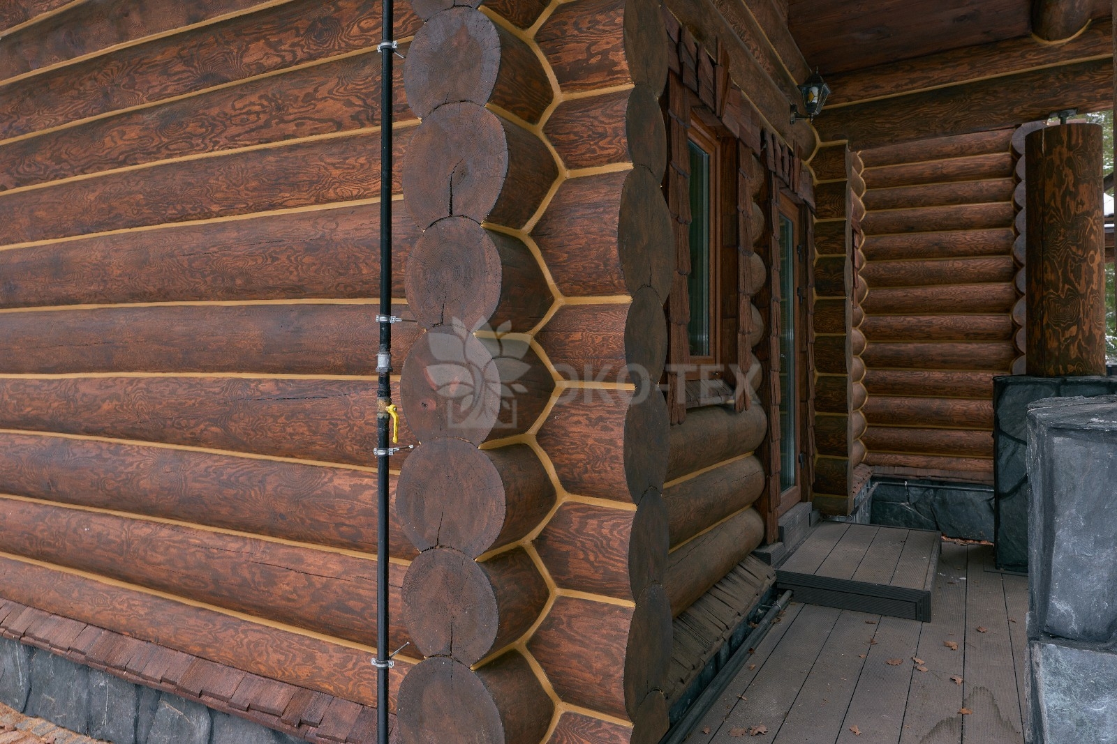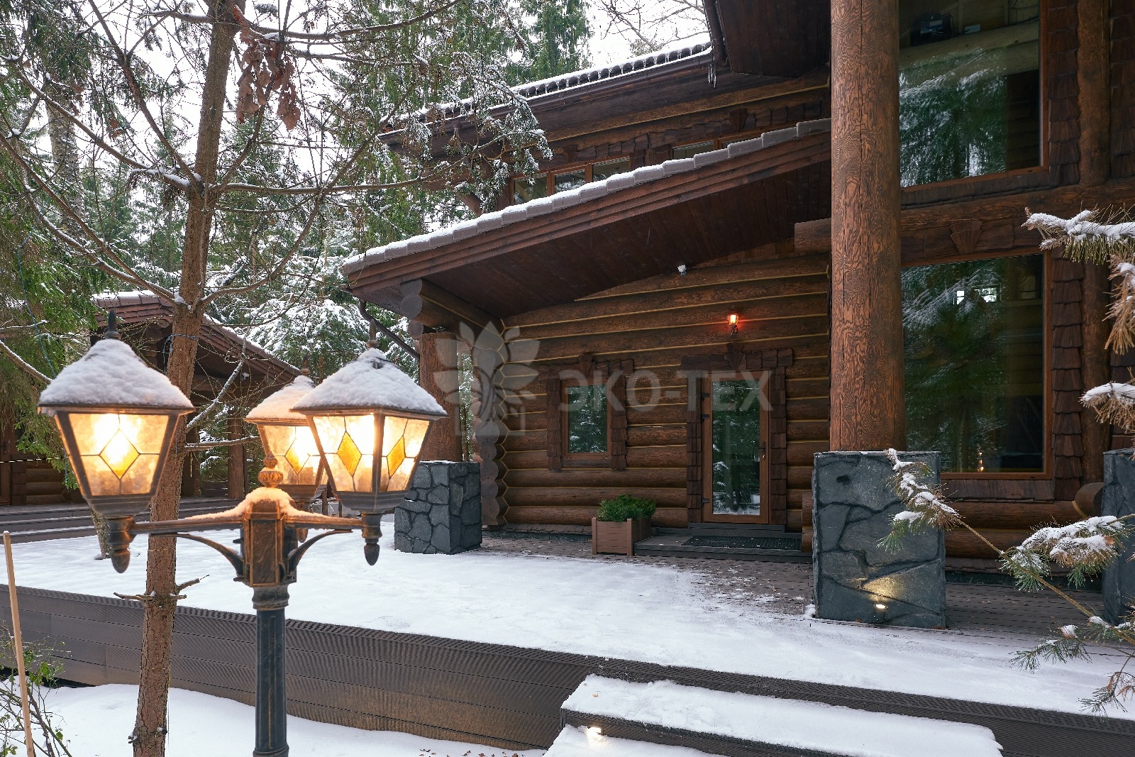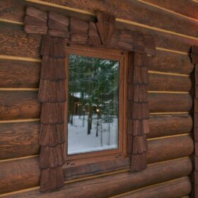 Его необычный роскошный фасад напоминает дворцовые колонны античных времён, а бревенчатые стены из брёвен ручной рубки, придают неповторимый живой колорит.