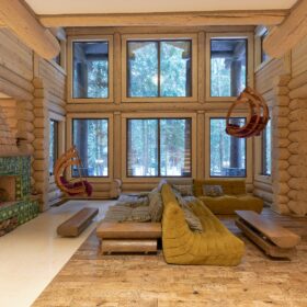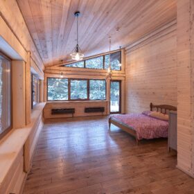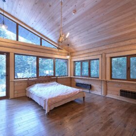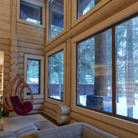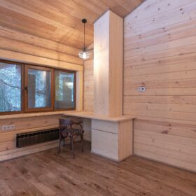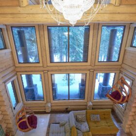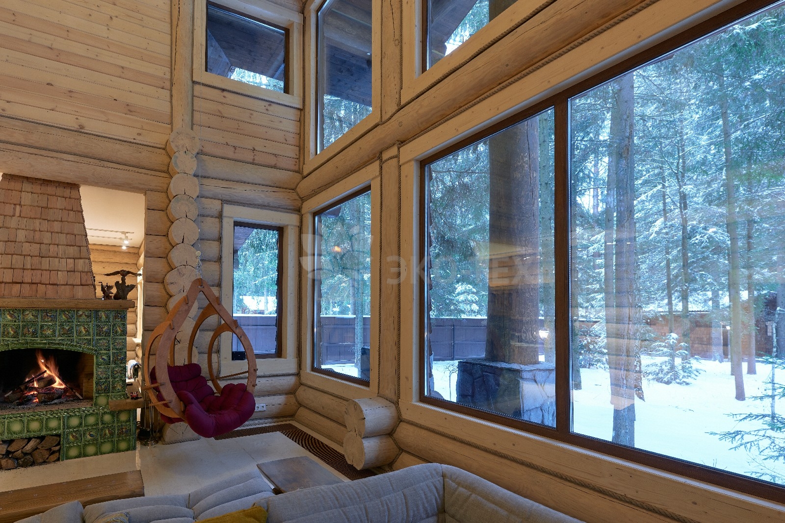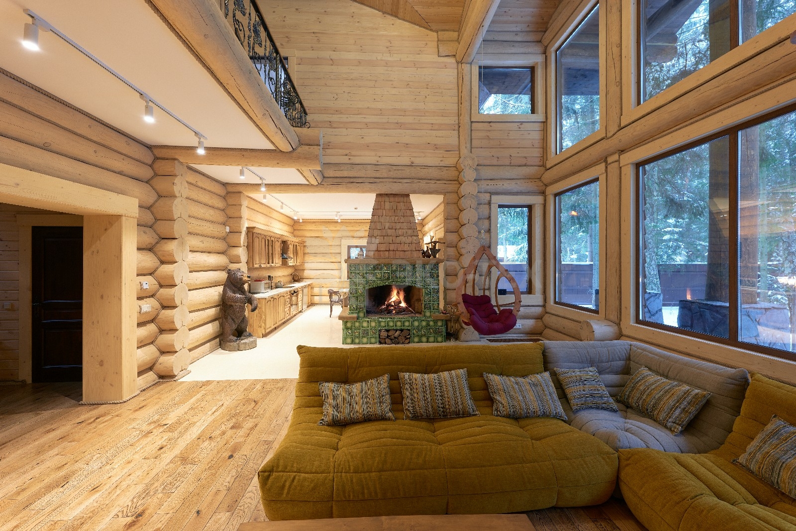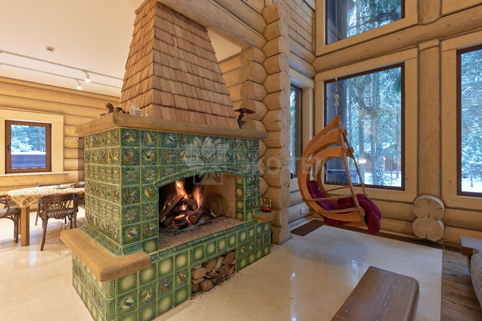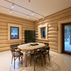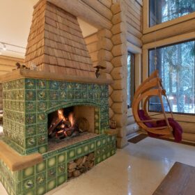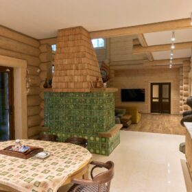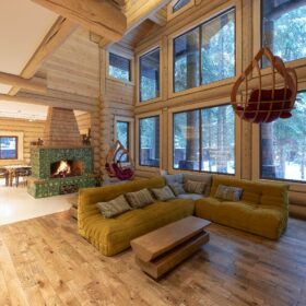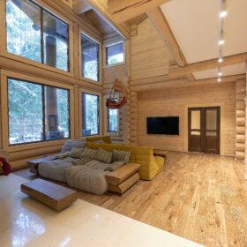 Объединяет все помещения первого этажа гостиная, блистающая всеми оттенками богатства и роскоши. Здесь всё продумано так, чтобы каждый мог насладиться незабываемым отдыхом: это и живой огонь камина, придающий непередаваемую атмосферу зимним вечерам, и окна, сделанные в стиле «второй свет», которые всегда пленяют красотой и полным погружением в окружающий пейзаж. Мягкие диваны с авторским текстилем и необычные кресла придутся по вкусу, как гостям, так и хозяевам.