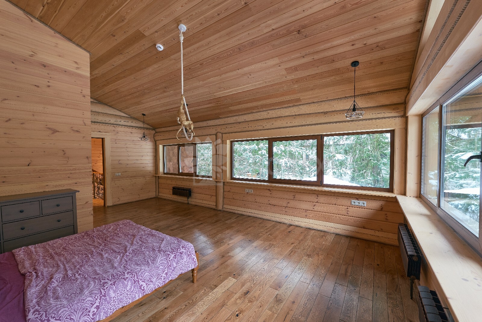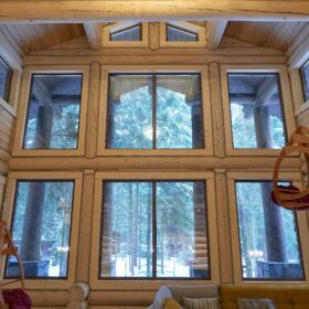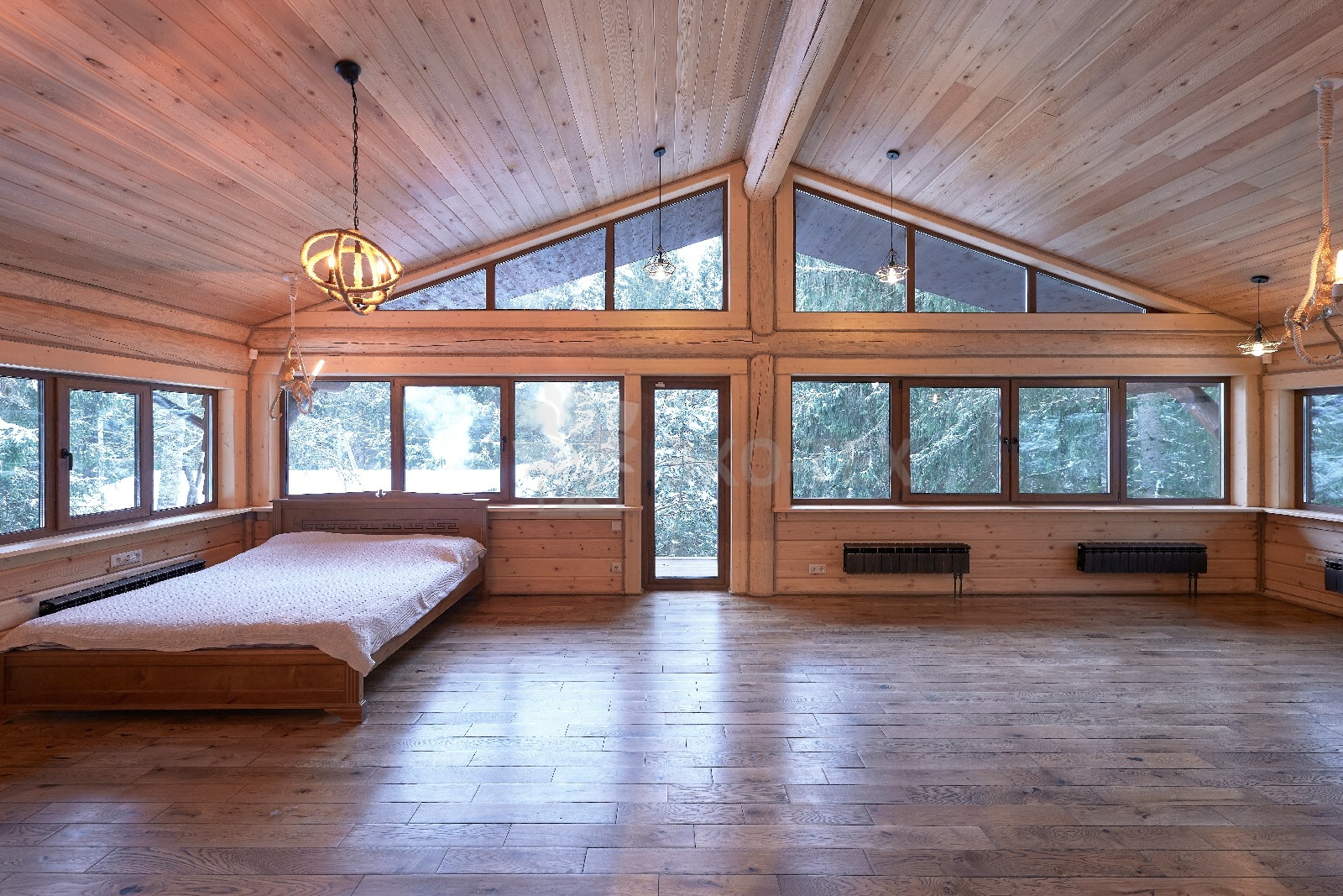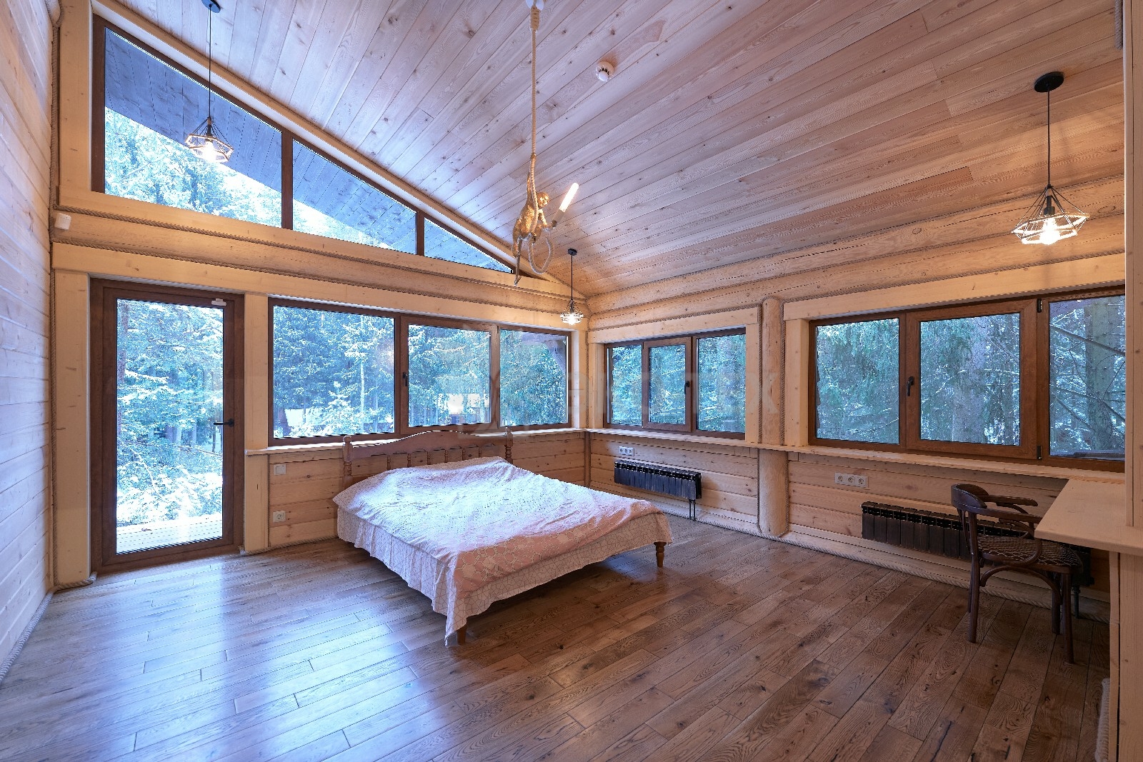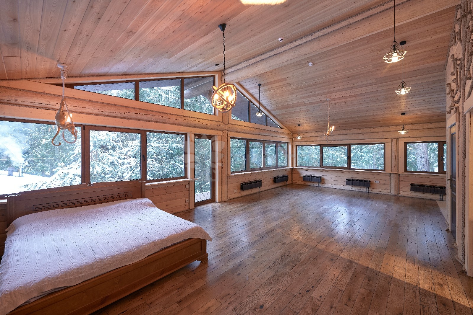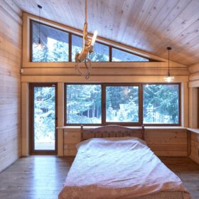 Объединяет все помещения первого этажа гостиная, блистающая всеми оттенками богатства и роскоши. Здесь всё продумано так, чтобы каждый мог насладиться незабываемым отдыхом: это и живой огонь камина, придающий непередаваемую атмосферу зимним вечерам, и окна, сделанные в стиле «второй свет», которые всегда пленяют красотой и полным погружением в окружающий пейзаж. Мягкие диваны с авторским текстилем и необычные кресла придутся по вкусу, как гостям, так и хозяевам.