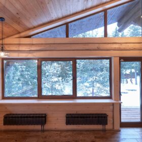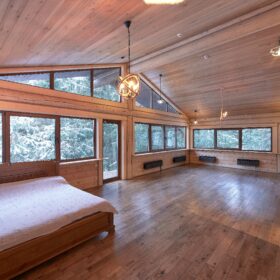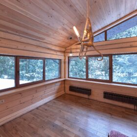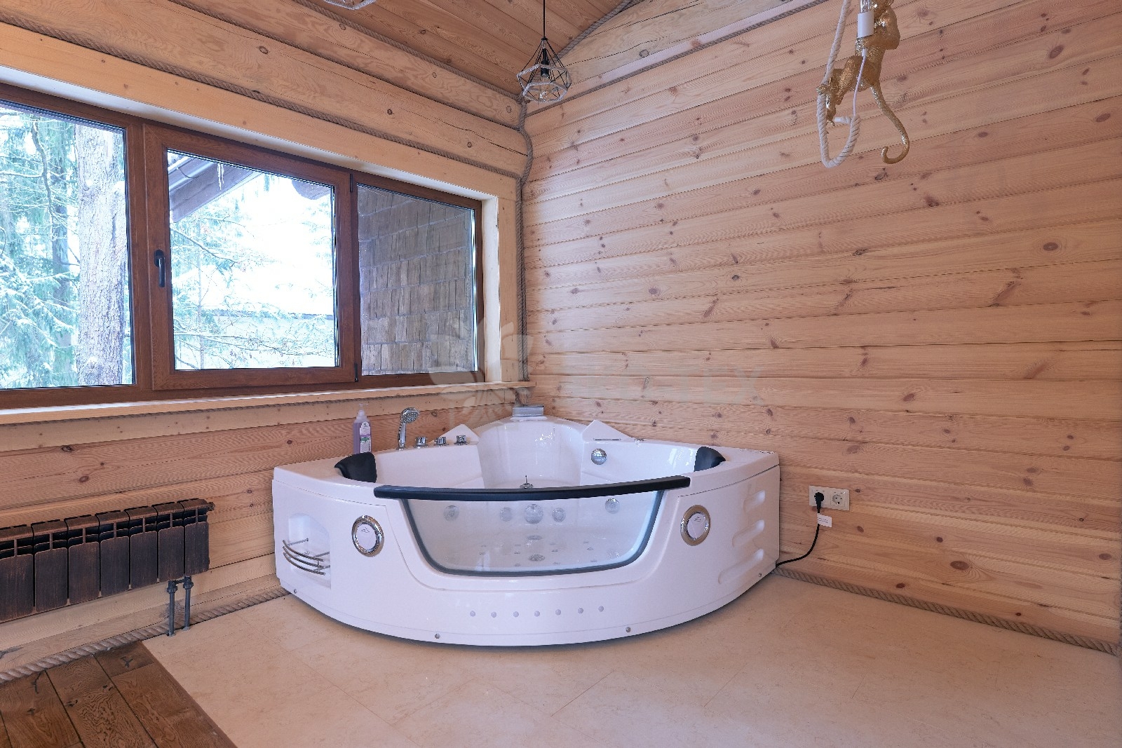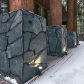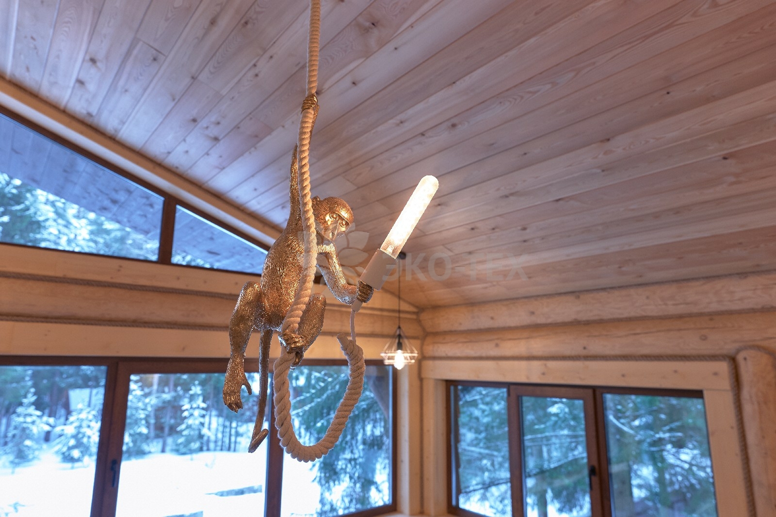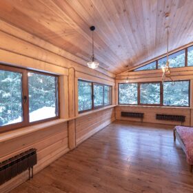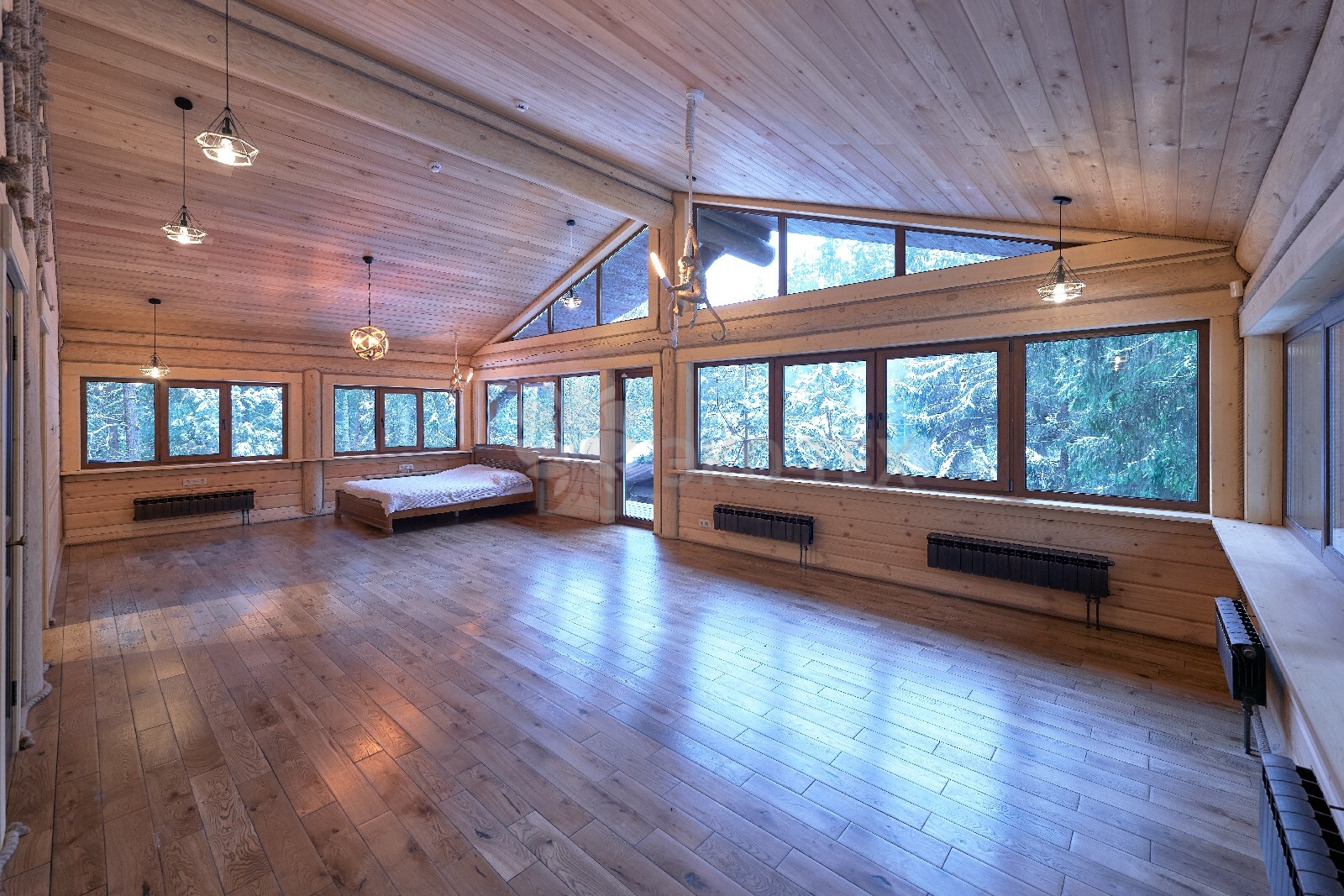 Объединяет все помещения первого этажа гостиная, блистающая всеми оттенками богатства и роскоши. Здесь всё продумано так, чтобы каждый мог насладиться незабываемым отдыхом: это и живой огонь камина, придающий непередаваемую атмосферу зимним вечерам, и окна, сделанные в стиле «второй свет», которые всегда пленяют красотой и полным погружением в окружающий пейзаж. Мягкие диваны с авторским текстилем и необычные кресла придутся по вкусу, как гостям, так и хозяевам.