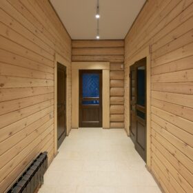 Входя в дом, мы попадаем в удобную прихожую, дополненную помещением гардеробной.