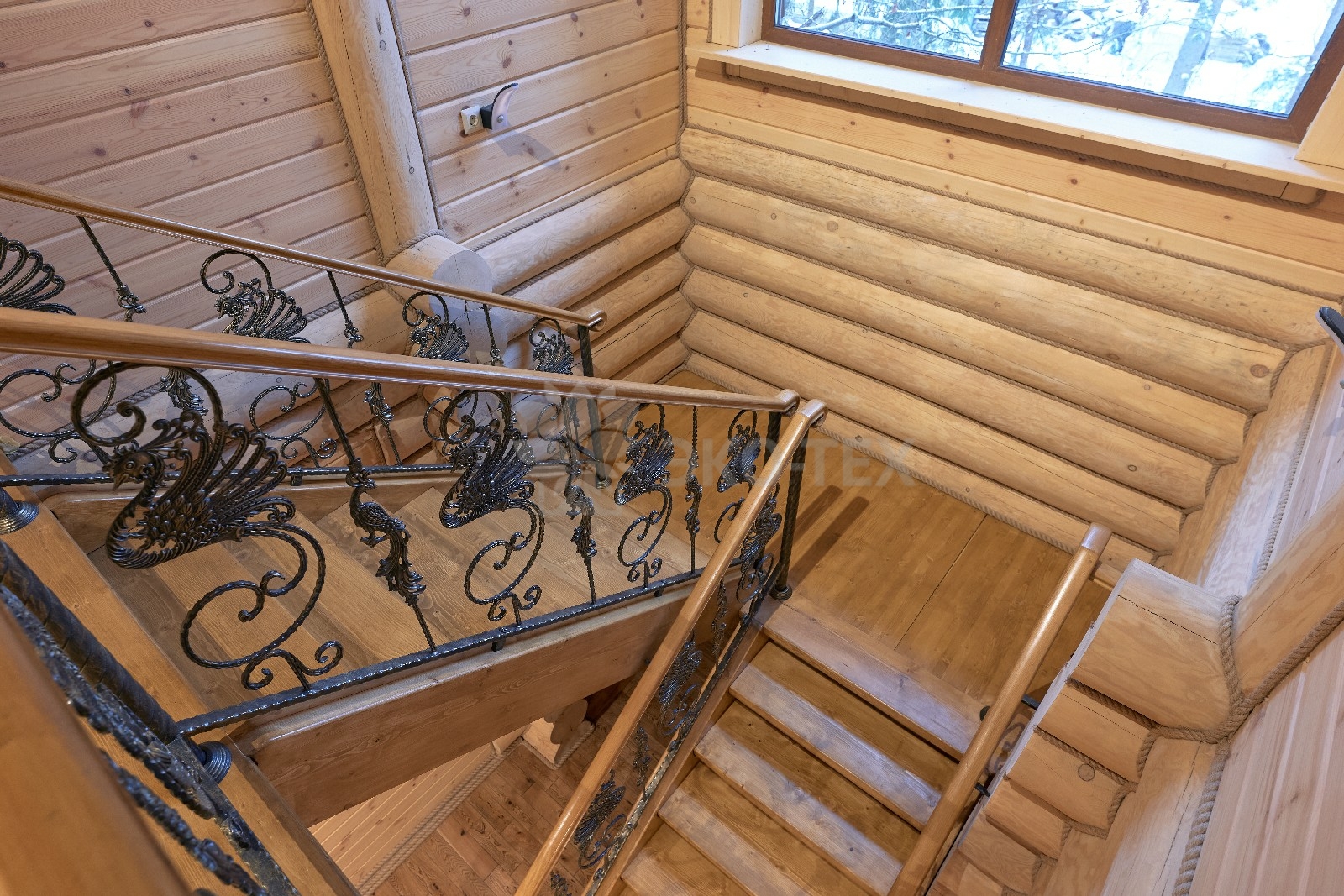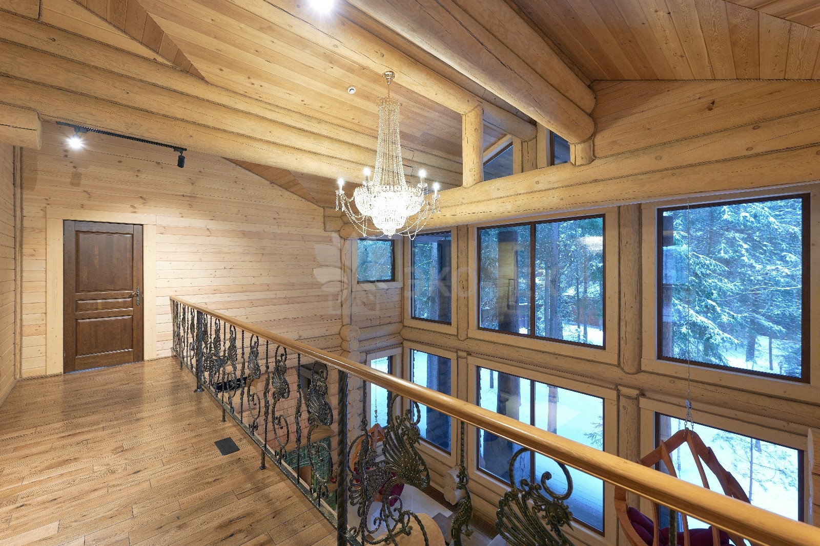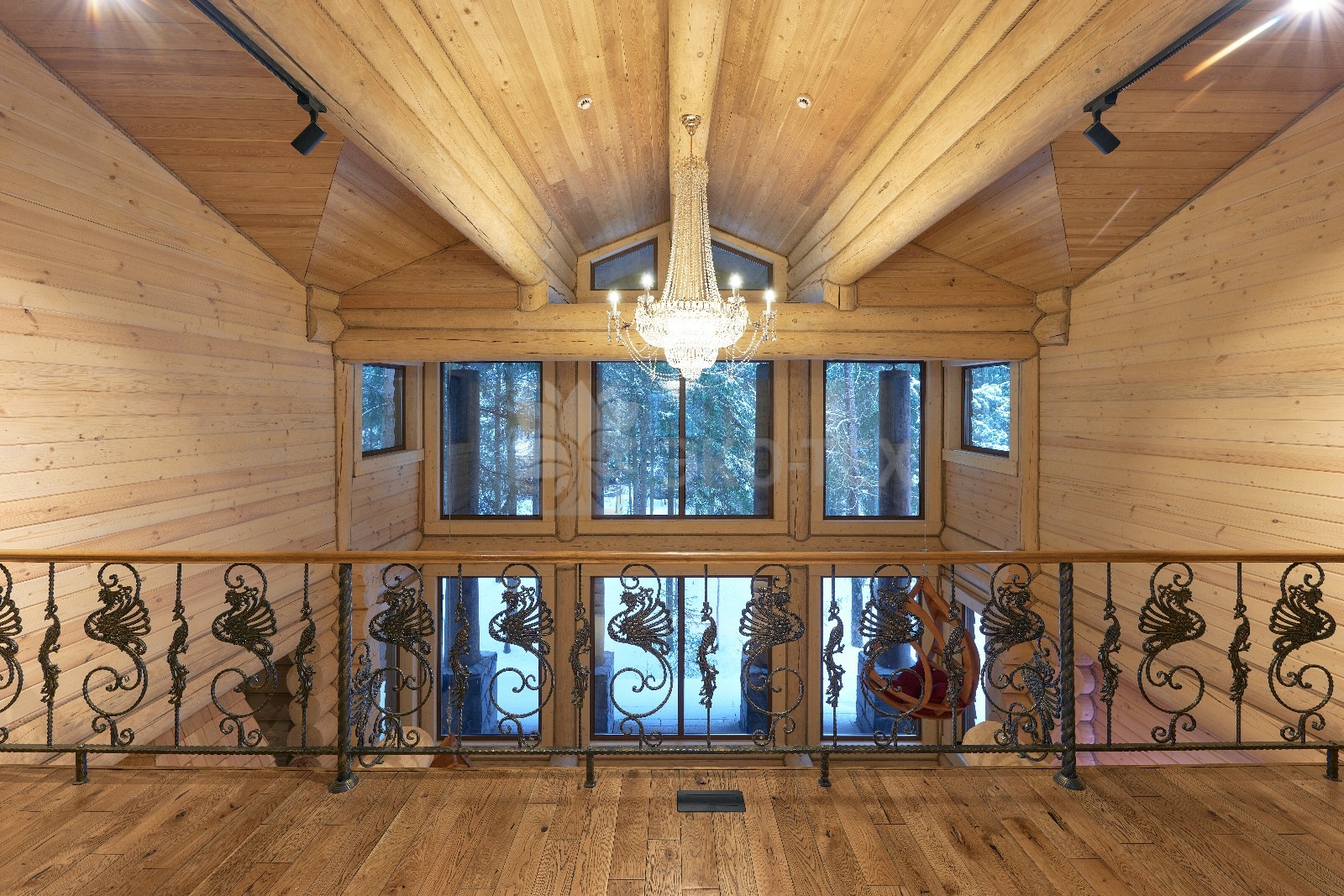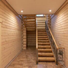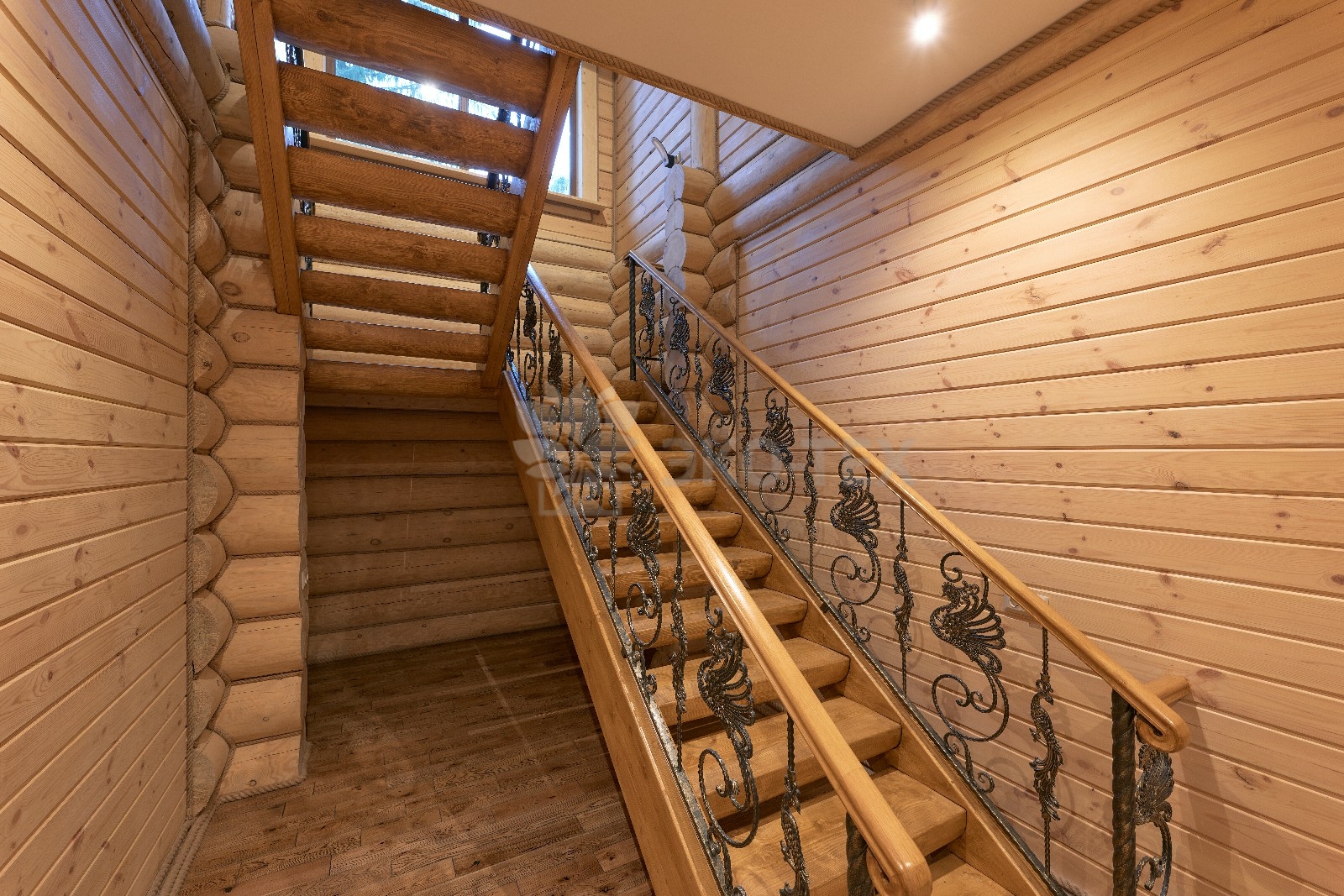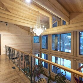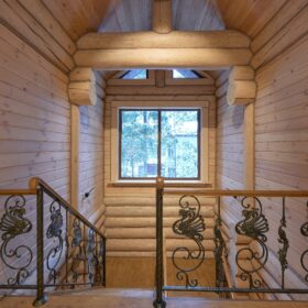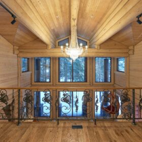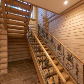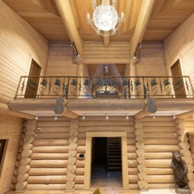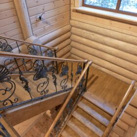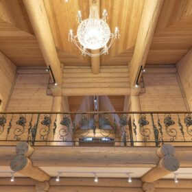 Элементы интерьера представляют собой лучшие воплощения различных стилей: например, кованые ограждения перил и балкона, в сочетании с живым деревом смотрятся изысканно — воздушно, при этом подчёркнуто благородно.