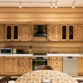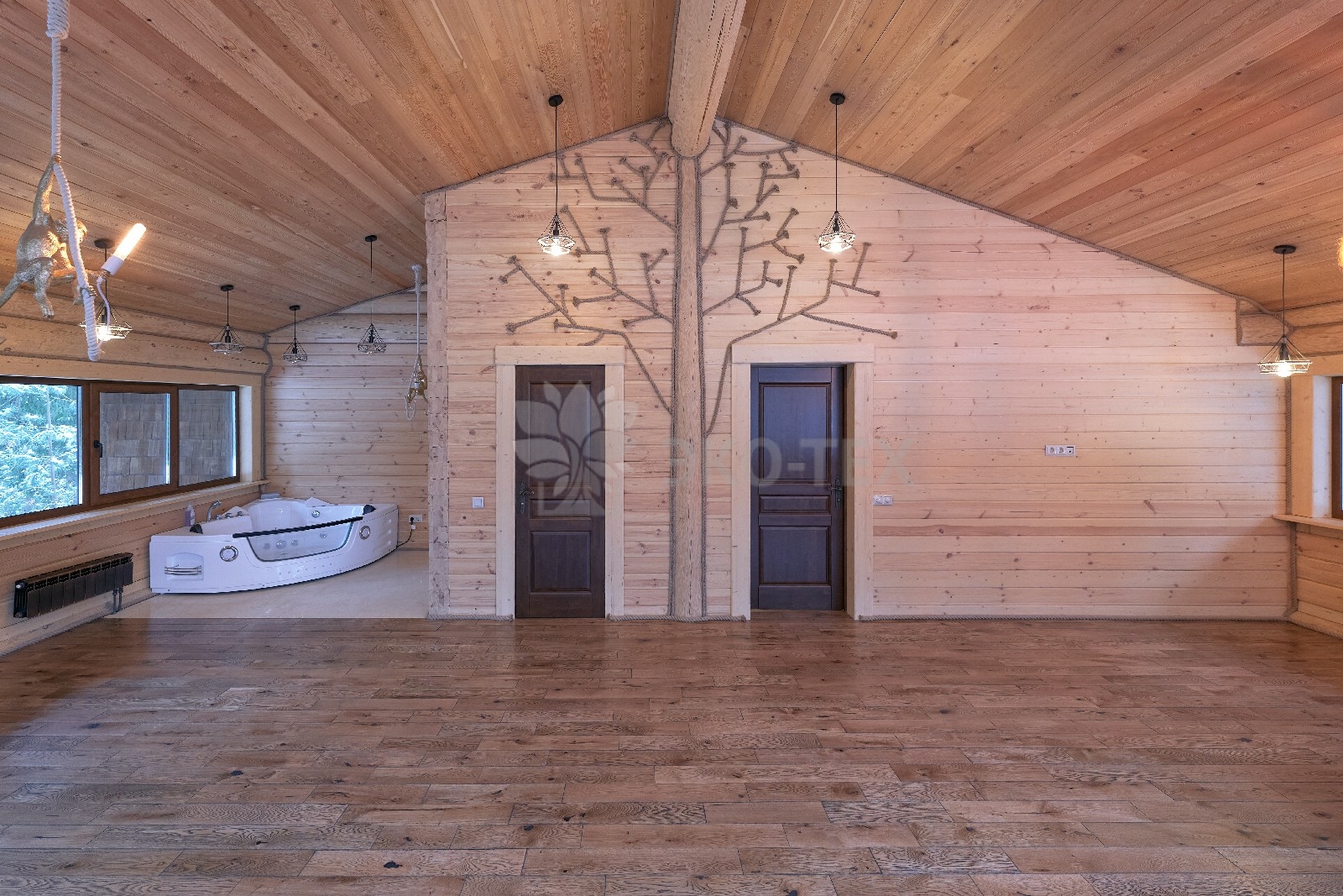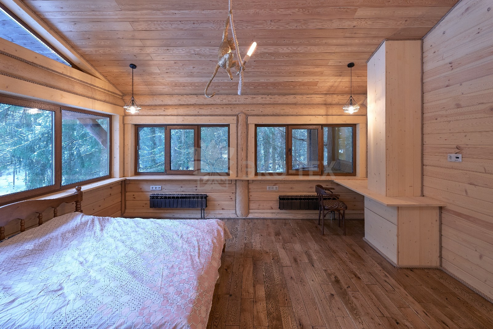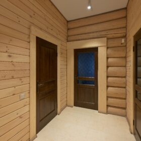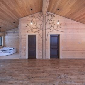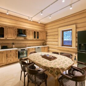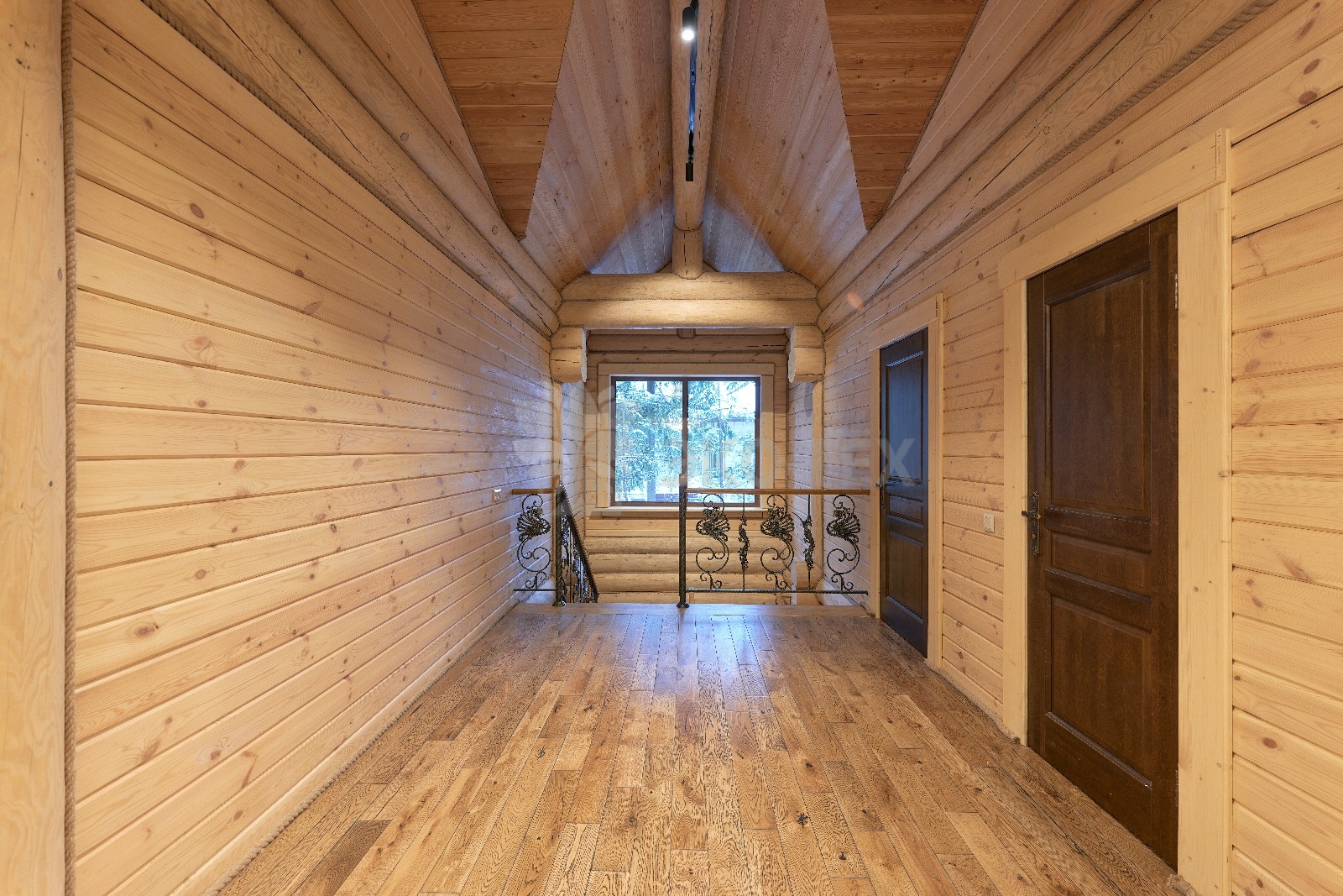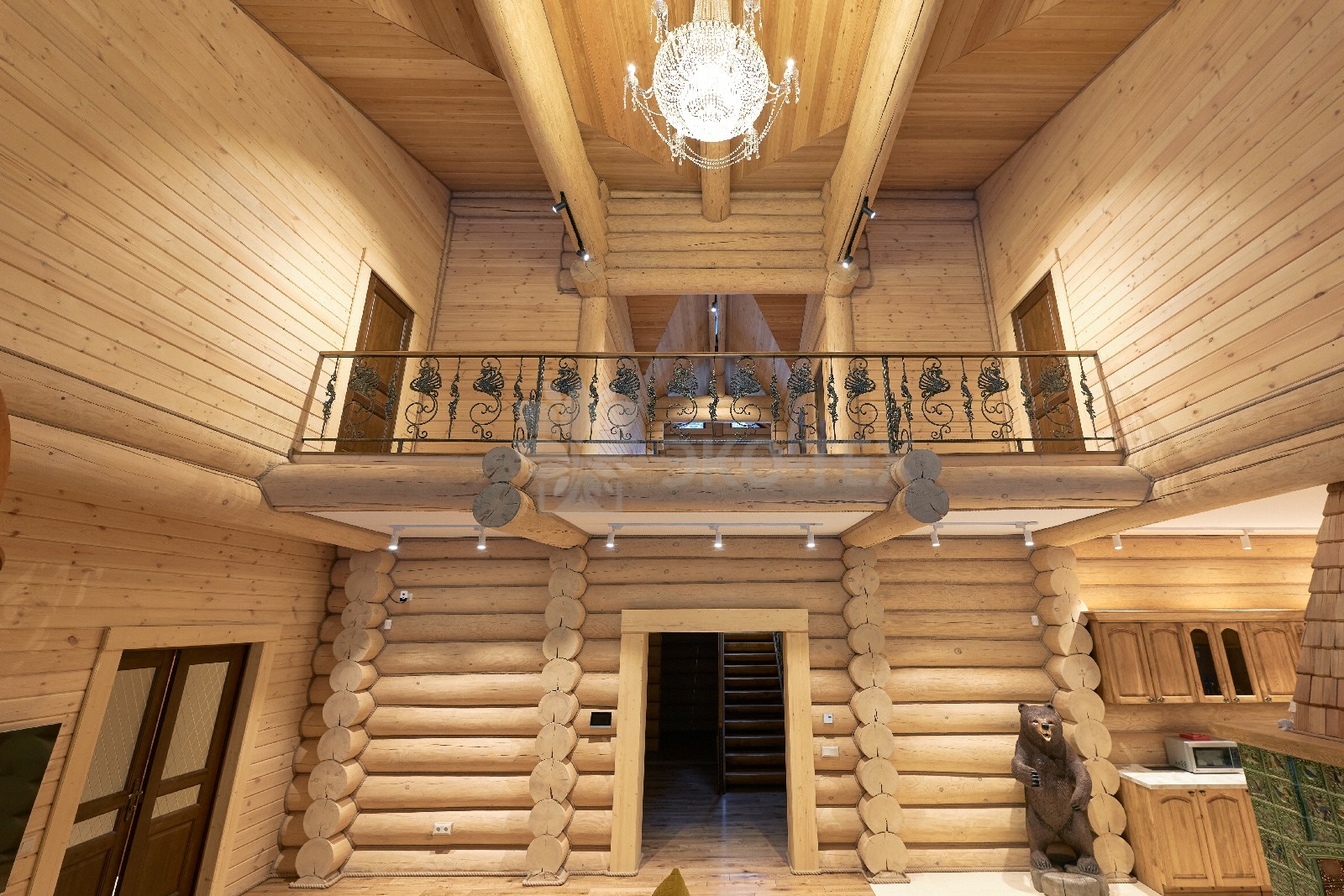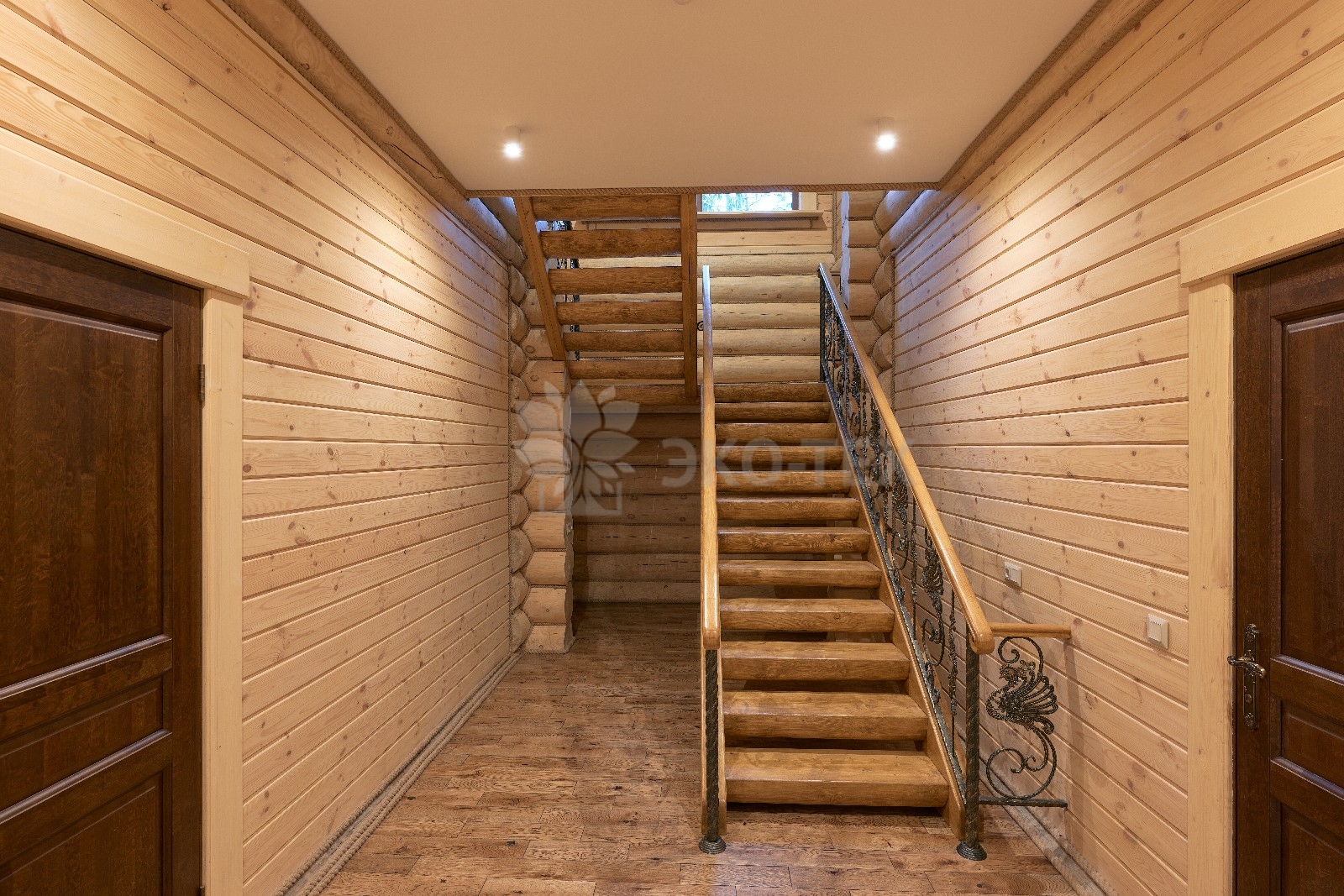 Элементы интерьера представляют собой лучшие воплощения различных стилей: например, кованые ограждения перил и балкона, в сочетании с живым деревом смотрятся изысканно — воздушно, при этом подчёркнуто благородно.