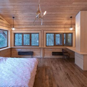 В этой же зоне находится жилая комната, которую можно использовать в качестве спальни для гостей или при желании оборудовать в ней рабочий кабинет.