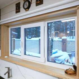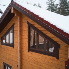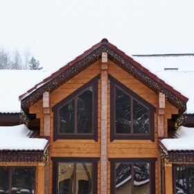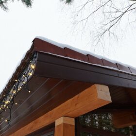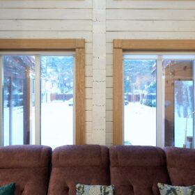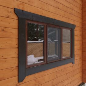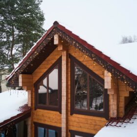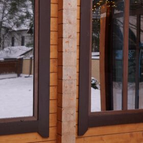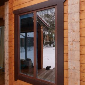 Снаружи дом украшают большие окна, который имеют выразительную нестандартную геометрию. Благородный тёмно-коричневый профиль отлично дополняет фасад из клеёного бруса.