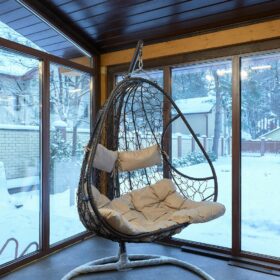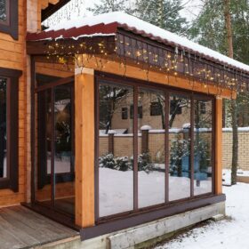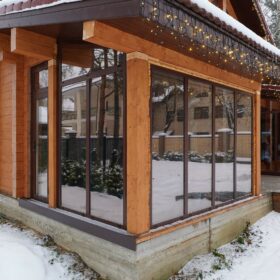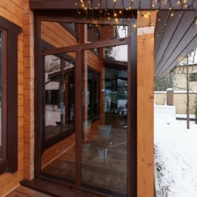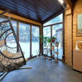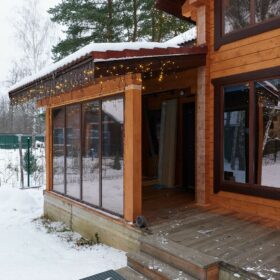 В доме предусмотрены два входа, один из которых ведёт в основное здание, второй — на просторную, уютную террасу, которая, в любое время года, неизменно является укромным уголком, который, за счёт панорамного остекления, дарит слияние с природой. Это прекрасное место для отдыха или семейной беседы за чашечкой ароматного чая.