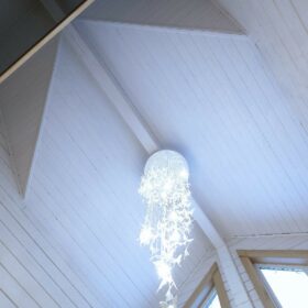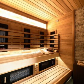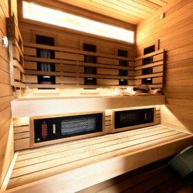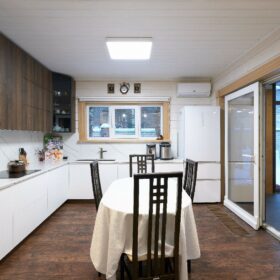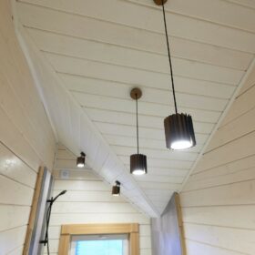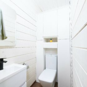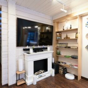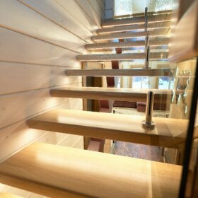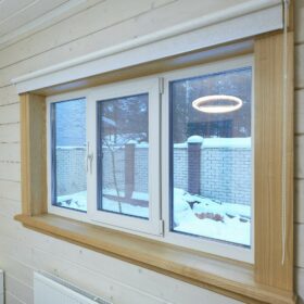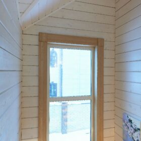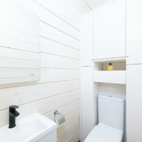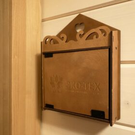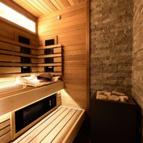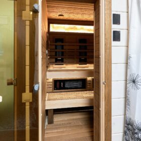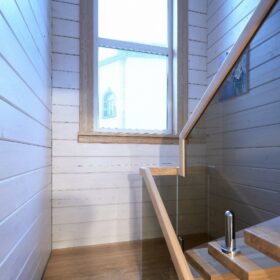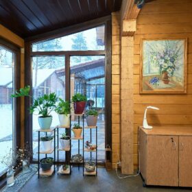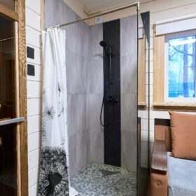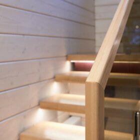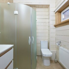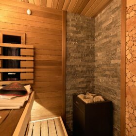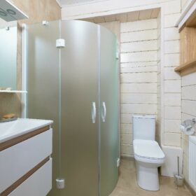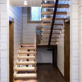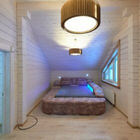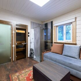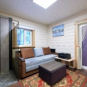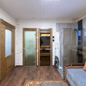 В противоположном углу первого этажа расположена жилая комната, которая может играть роль рабочего кабинета или спальни. В доме имеется сауна, оснащённая широкими полками, подсветкой и каменной печью.