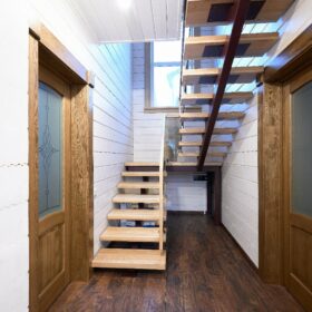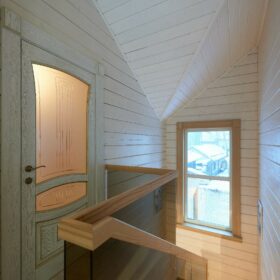 Лестница, состоящая из двух пролётов, ведёт нас на второй этаж. Здесь находятся три жилые комнаты, имеющие разную площадь. Они могут быть использованы в качестве спален, гостевых или детских. Комнаты объединены общим холлом. На втором этаже имеется отдельный санузел с современной сантехникой.