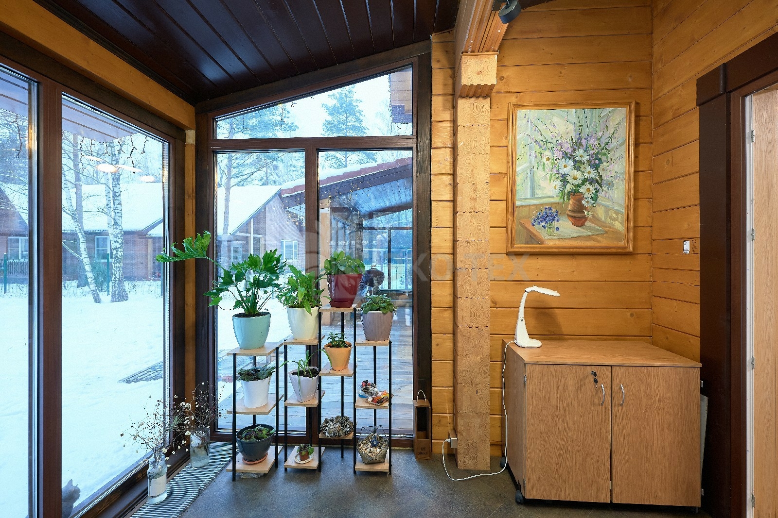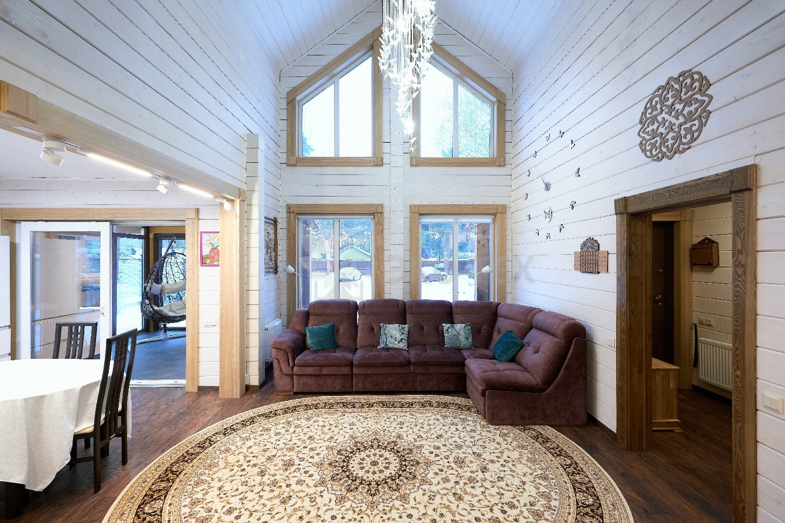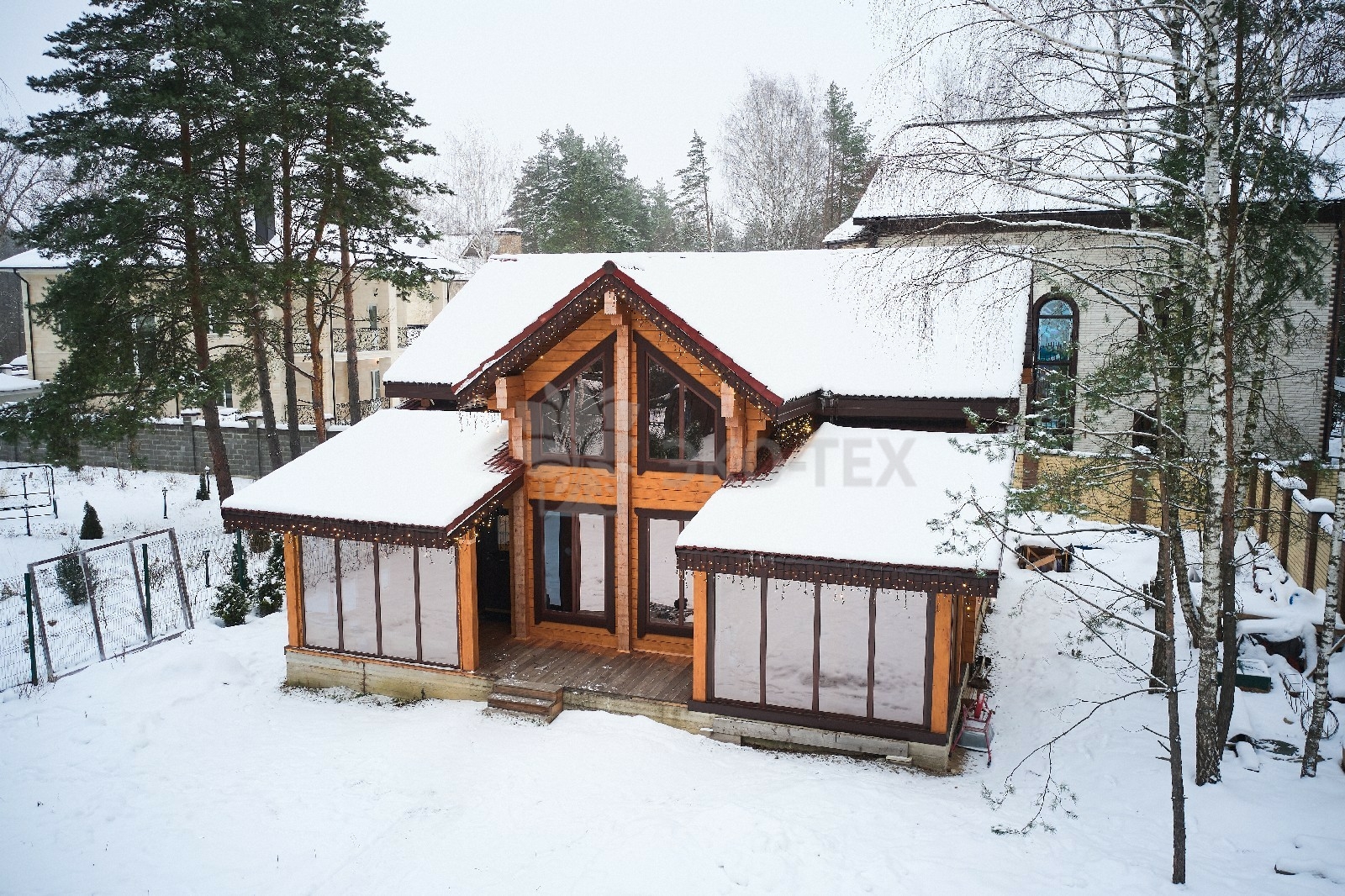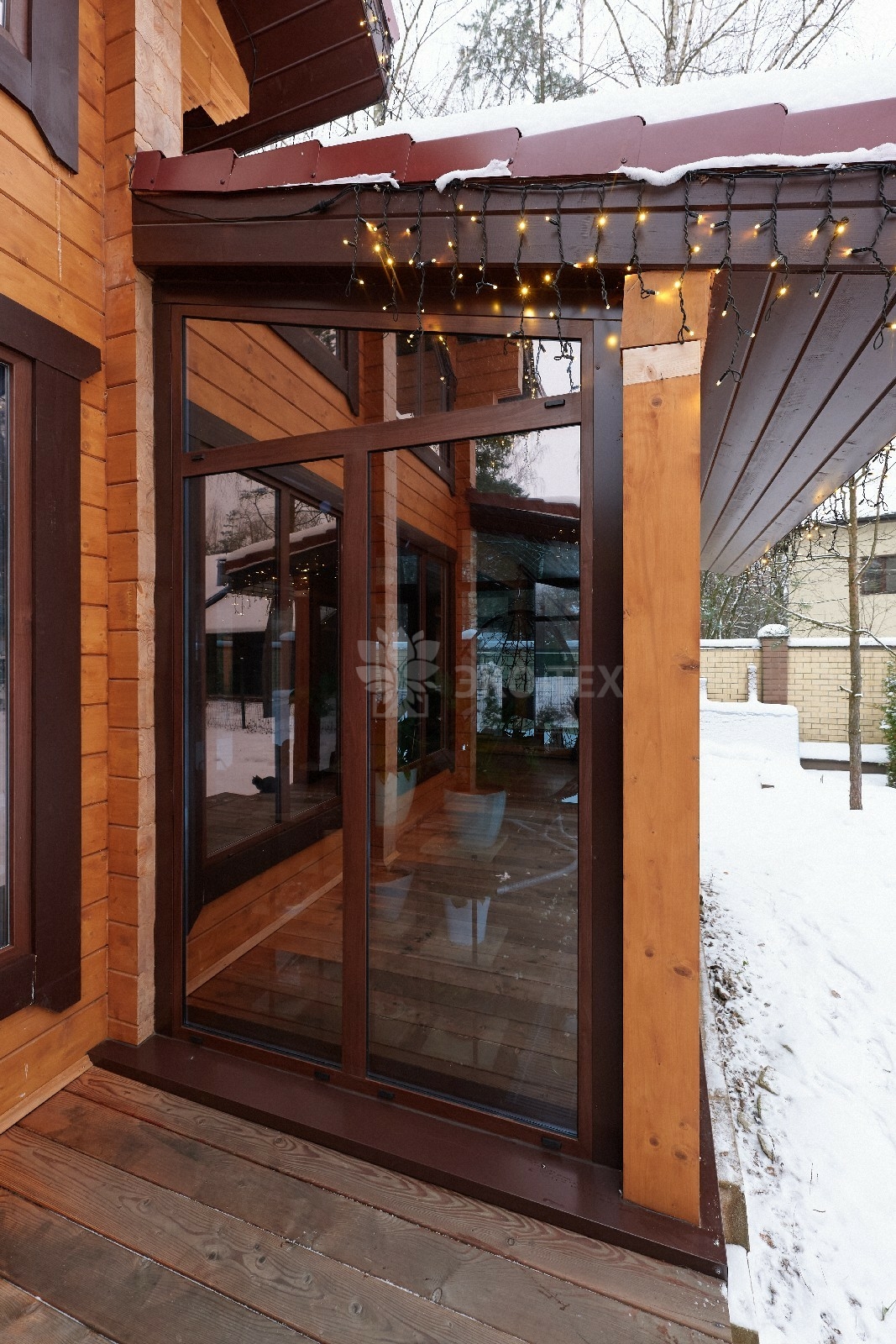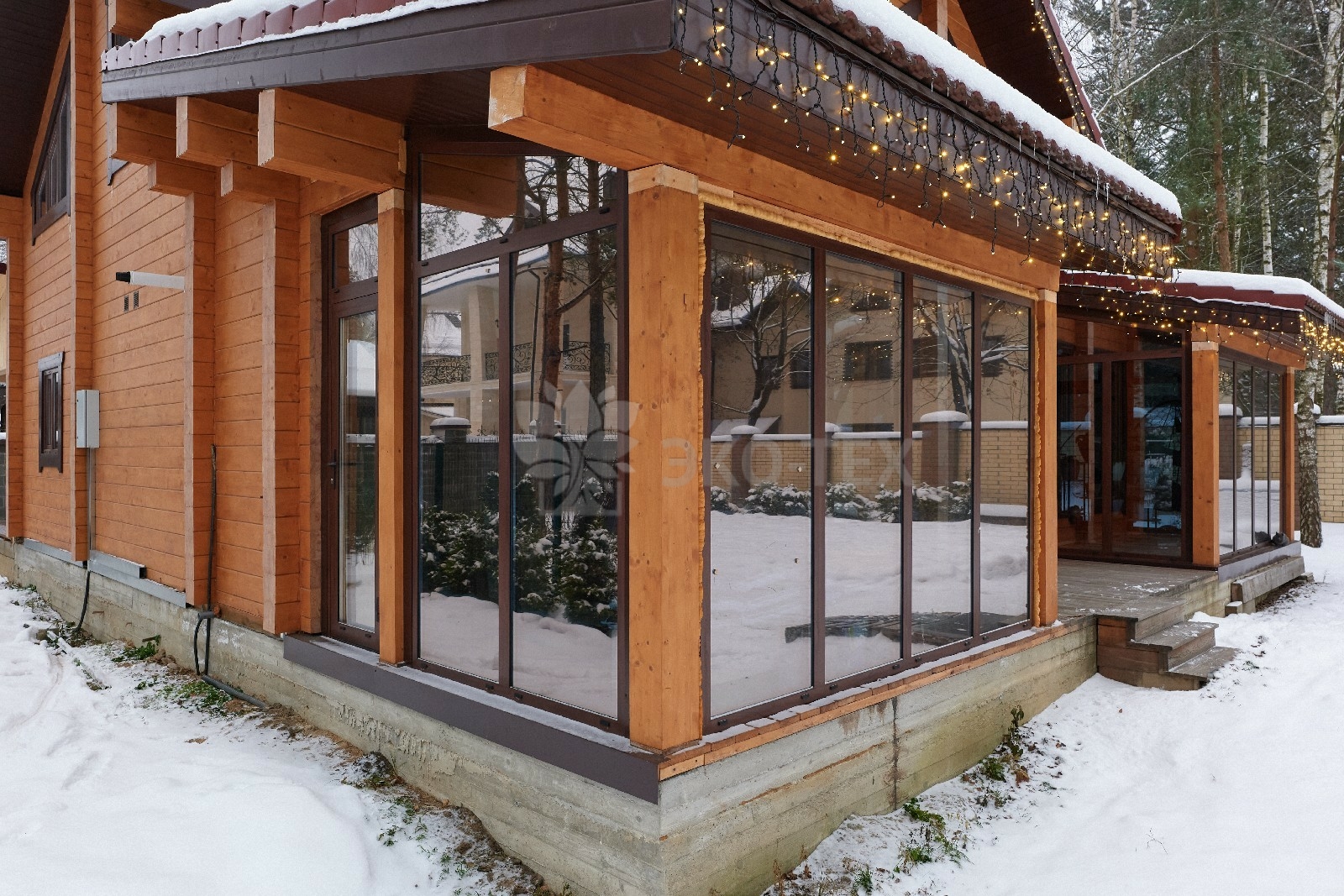 В доме предусмотрены два входа, один из которых ведёт в основное здание, второй — на просторную, уютную террасу, которая, в любое время года, неизменно является укромным уголком, который, за счёт панорамного остекления, дарит слияние с природой. Это прекрасное место для отдыха или семейной беседы за чашечкой ароматного чая.