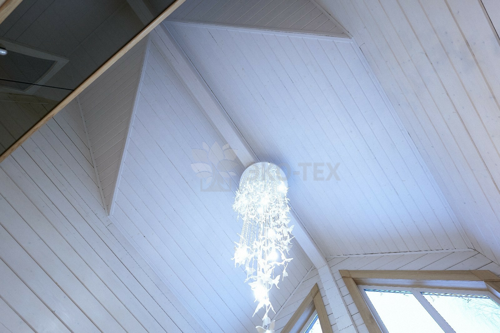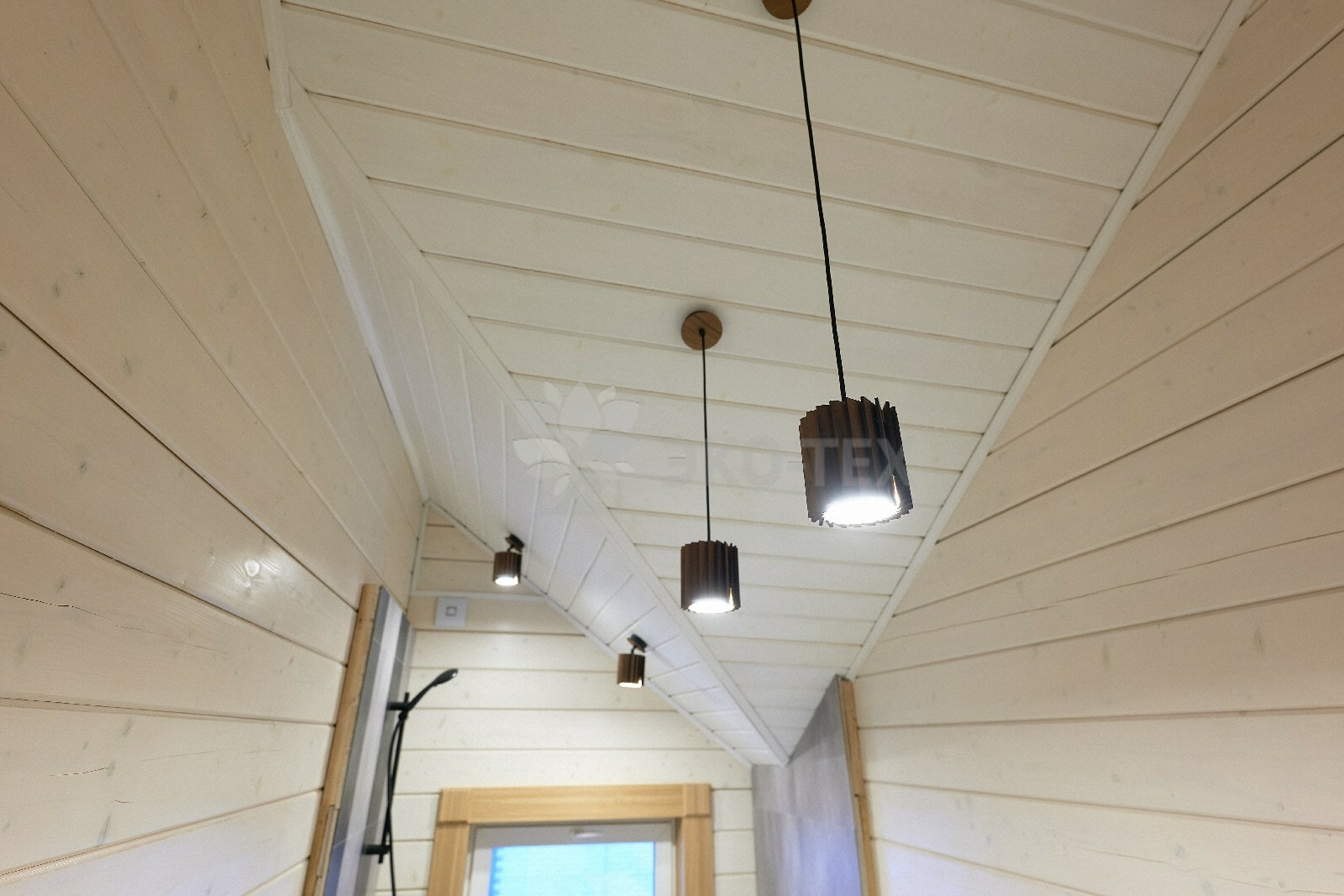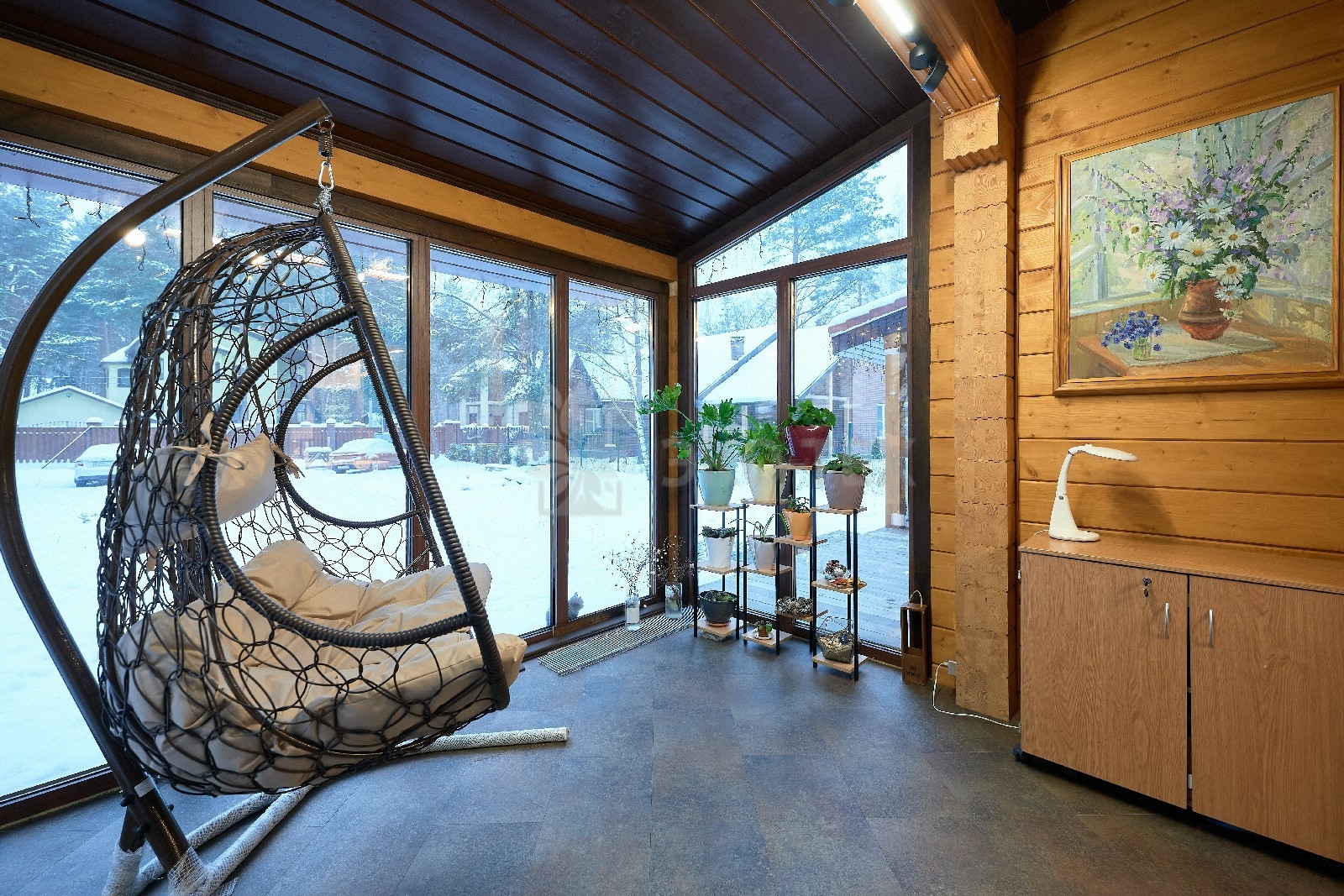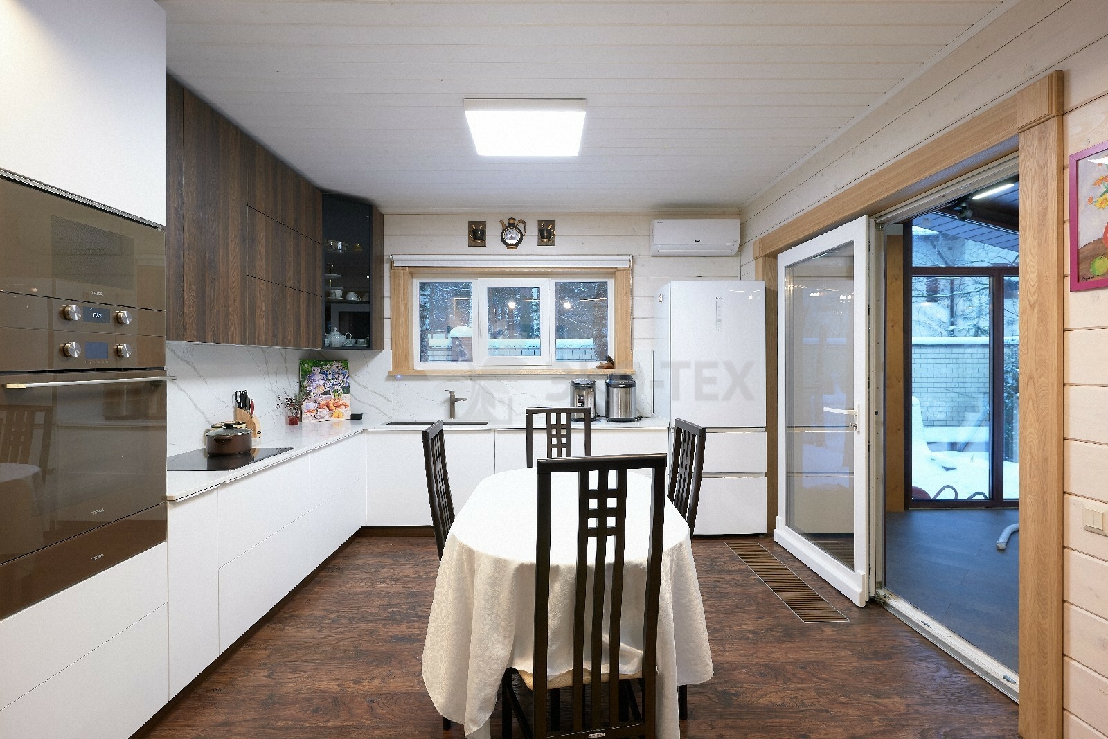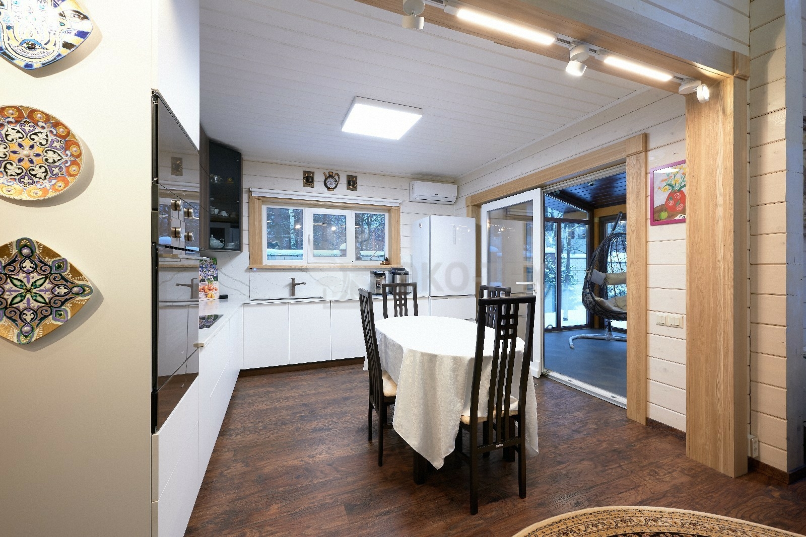 В доме предусмотрены два входа, один из которых ведёт в основное здание, второй — на просторную, уютную террасу, которая, в любое время года, неизменно является укромным уголком, который, за счёт панорамного остекления, дарит слияние с природой. Это прекрасное место для отдыха или семейной беседы за чашечкой ароматного чая.