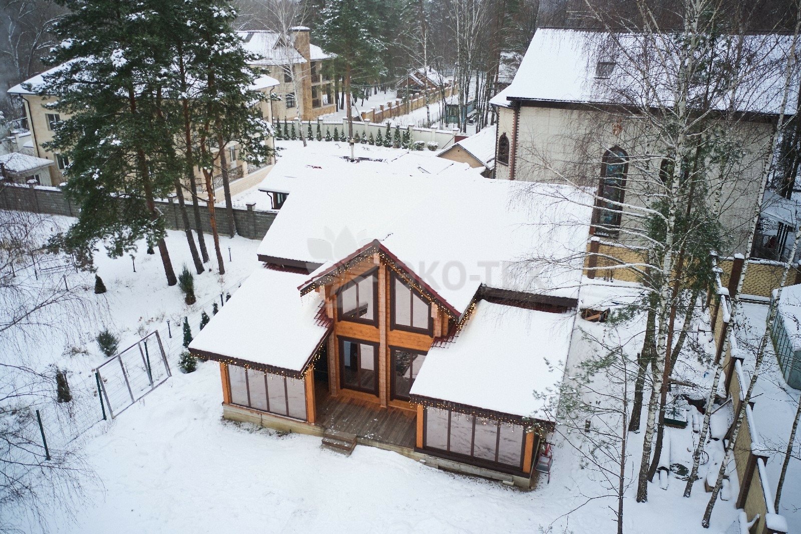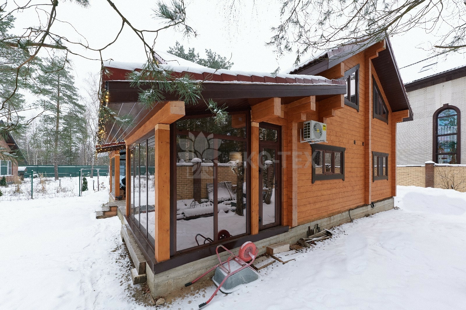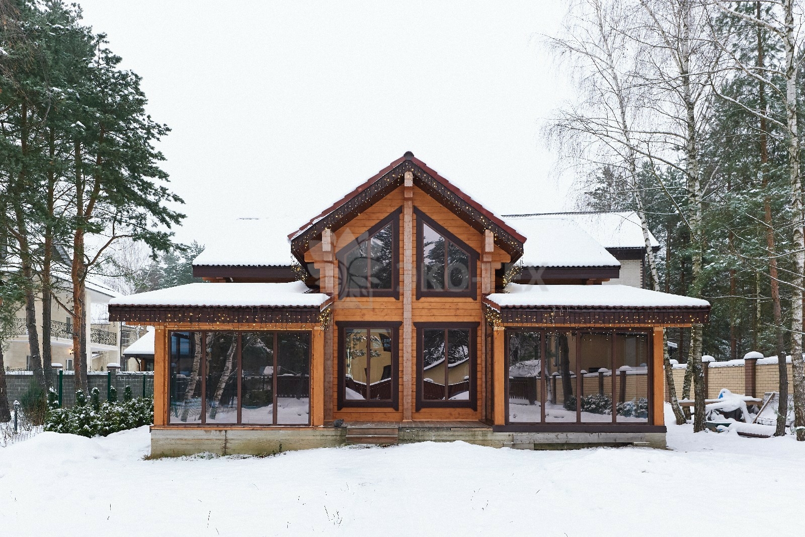 Дом построен из клеёного бруса, качество которого соответствует самым высоким стандартам. Это утверждение основано на том, что на протяжении многих лет мы являемся владельцами собственного производства, на котором осуществляется полный цикл деревообработки — от заготовки леса до формирования готовых домокомплектов.