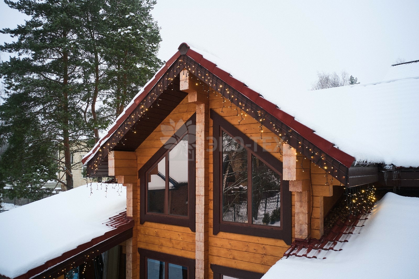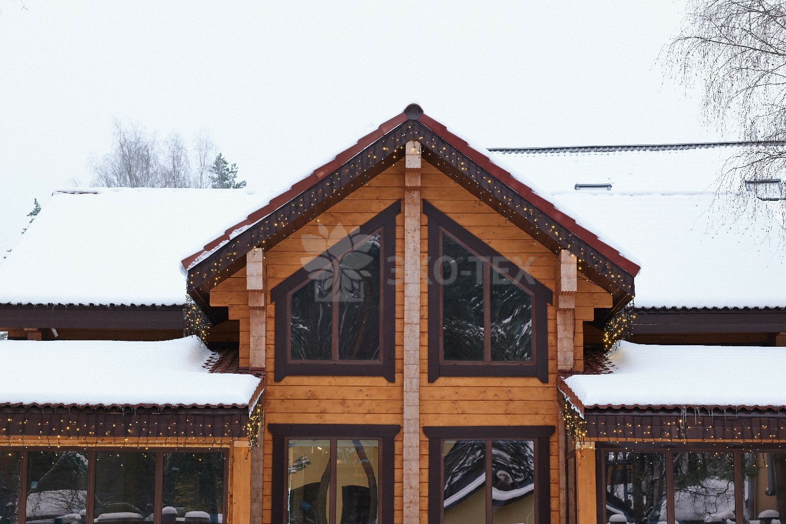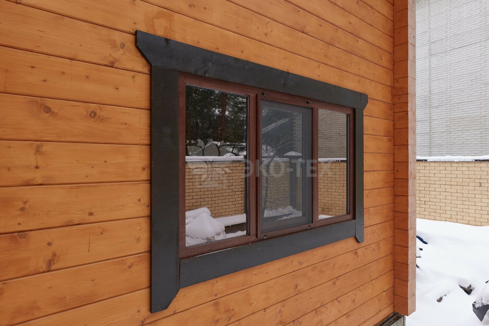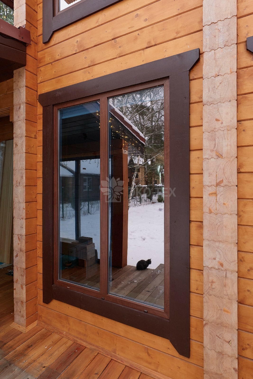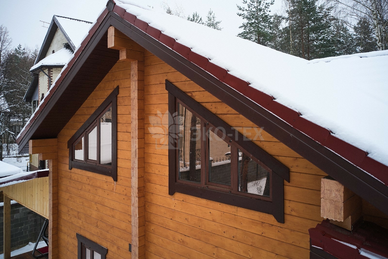 Снаружи дом украшают большие окна, который имеют выразительную нестандартную геометрию. Благородный тёмно-коричневый профиль отлично дополняет фасад из клеёного бруса.