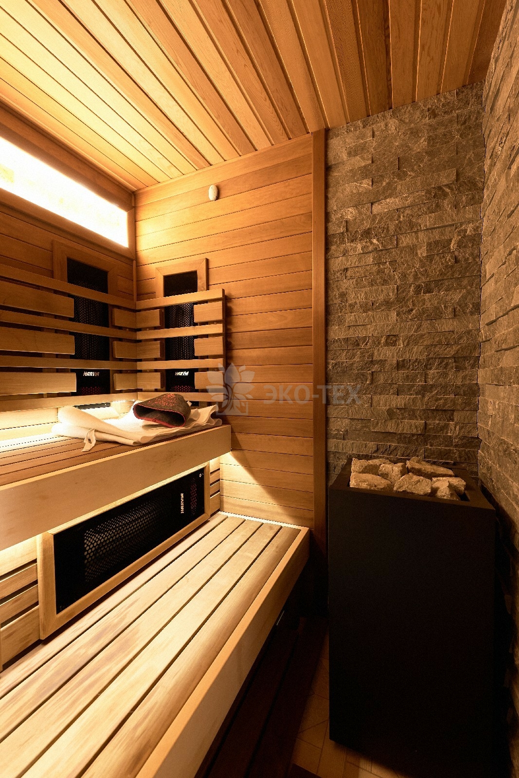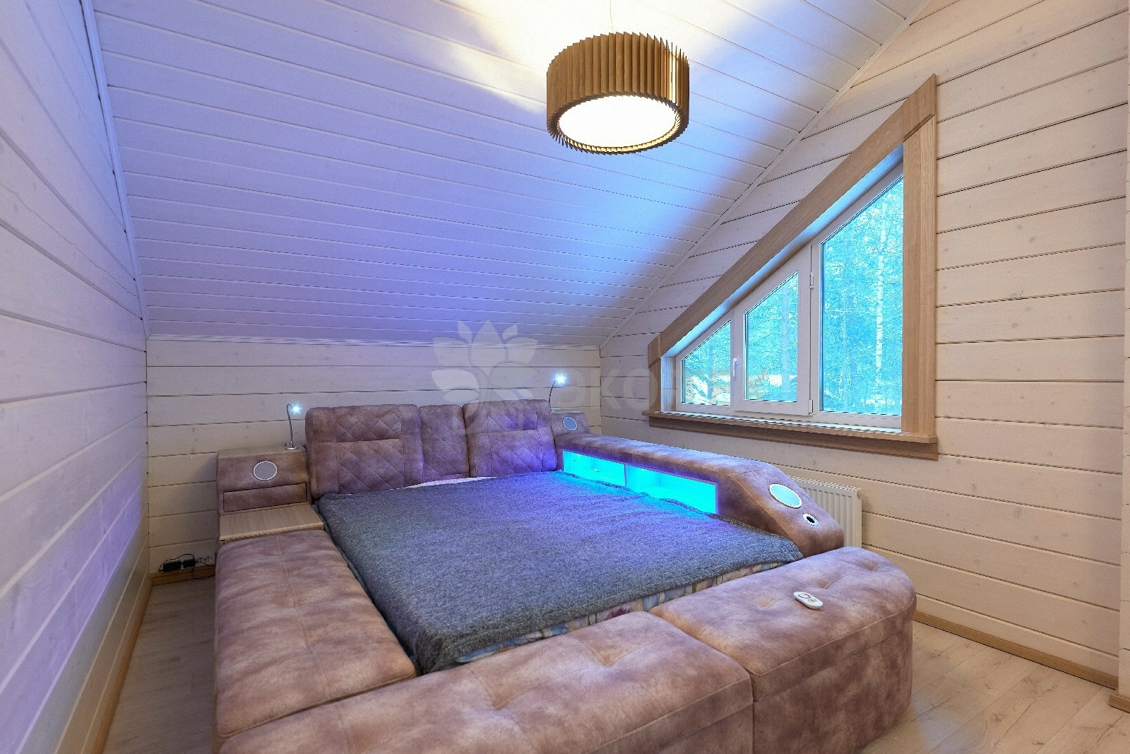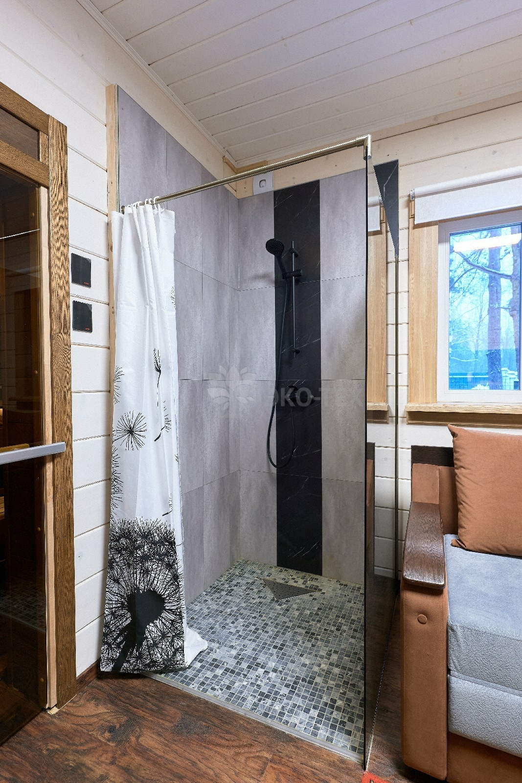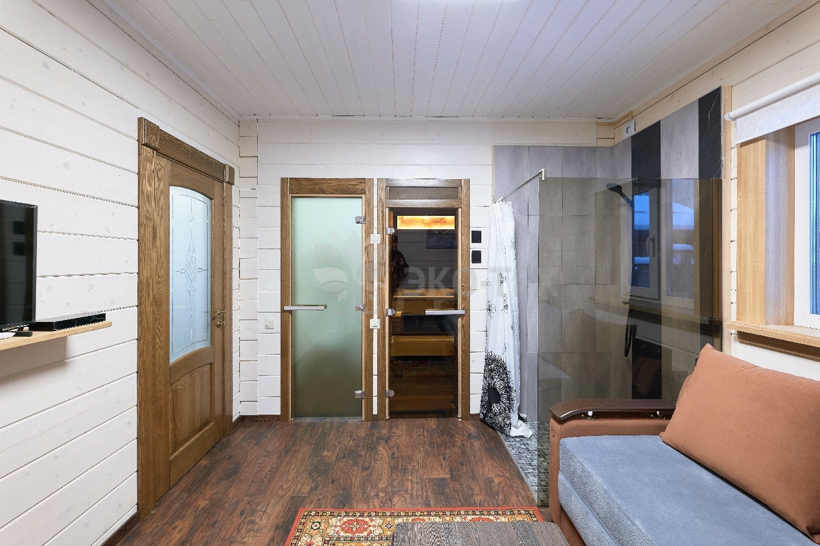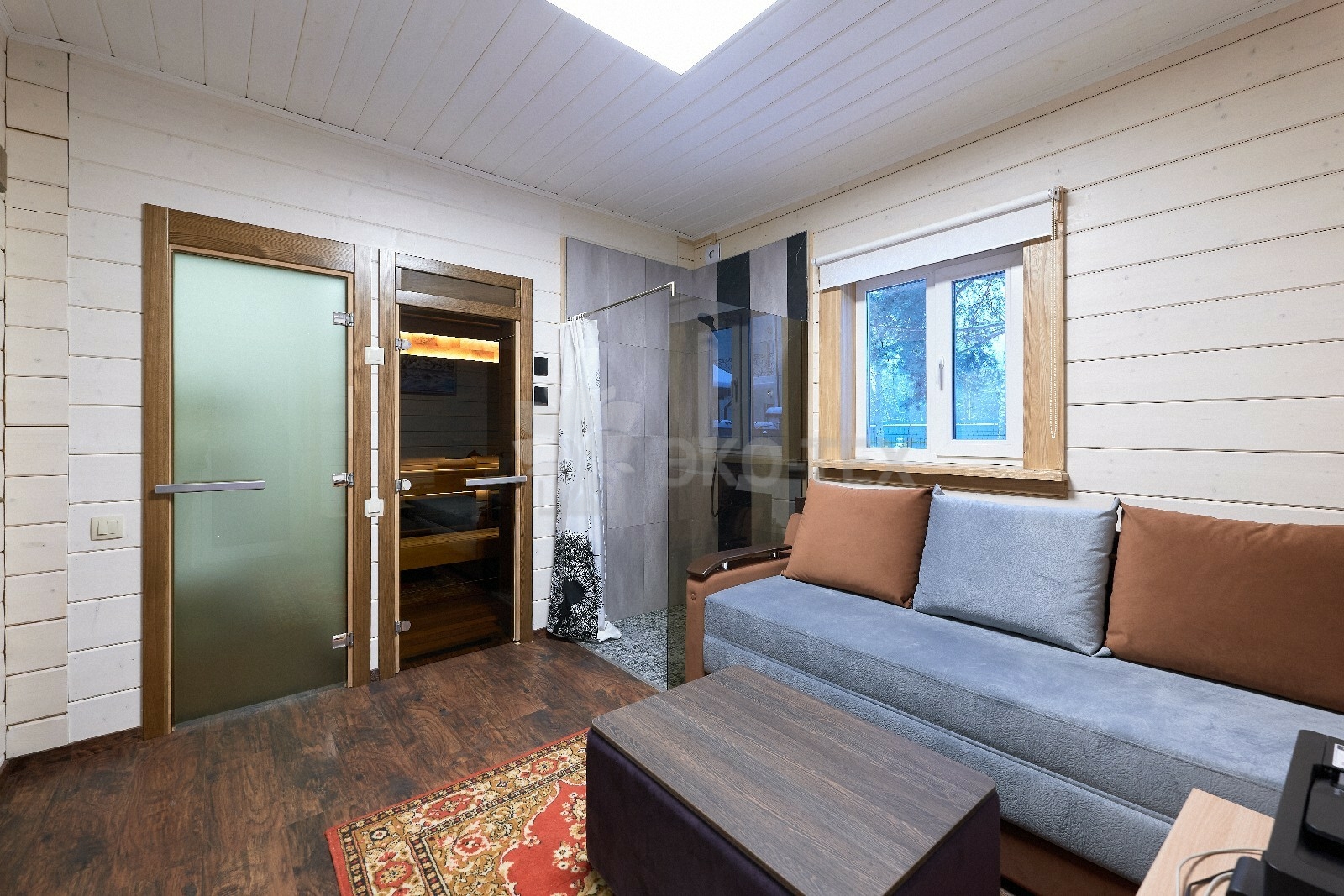 В противоположном углу первого этажа расположена жилая комната, которая может играть роль рабочего кабинета или спальни. В доме имеется сауна, оснащённая широкими полками, подсветкой и каменной печью.