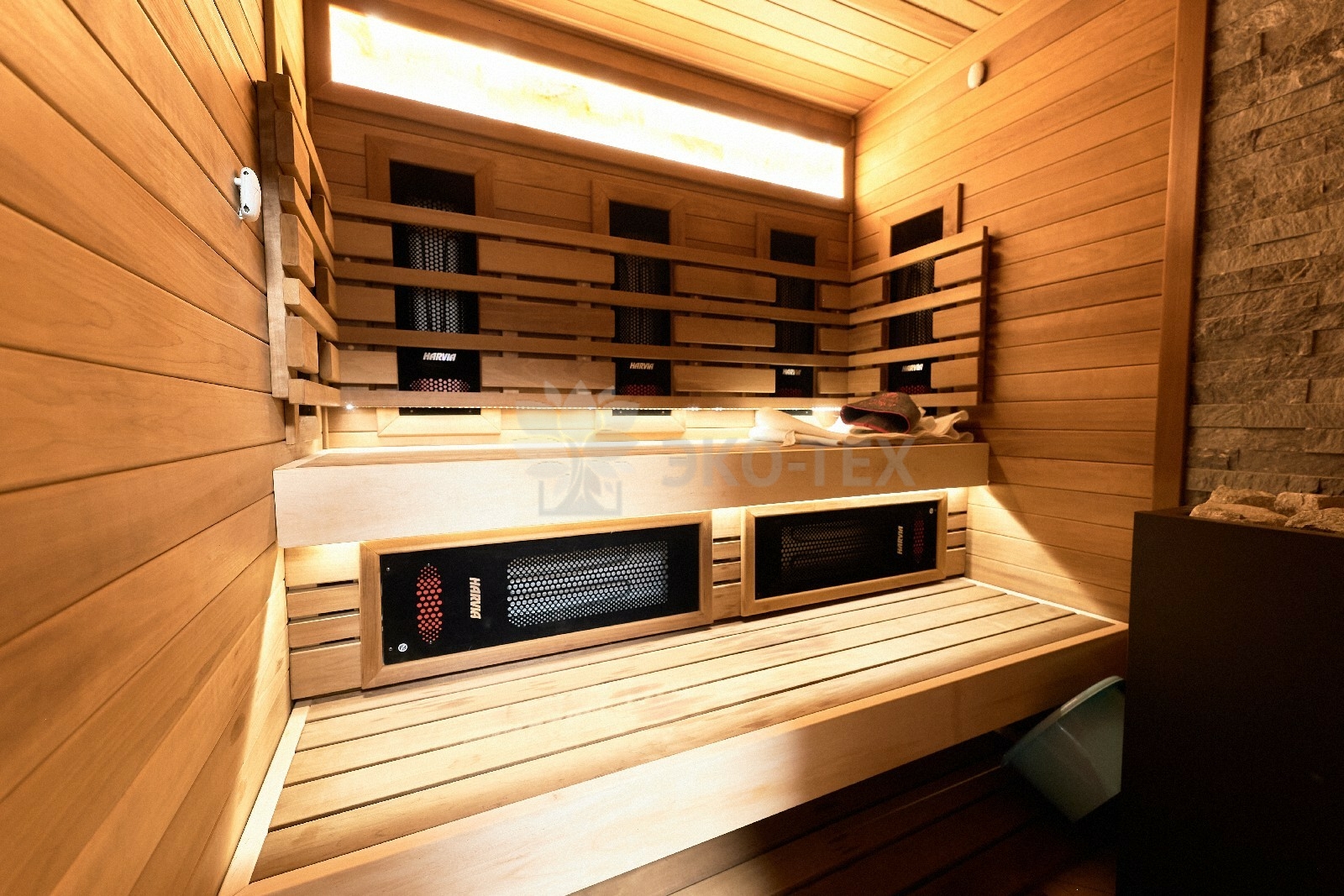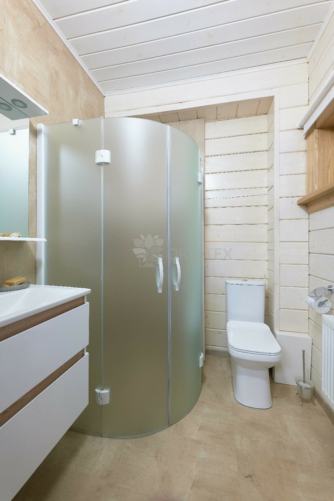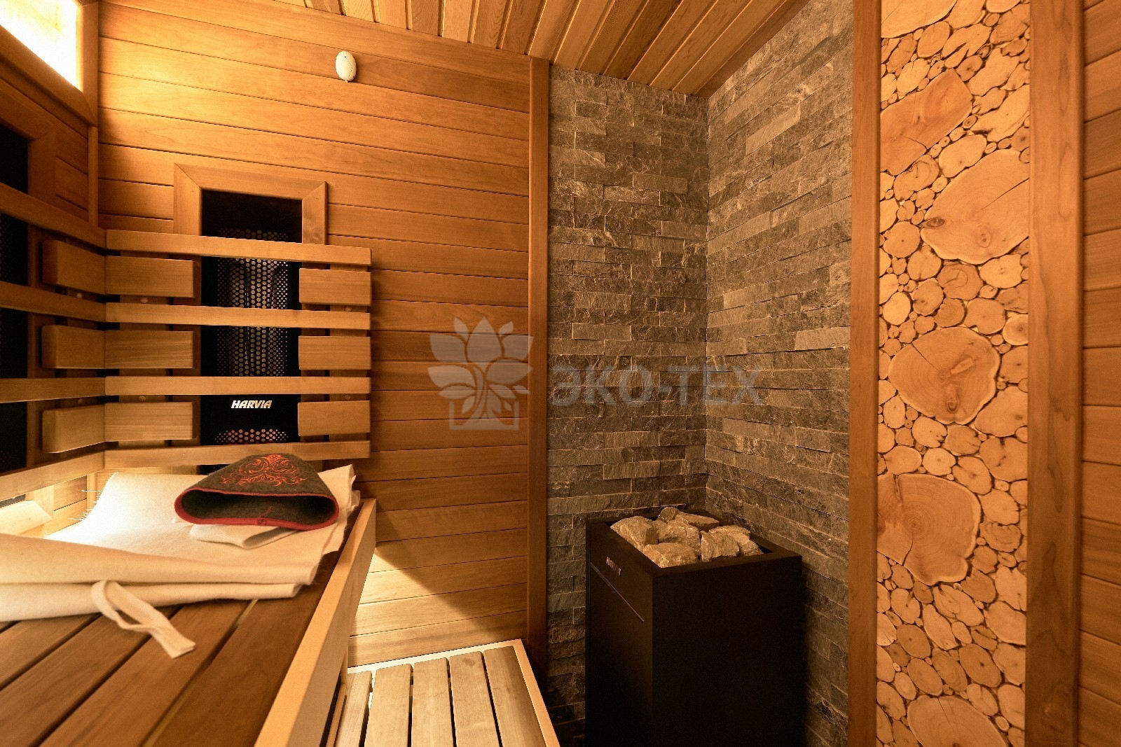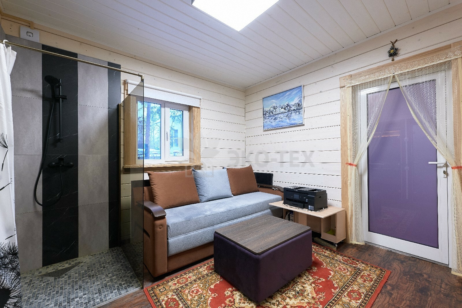 В противоположном углу первого этажа расположена жилая комната, которая может играть роль рабочего кабинета или спальни. В доме имеется сауна, оснащённая широкими полками, подсветкой и каменной печью.