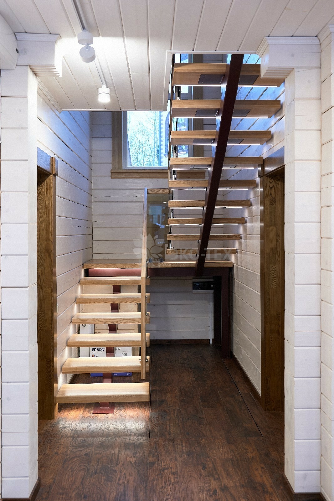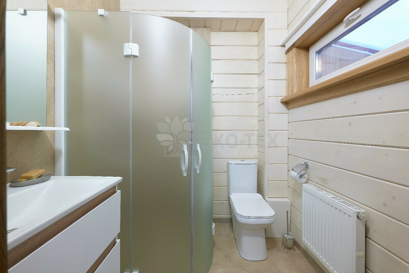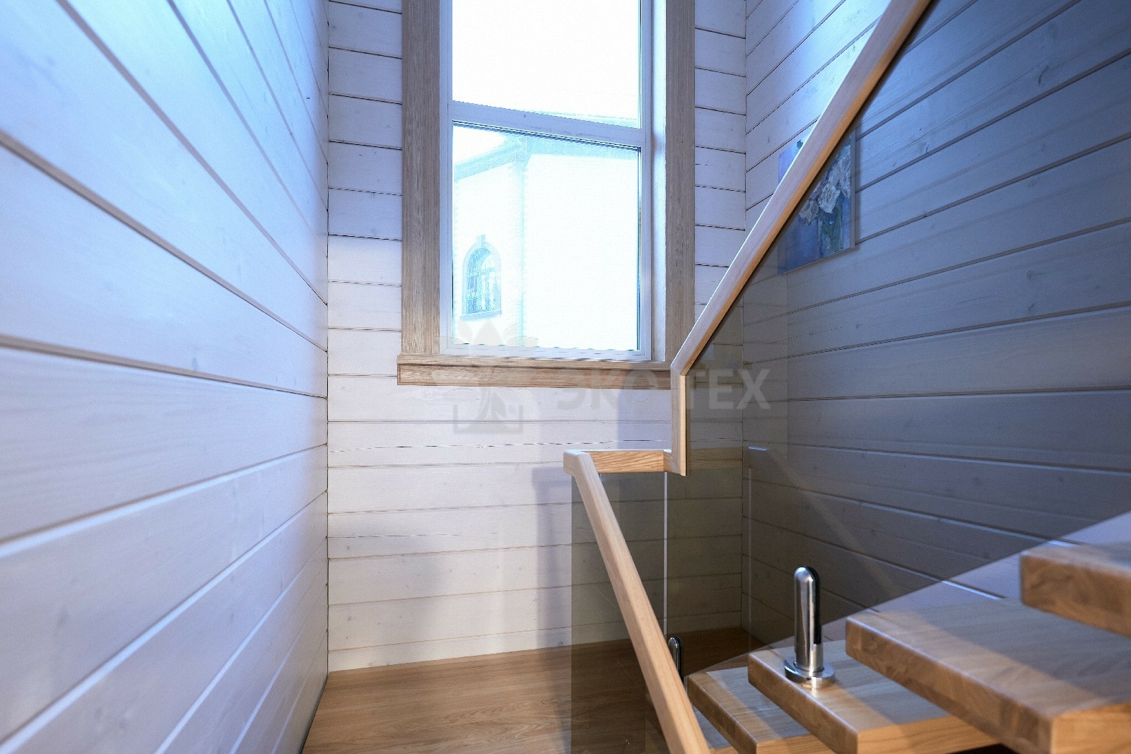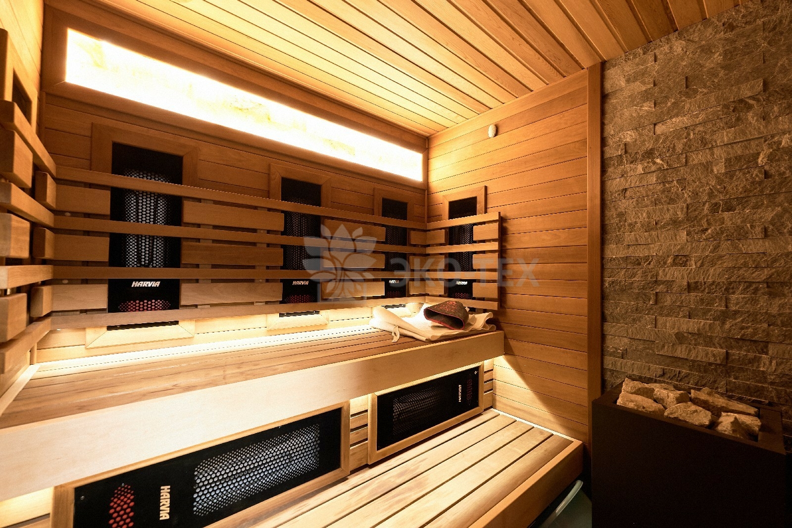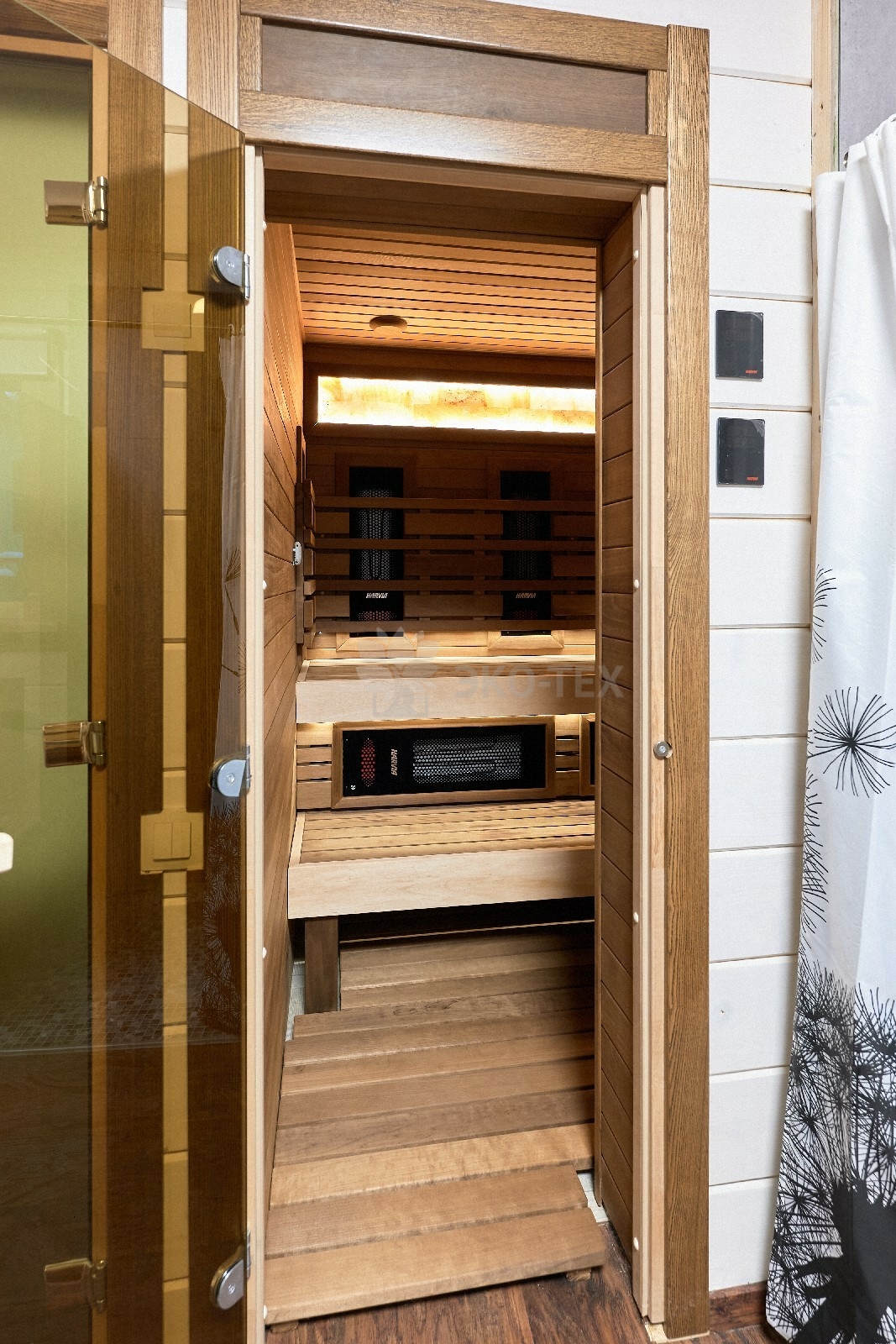 В противоположном углу первого этажа расположена жилая комната, которая может играть роль рабочего кабинета или спальни. В доме имеется сауна, оснащённая широкими полками, подсветкой и каменной печью.