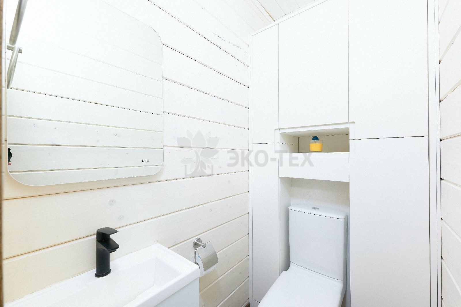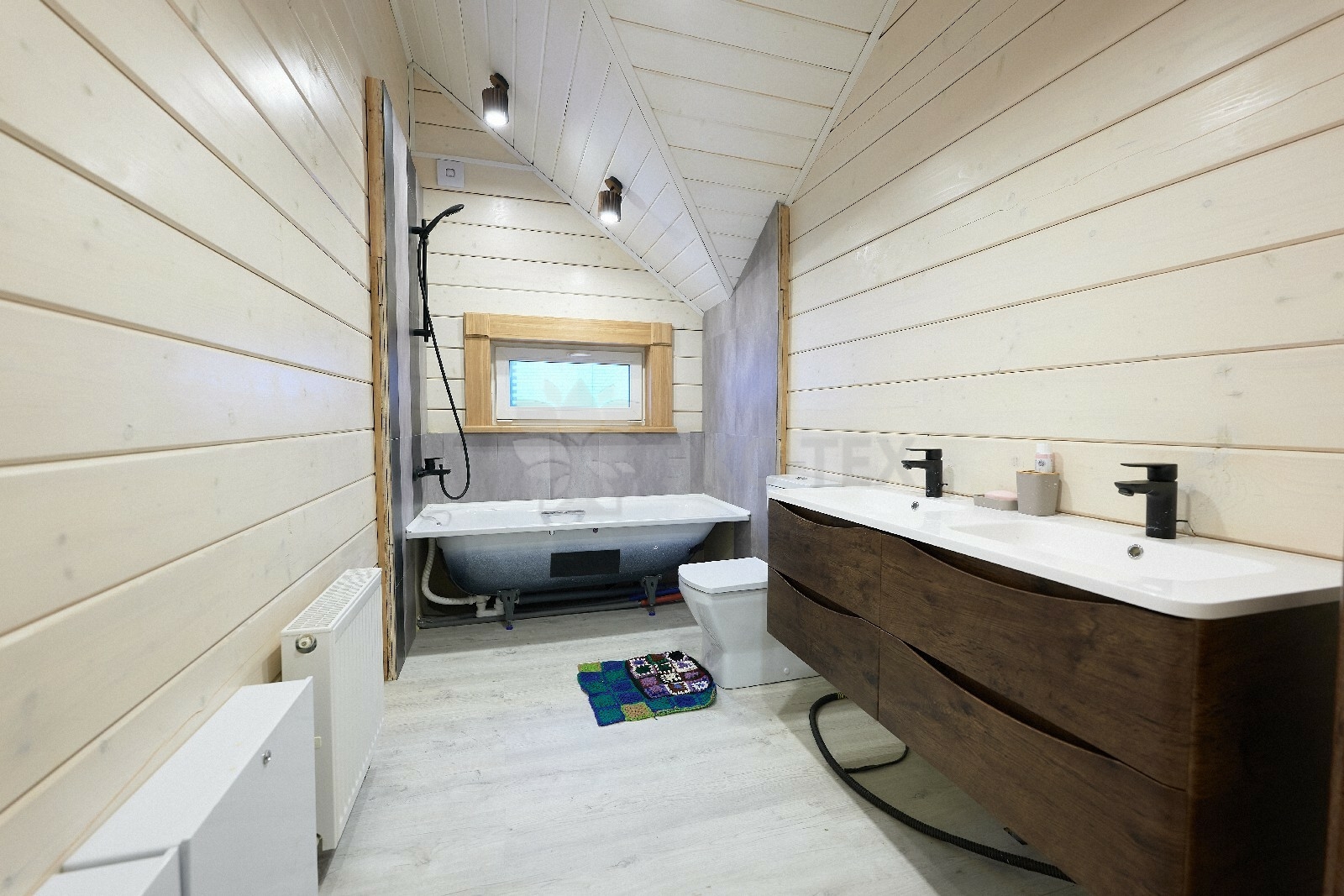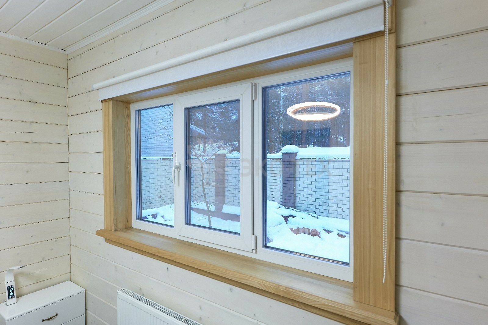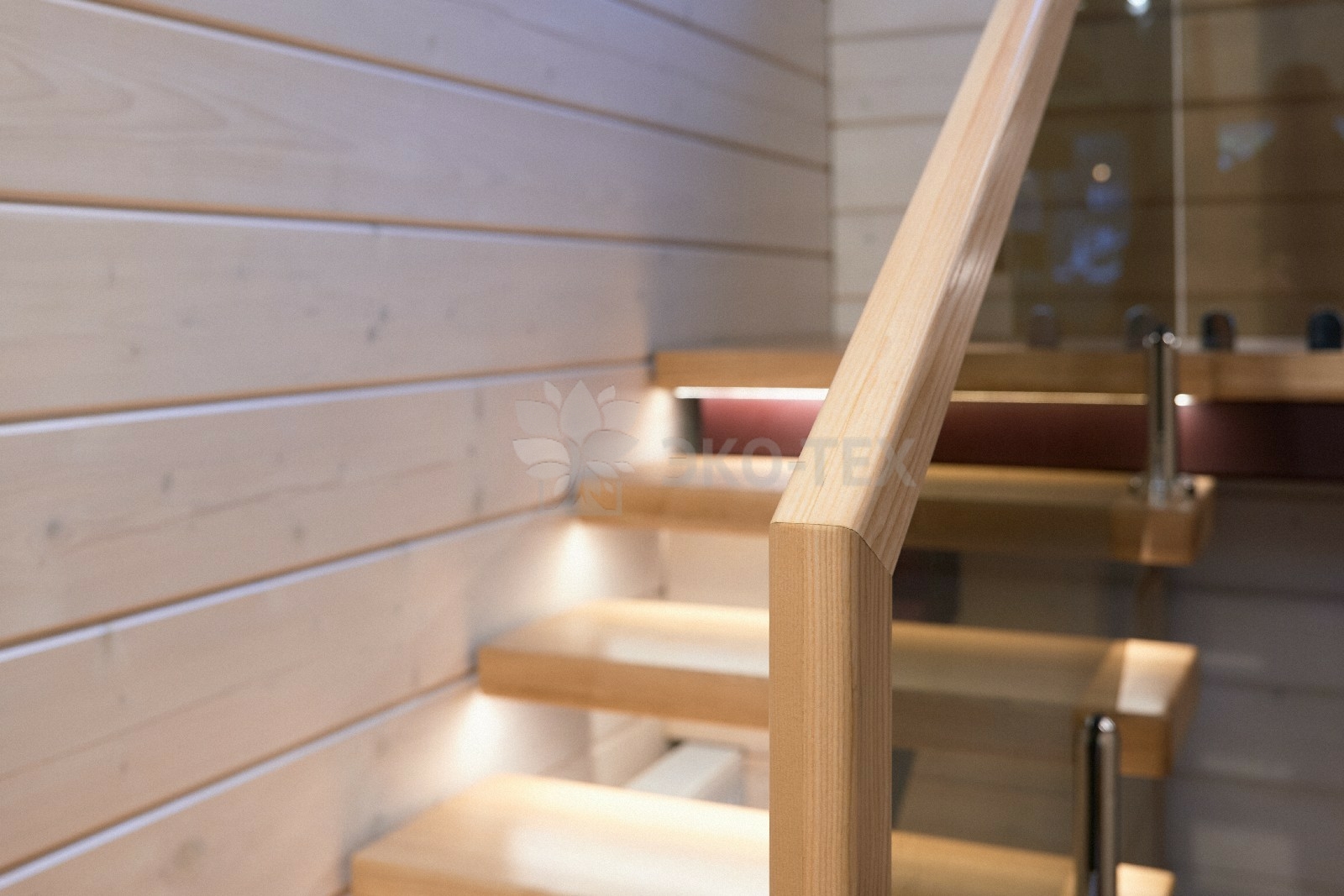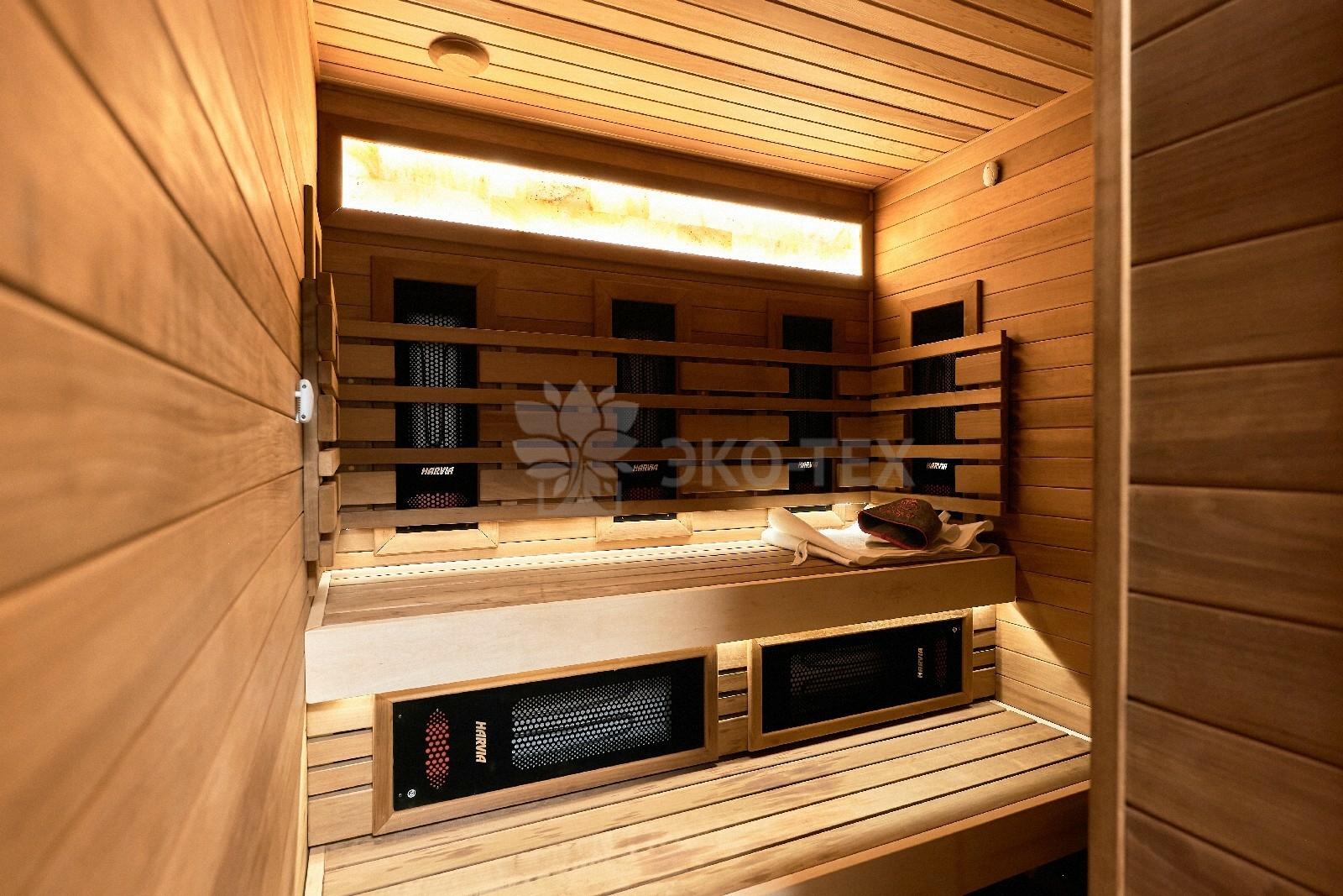 В противоположном углу первого этажа расположена жилая комната, которая может играть роль рабочего кабинета или спальни. В доме имеется сауна, оснащённая широкими полками, подсветкой и каменной печью.