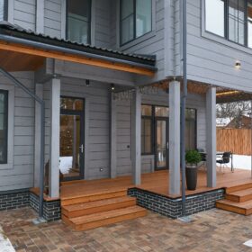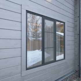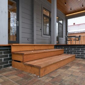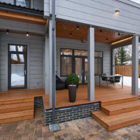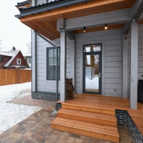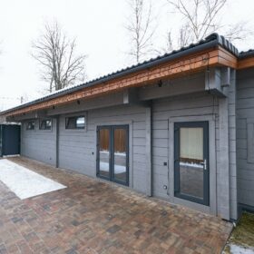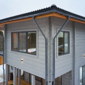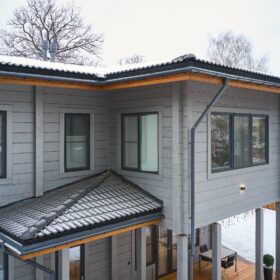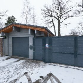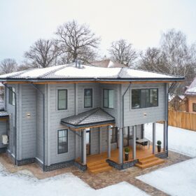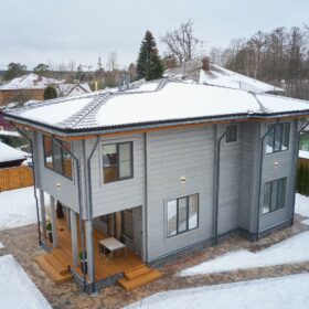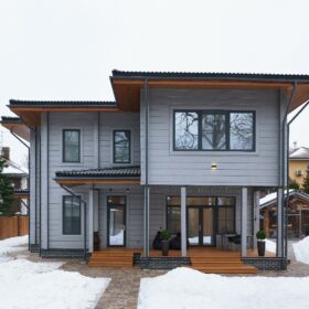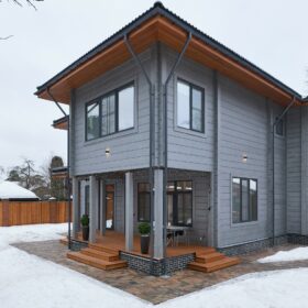 Приглушённый благородный серый цвет внешний отделки прекрасно смотрится на участке в любое время года,  радуя глаз и среди зимних сугробов и идеально  вписываясь в весенне-летний цветущий ландшафт.