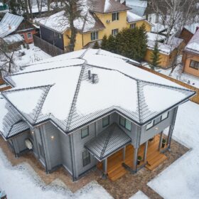Многопрофильная сложная крыша прекрасно справляется с ветровыми и снеговыми нагрузками, а современный кровельный материал обеспечивает идеальную тепло и звукоизоляцию.