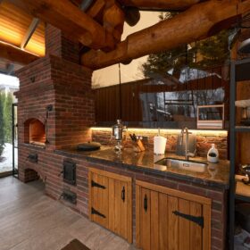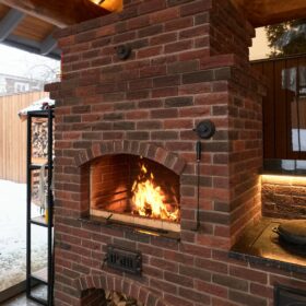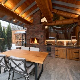Если говорить о лете, то непременно нужно упомянуть об «изюминке» этого проекта — летней кухне с настоящей каменной печью и живым огнём.