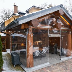 Кухня оборудована по последнему слову техники. Это пространство, с одной стороны максимально открыто свежему воздуху, с другой, прозрачные лёгкие перегородки защищают её от непогоды и ветра.