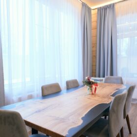 На первом этаже располагается просторная кухня-столовая, которая имеет выход на террасу. Столовая  совмещена с  тридцатиметровой уютной  гостиной. Здесь же, на нижнем этаже,  неподалёку расположилась комната отдыха, которая может быть использована в качестве гостевой спальни или рабочего кабинета.