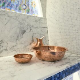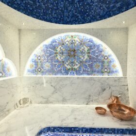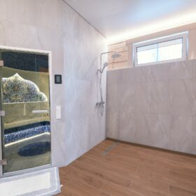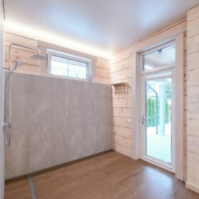 Большую площадь на первом этаже занимает  баня, которая может быть обустроена как в классическом стиле, так  в  стиле восточного хамама. Из бани  имеется выход  на открытую  террасу.