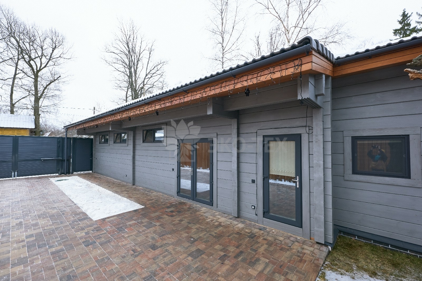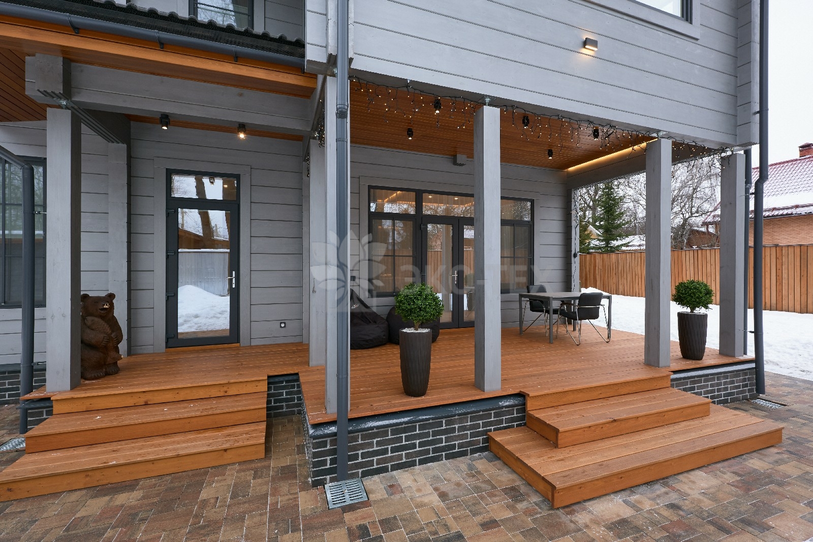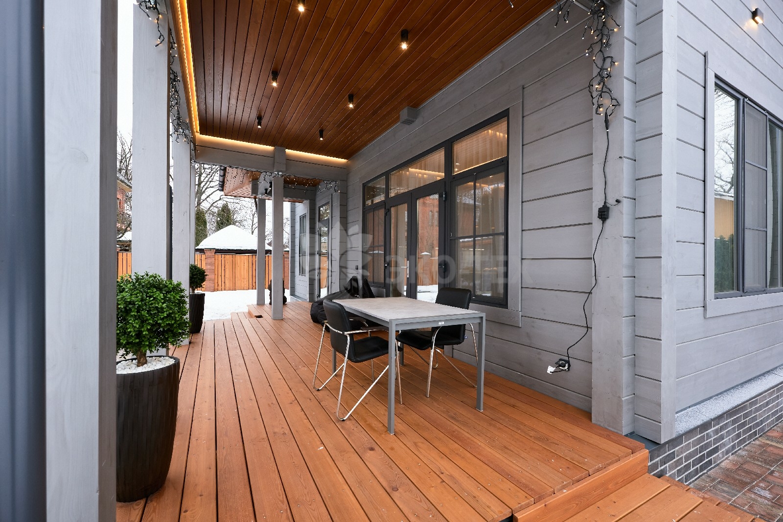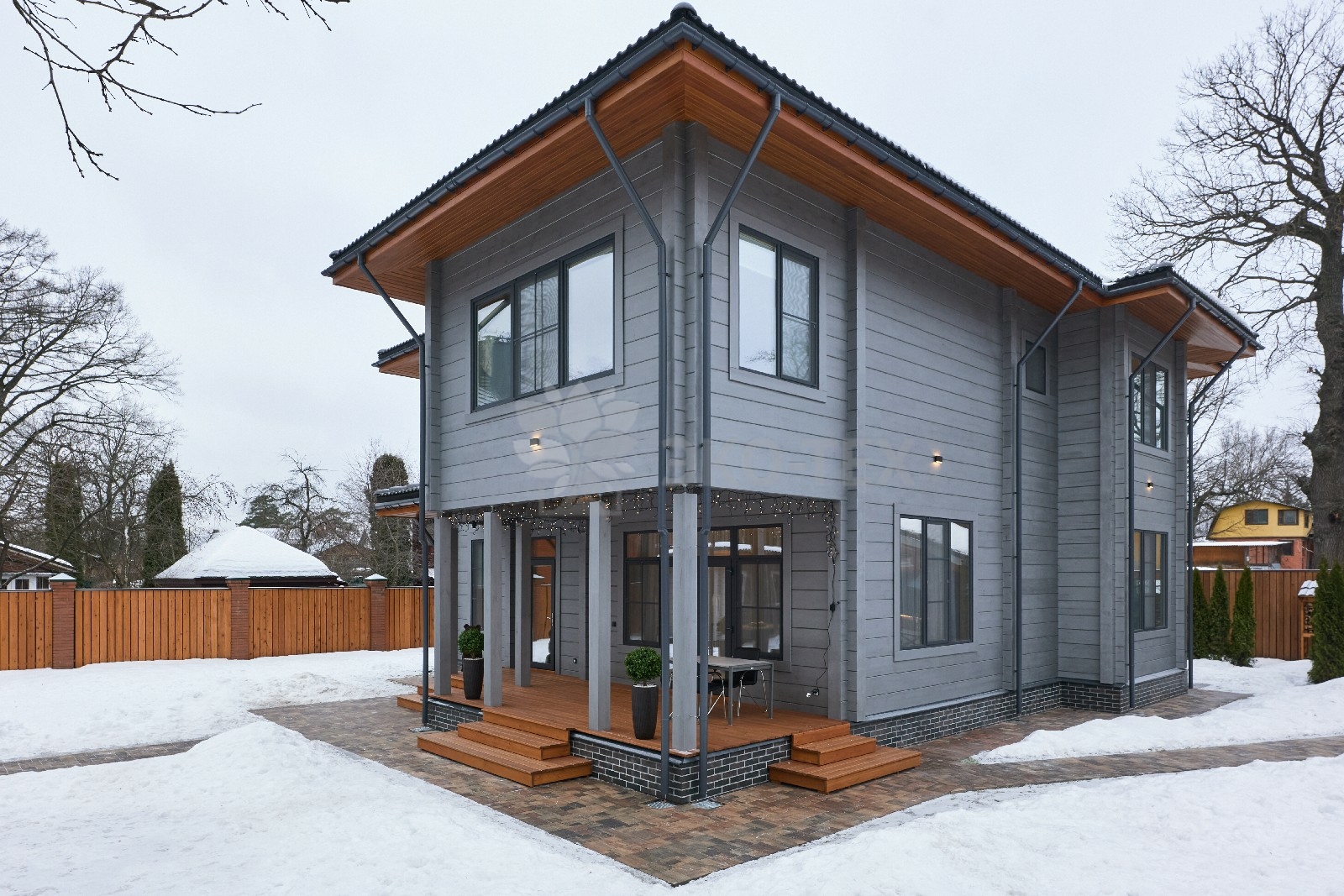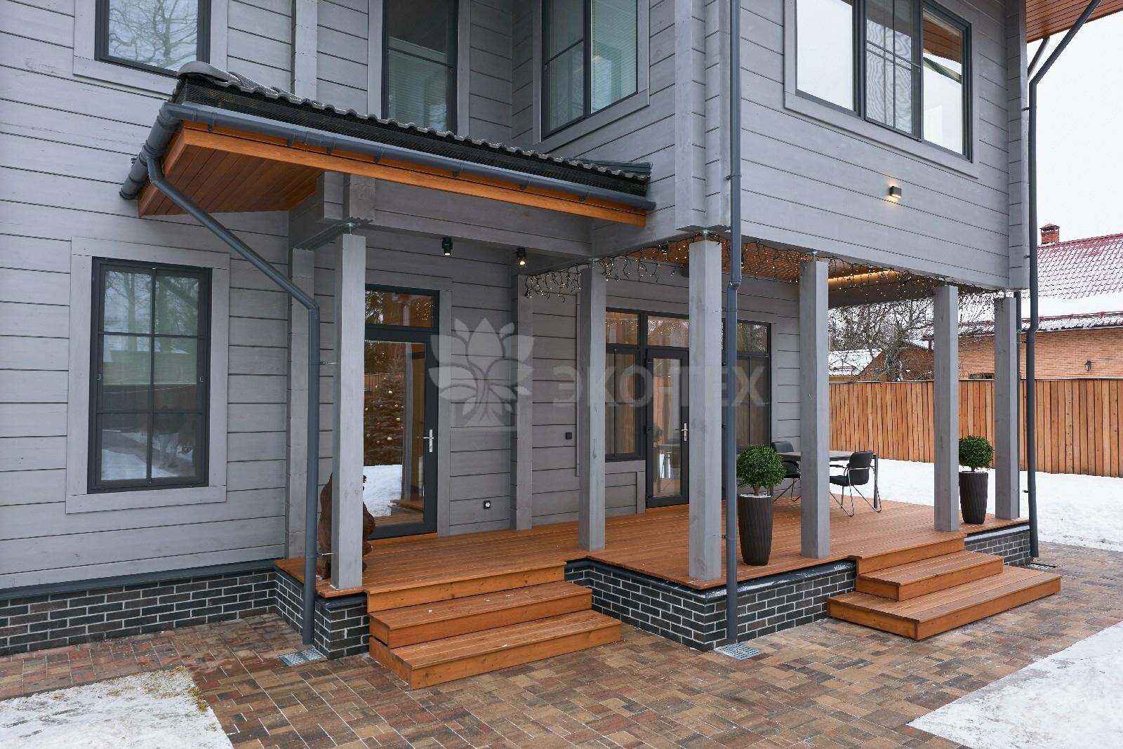 Приглушённый благородный серый цвет внешний отделки прекрасно смотрится на участке в любое время года,  радуя глаз и среди зимних сугробов и идеально  вписываясь в весенне-летний цветущий ландшафт.
