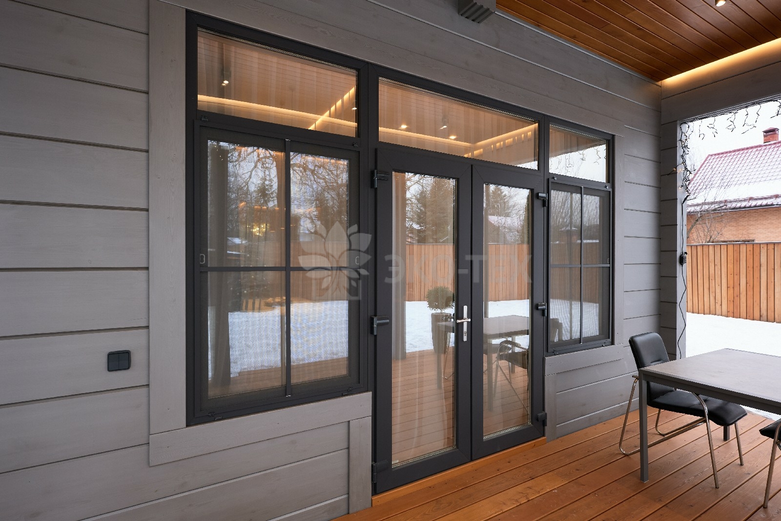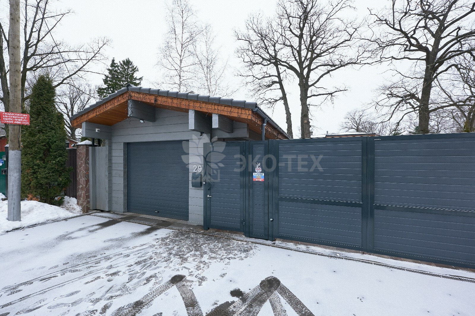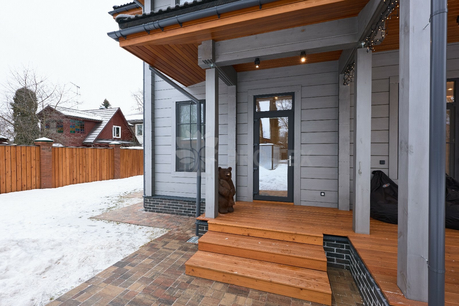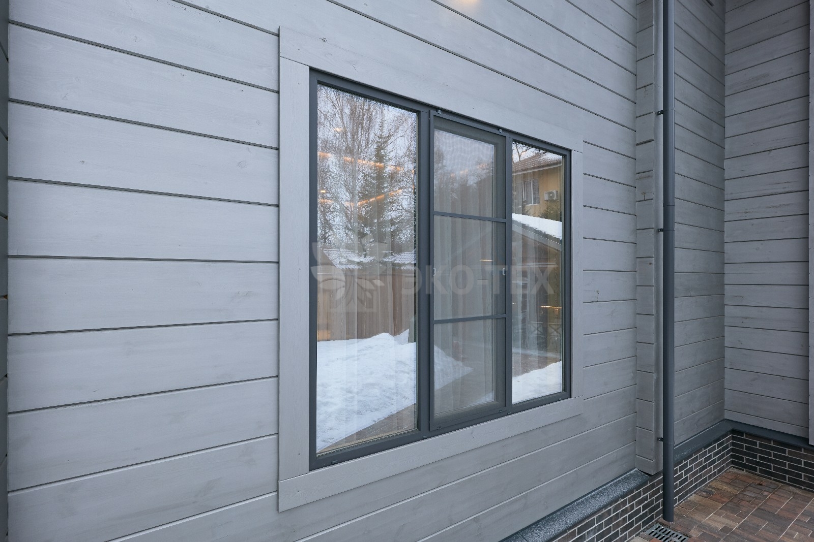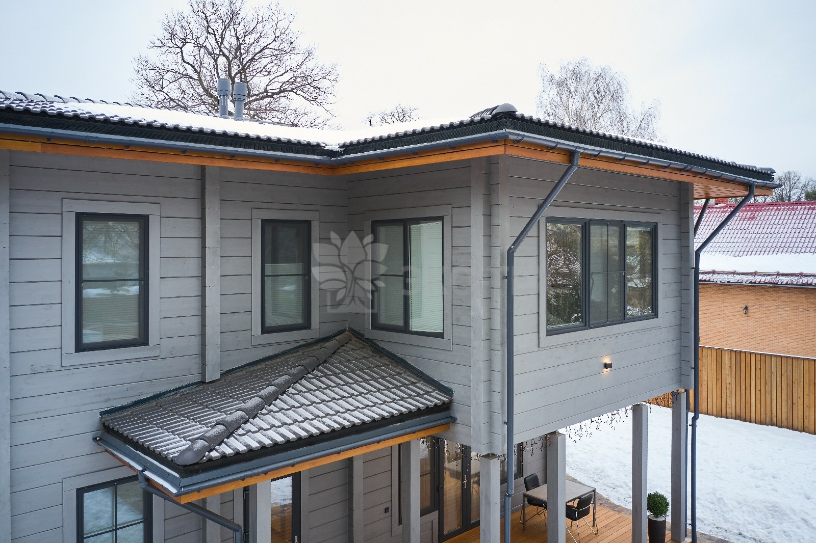 Приглушённый благородный серый цвет внешний отделки прекрасно смотрится на участке в любое время года,  радуя глаз и среди зимних сугробов и идеально  вписываясь в весенне-летний цветущий ландшафт.