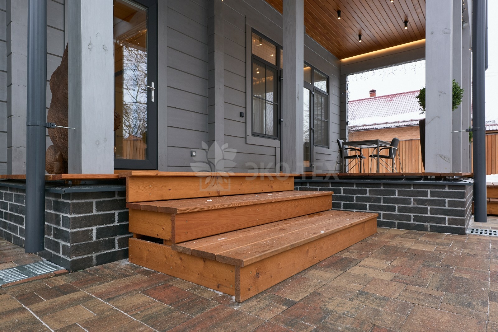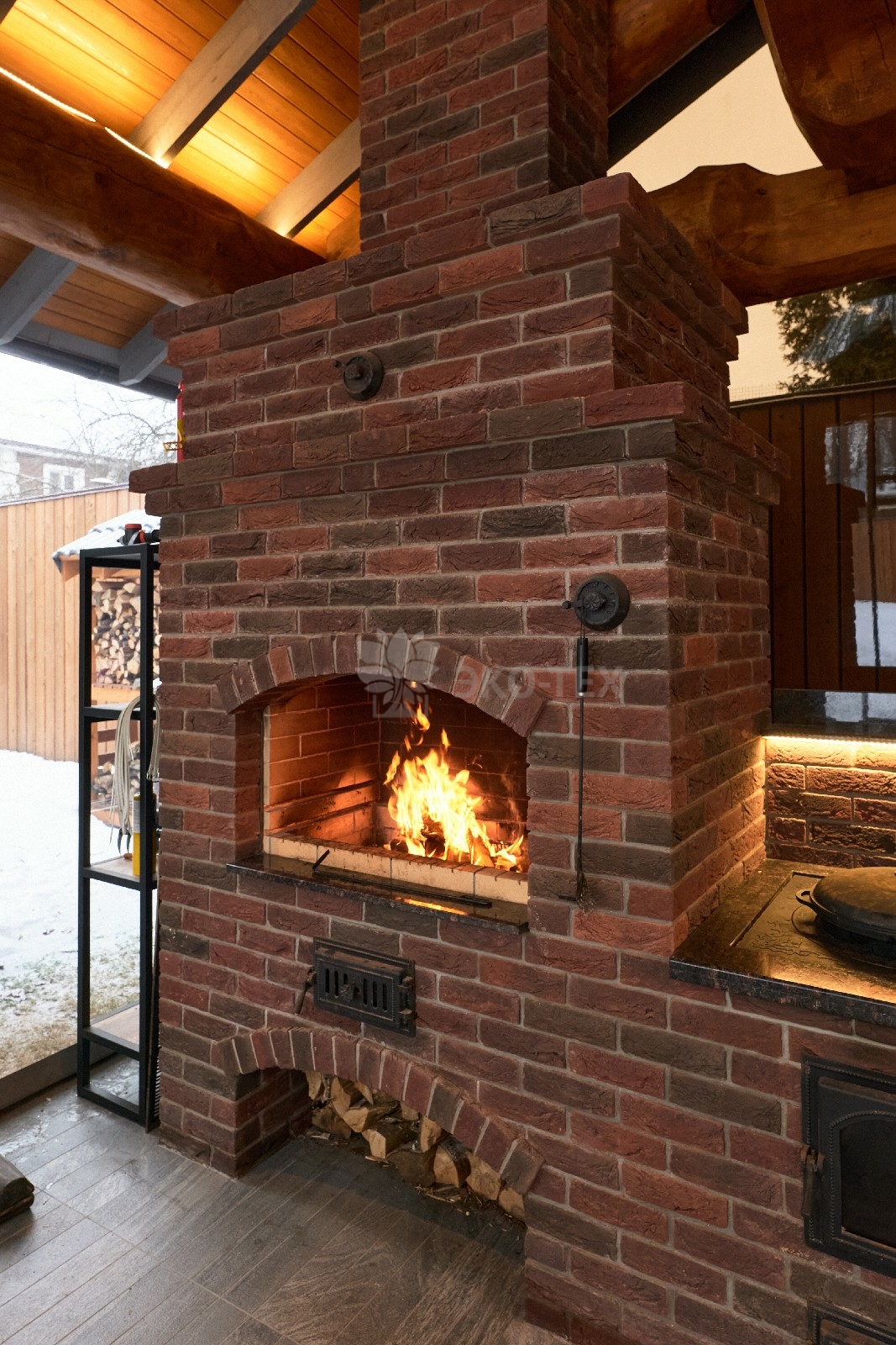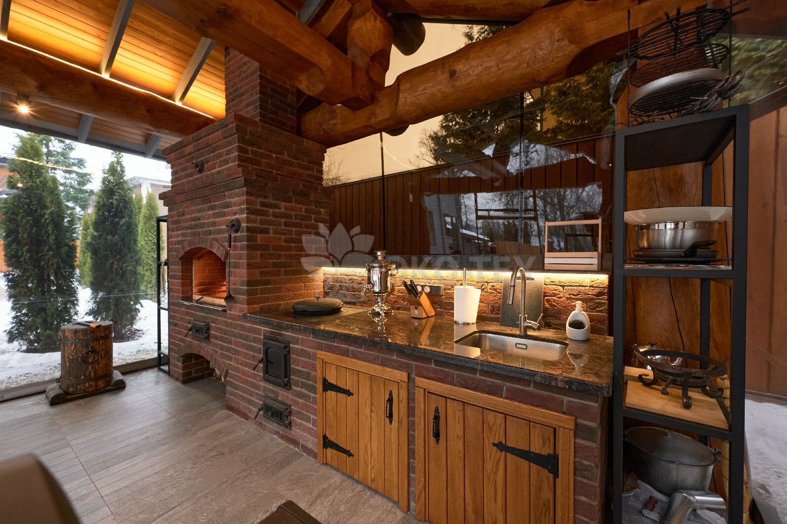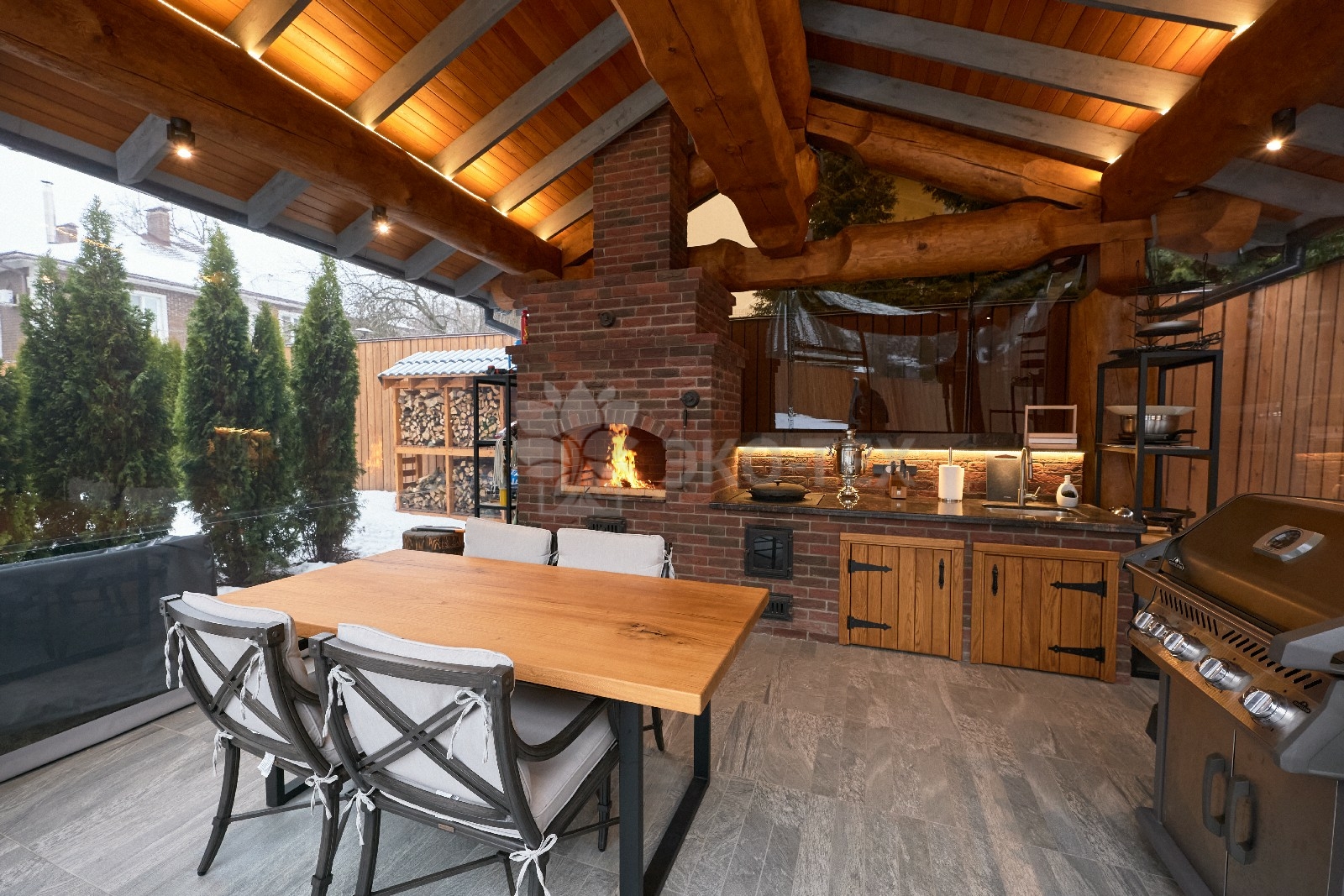 Если говорить о лете, то непременно нужно упомянуть об «изюминке» этого проекта — летней кухне с настоящей каменной печью и живым огнём.