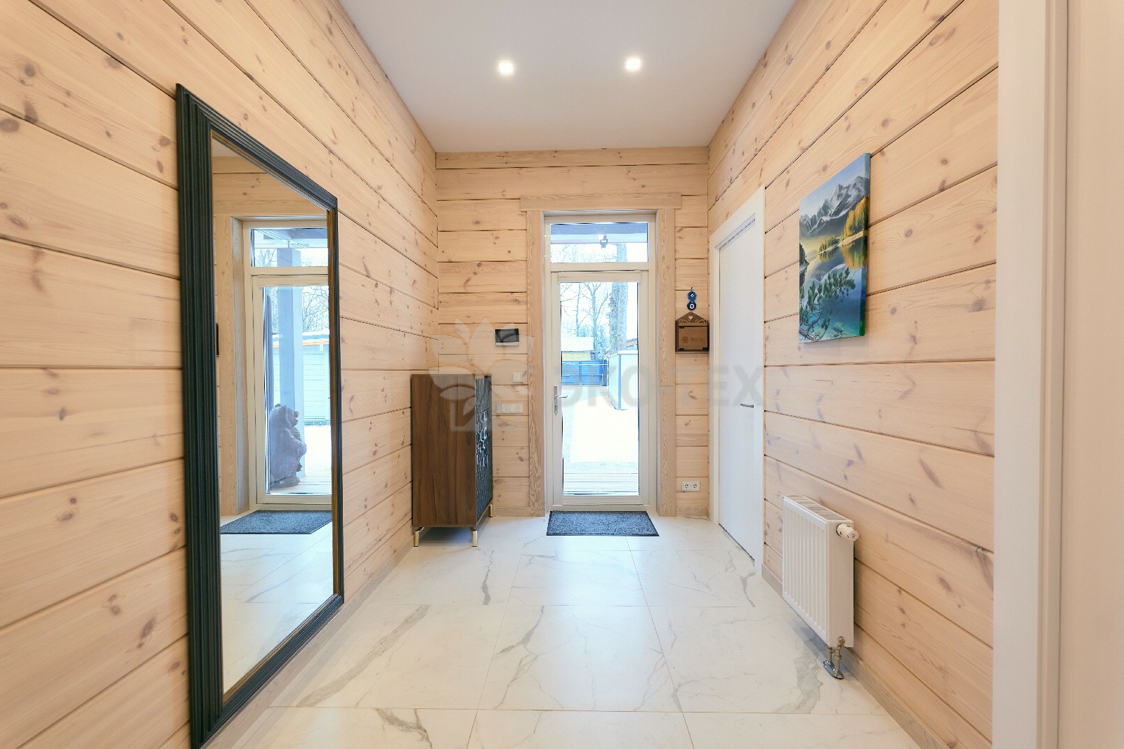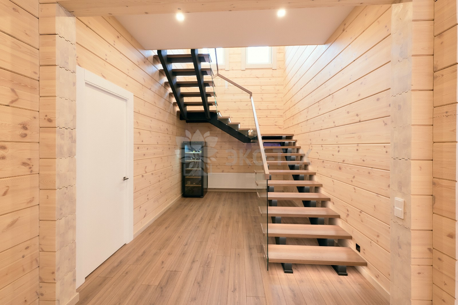 Продуманная планировка технических помещений, гардеробной и прихожей обеспечивают удобство и функциональность. Помещения  объединяются общим холлом, лестница  из которого ведёт на второй этаж. Лестница имеет несколько маршей, за счёт этого её уклон минимален и комфортен.