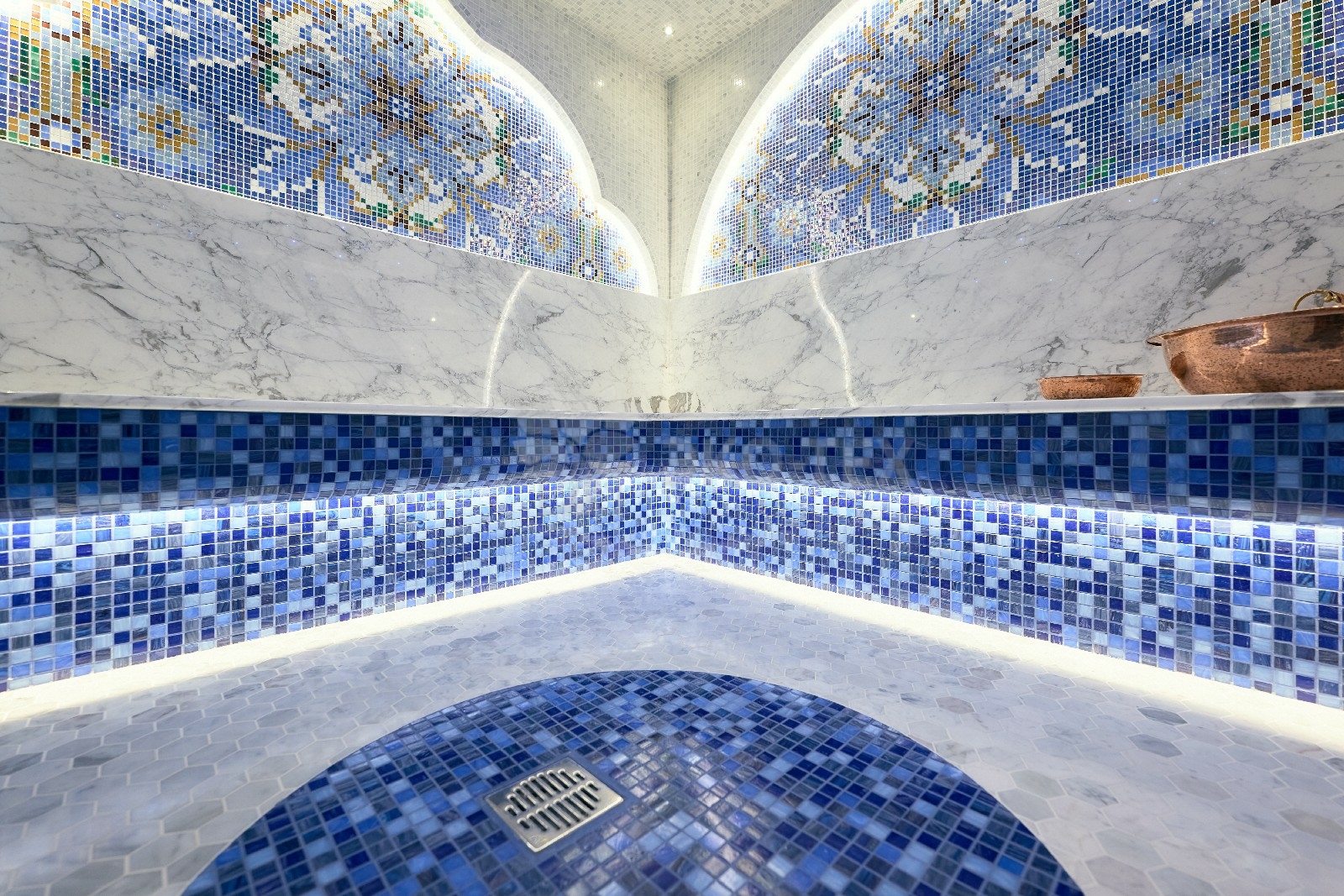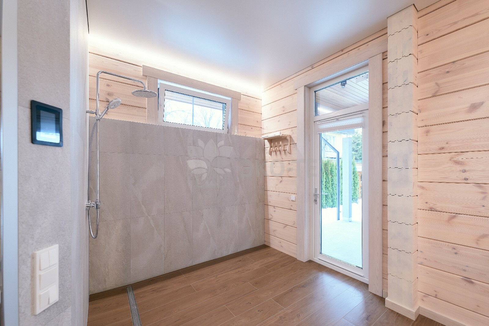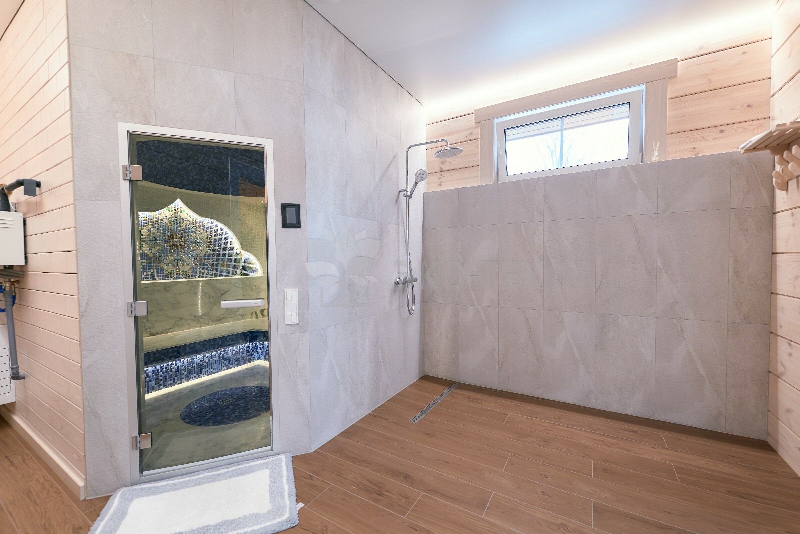 Большую площадь на первом этаже занимает  баня, которая может быть обустроена как в классическом стиле, так  в  стиле восточного хамама. Из бани  имеется выход  на открытую  террасу.