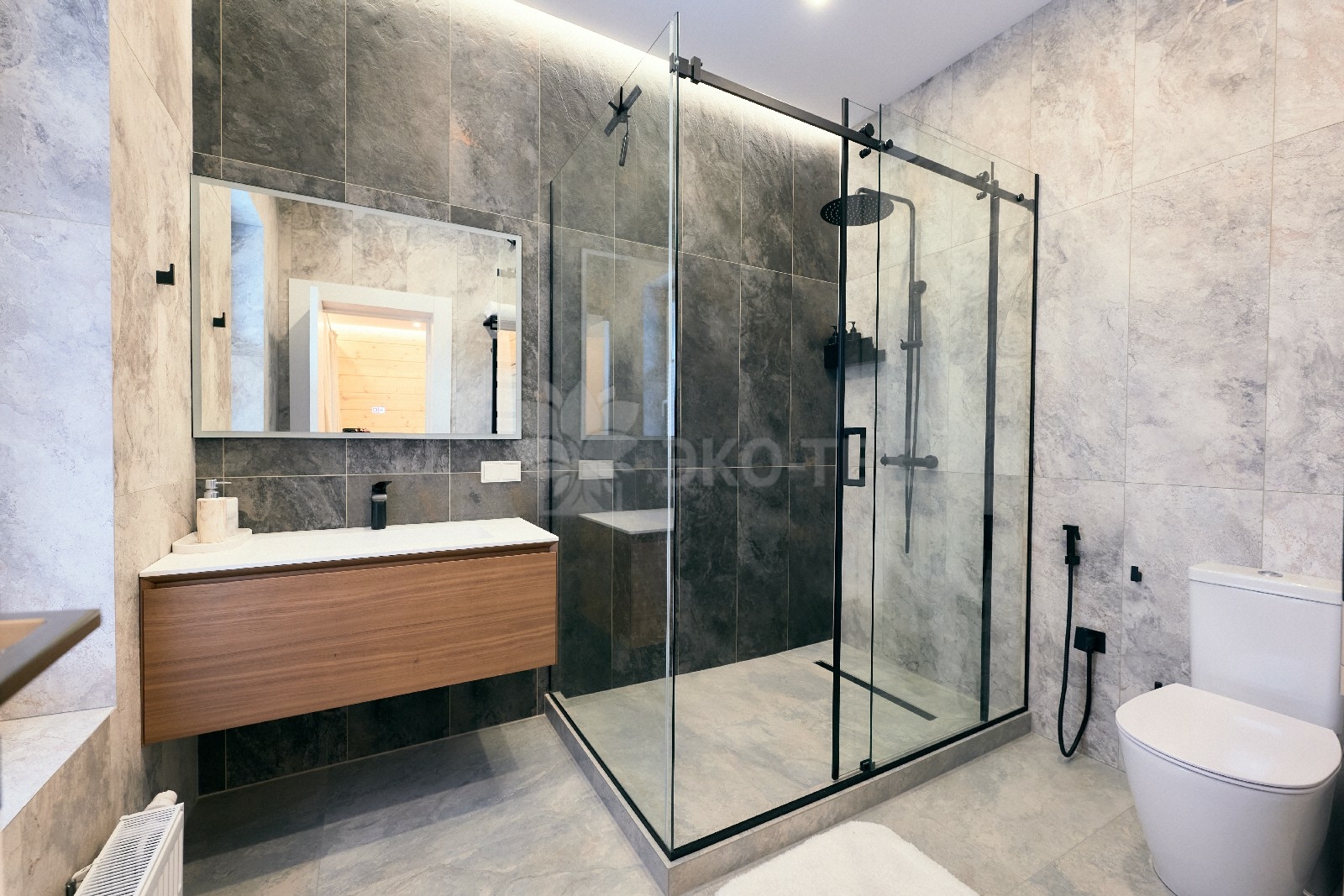 На первом этаже располагается просторная кухня-столовая, которая имеет выход на террасу. Столовая  совмещена с  тридцатиметровой уютной  гостиной. Здесь же, на нижнем этаже,  неподалёку расположилась комната отдыха, которая может быть использована в качестве гостевой спальни или рабочего кабинета.