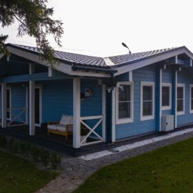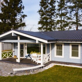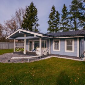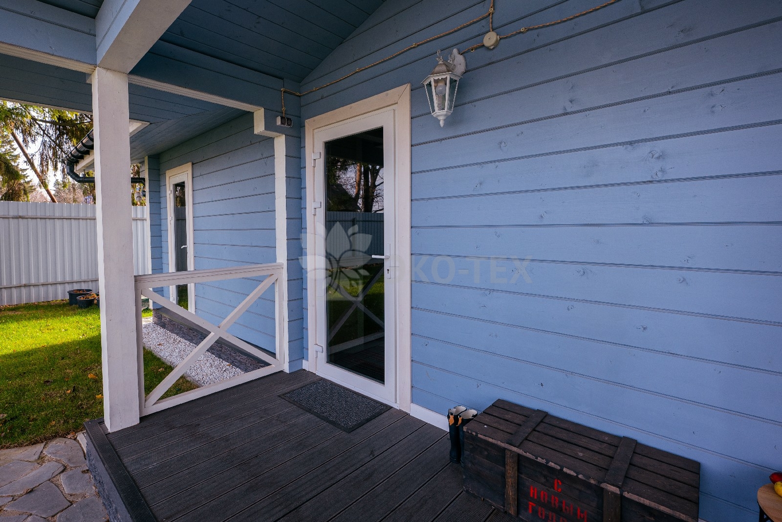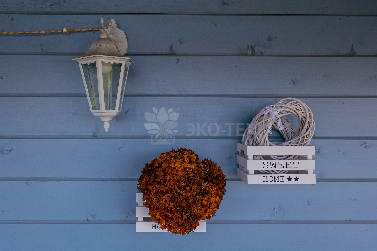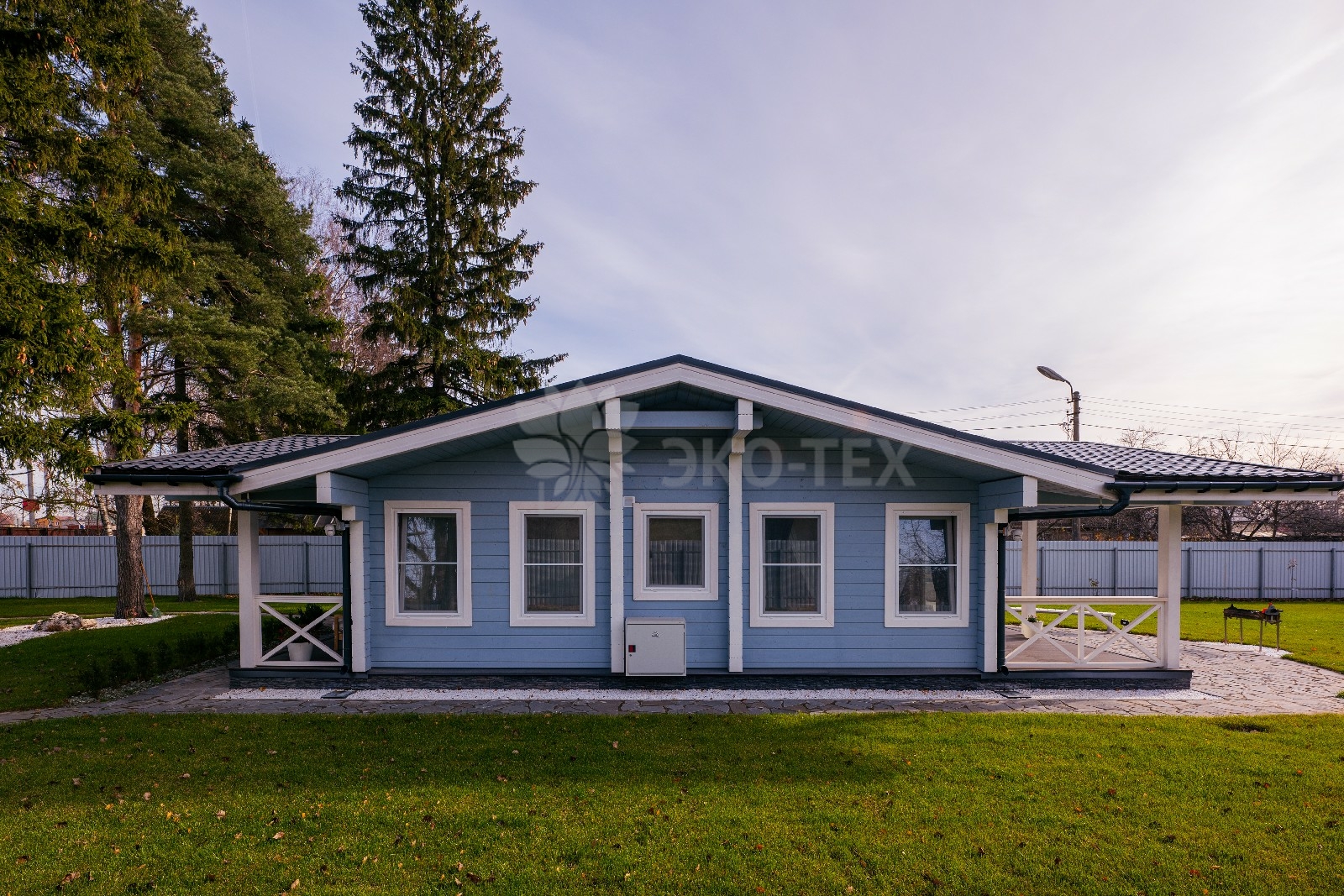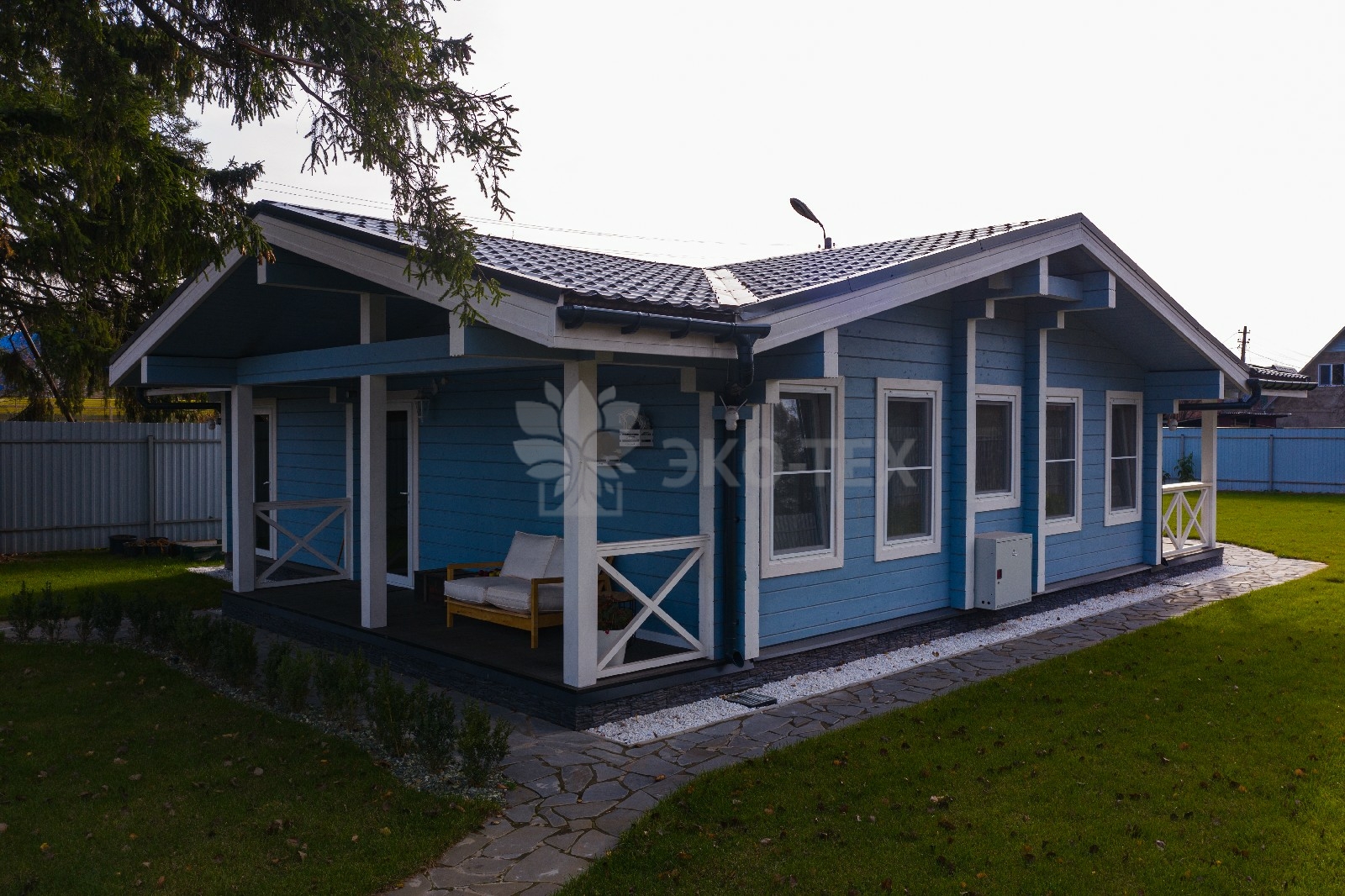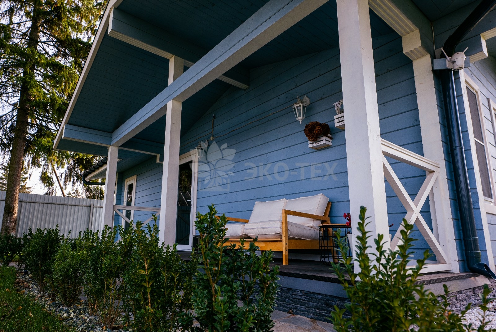 И это вполне оправдано, ведь даже беглый взгляд на дом вызывает самые приятные ассоциации. Большая и просторная веранда, на которую ведут широкие удобные ступени, кажется наполненной ароматом морского бриза. Необычное оформление фундамента и крыши в лазурных тонах радует глаз и дарит всегда прекрасное настроение.