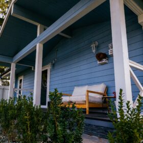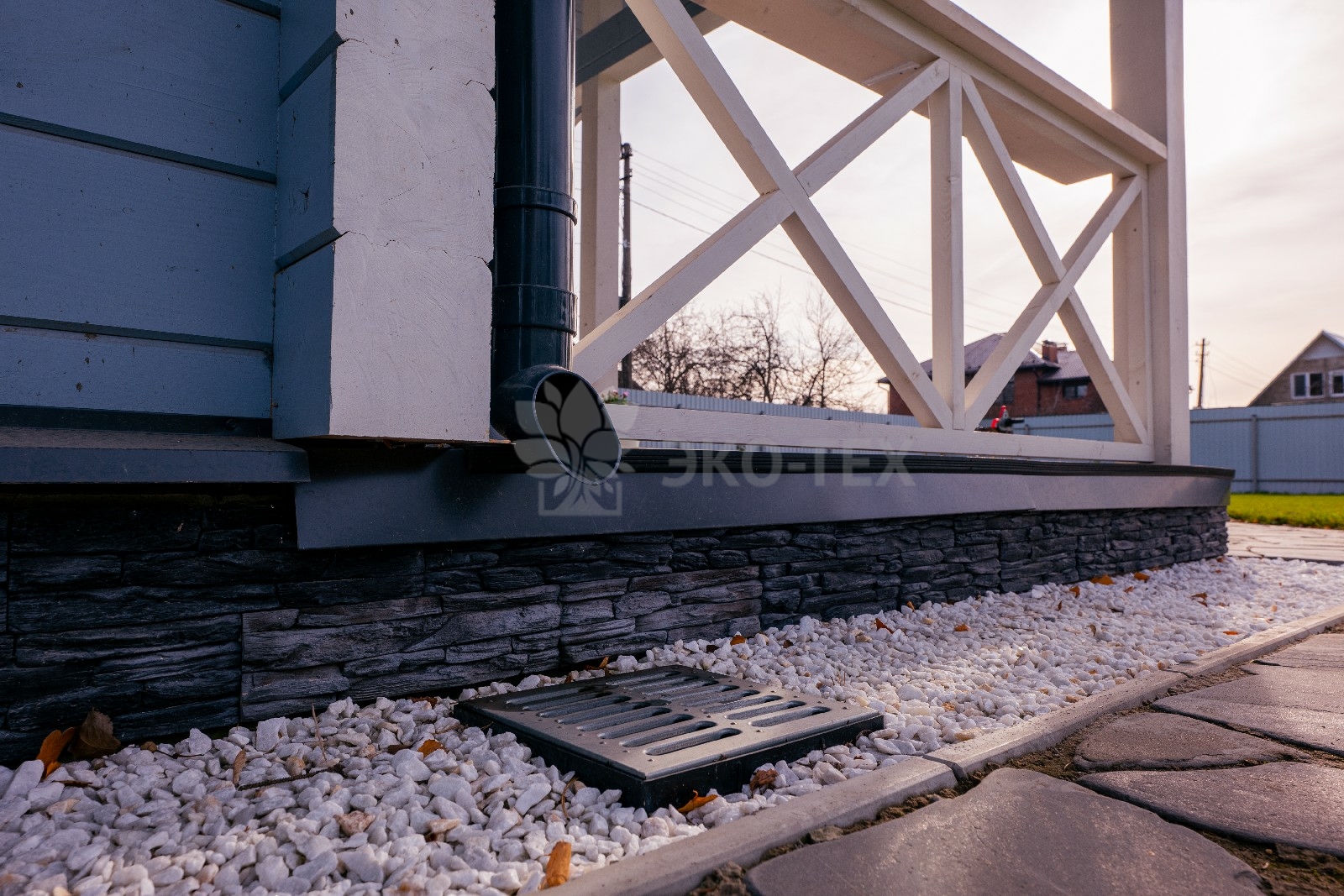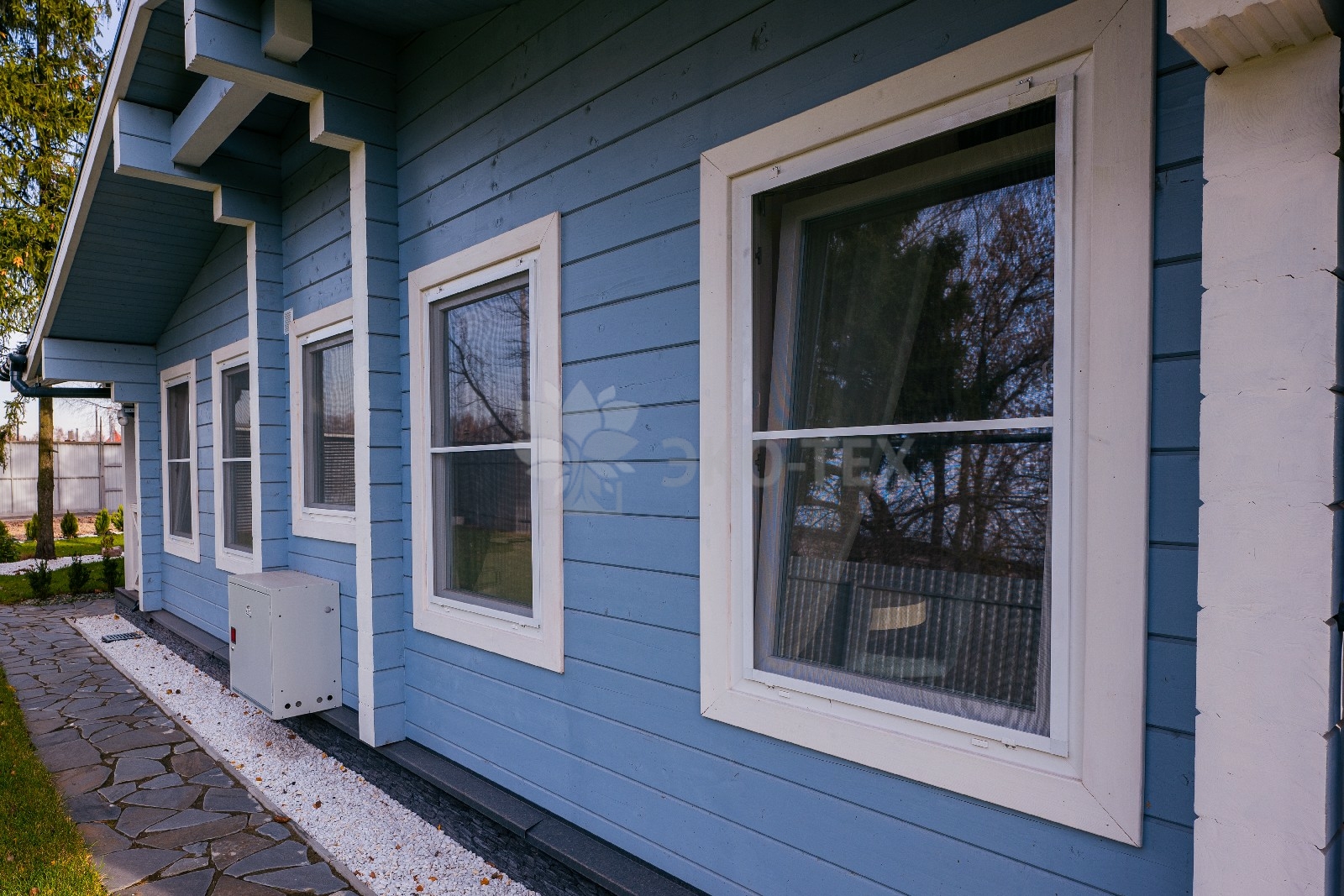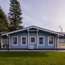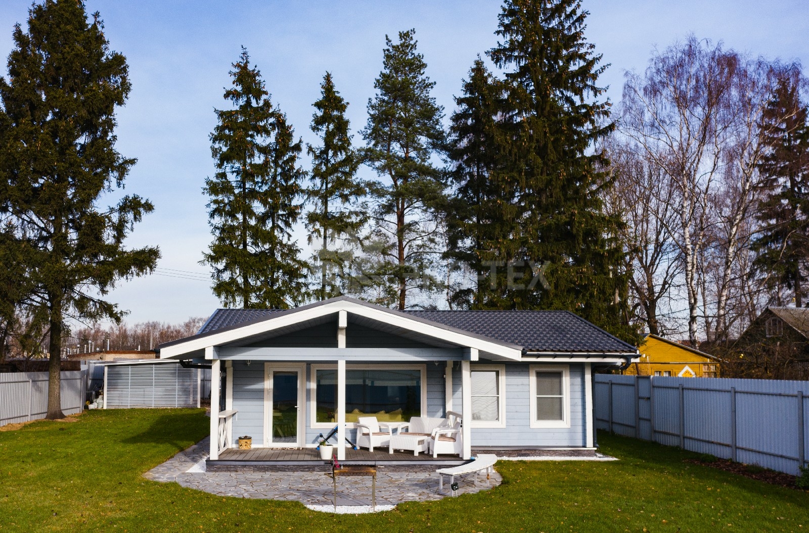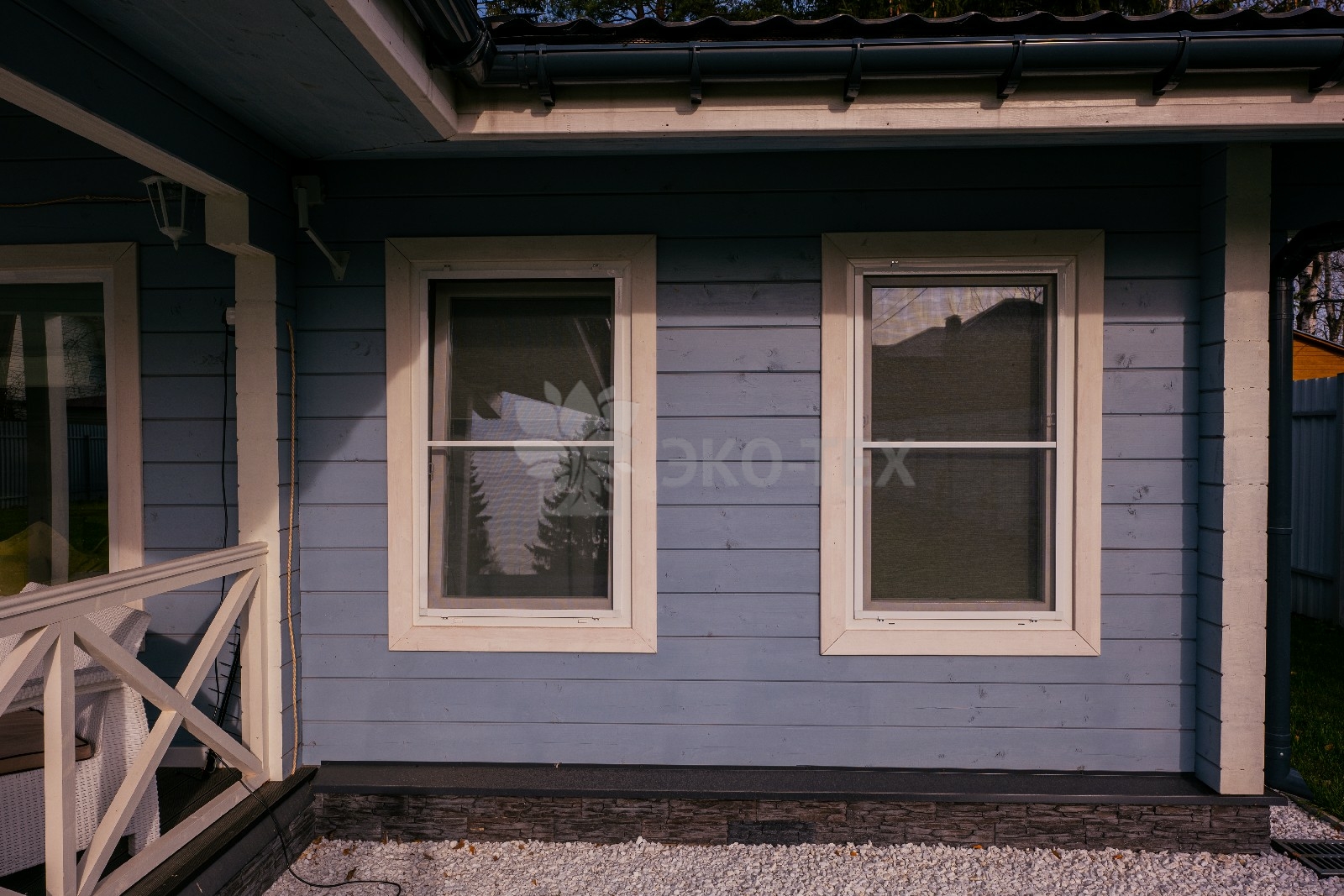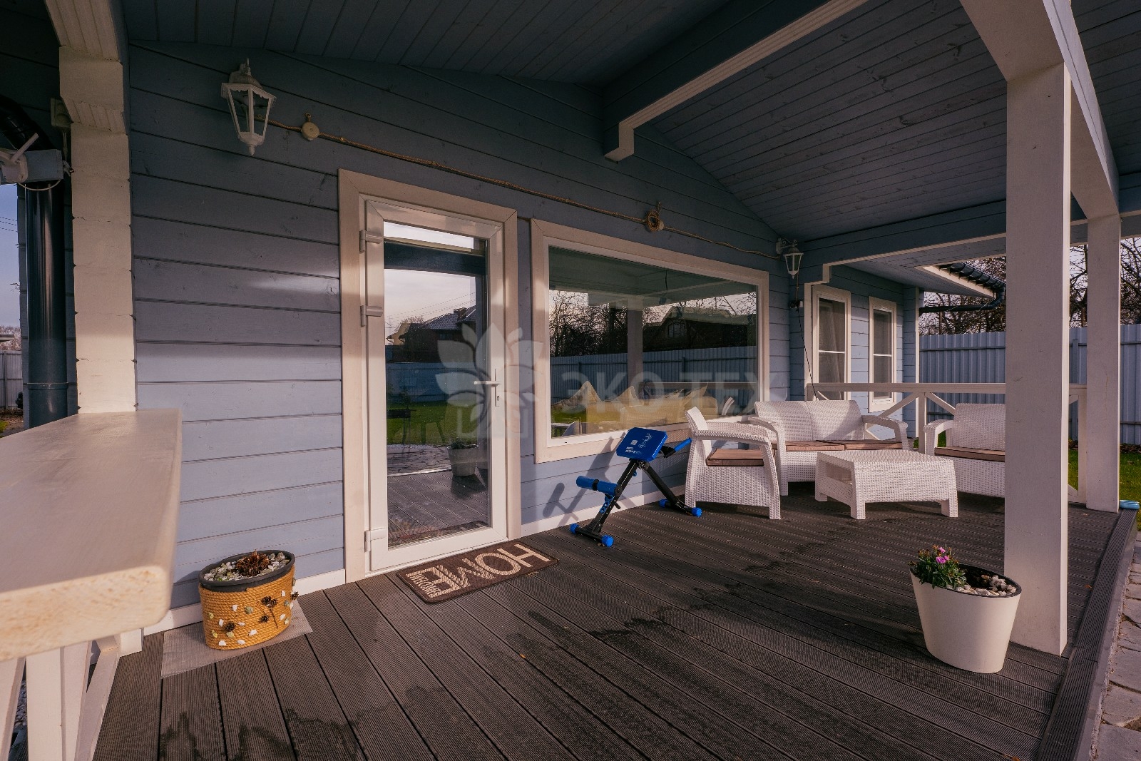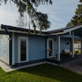 И это вполне оправдано, ведь даже беглый взгляд на дом вызывает самые приятные ассоциации. Большая и просторная веранда, на которую ведут широкие удобные ступени, кажется наполненной ароматом морского бриза. Необычное оформление фундамента и крыши в лазурных тонах радует глаз и дарит всегда прекрасное настроение.