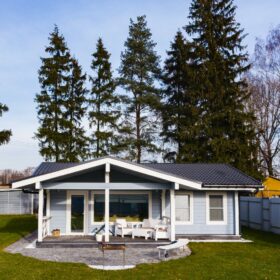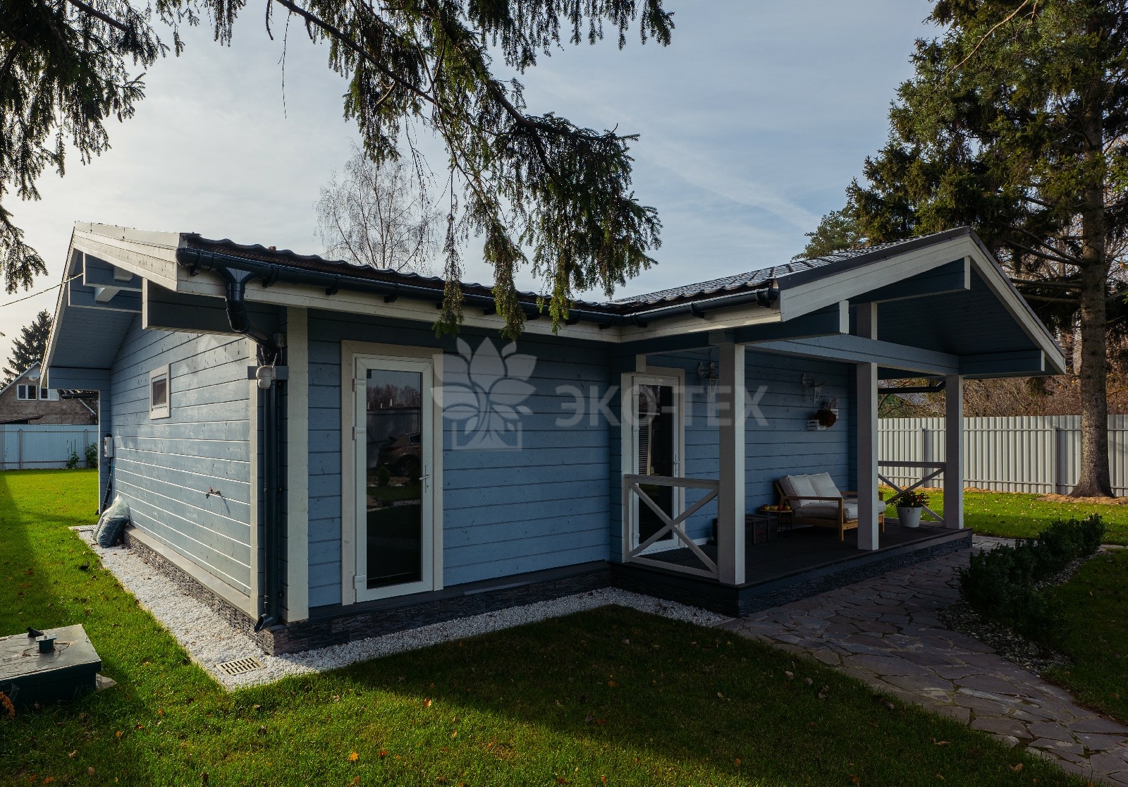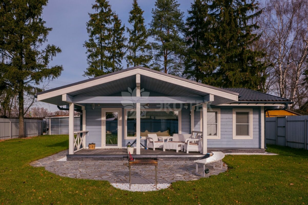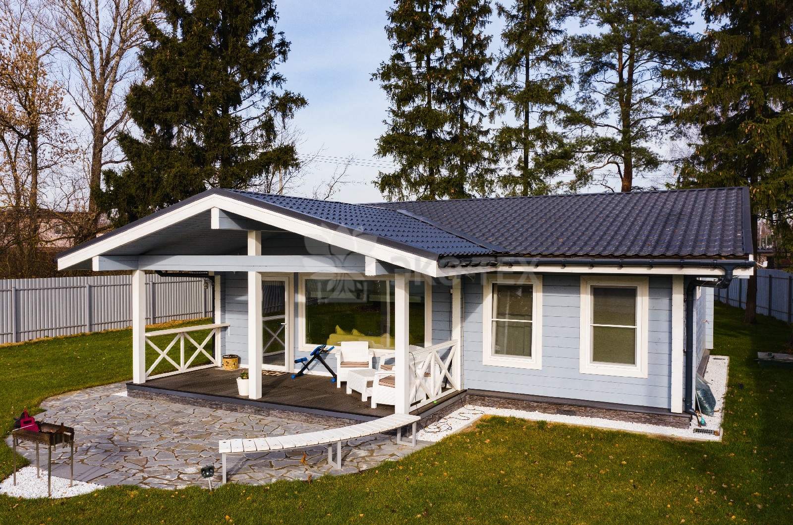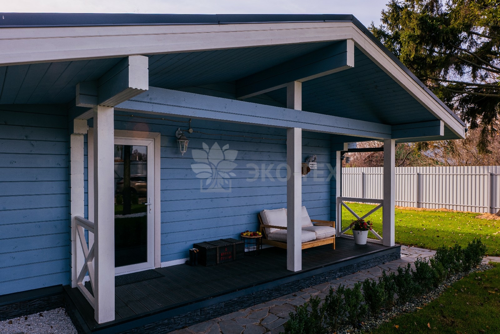 Проект уютного одноэтажного дома для отдыха с террасой, материал клеенный брус