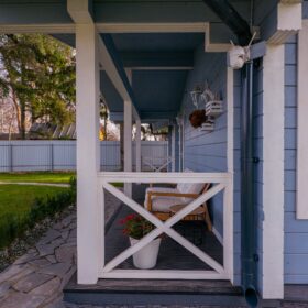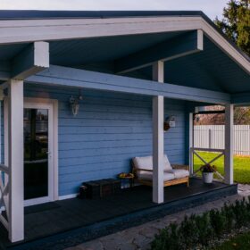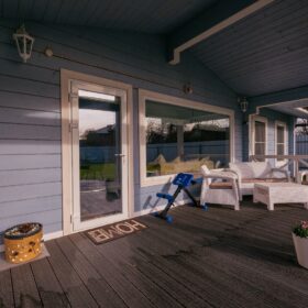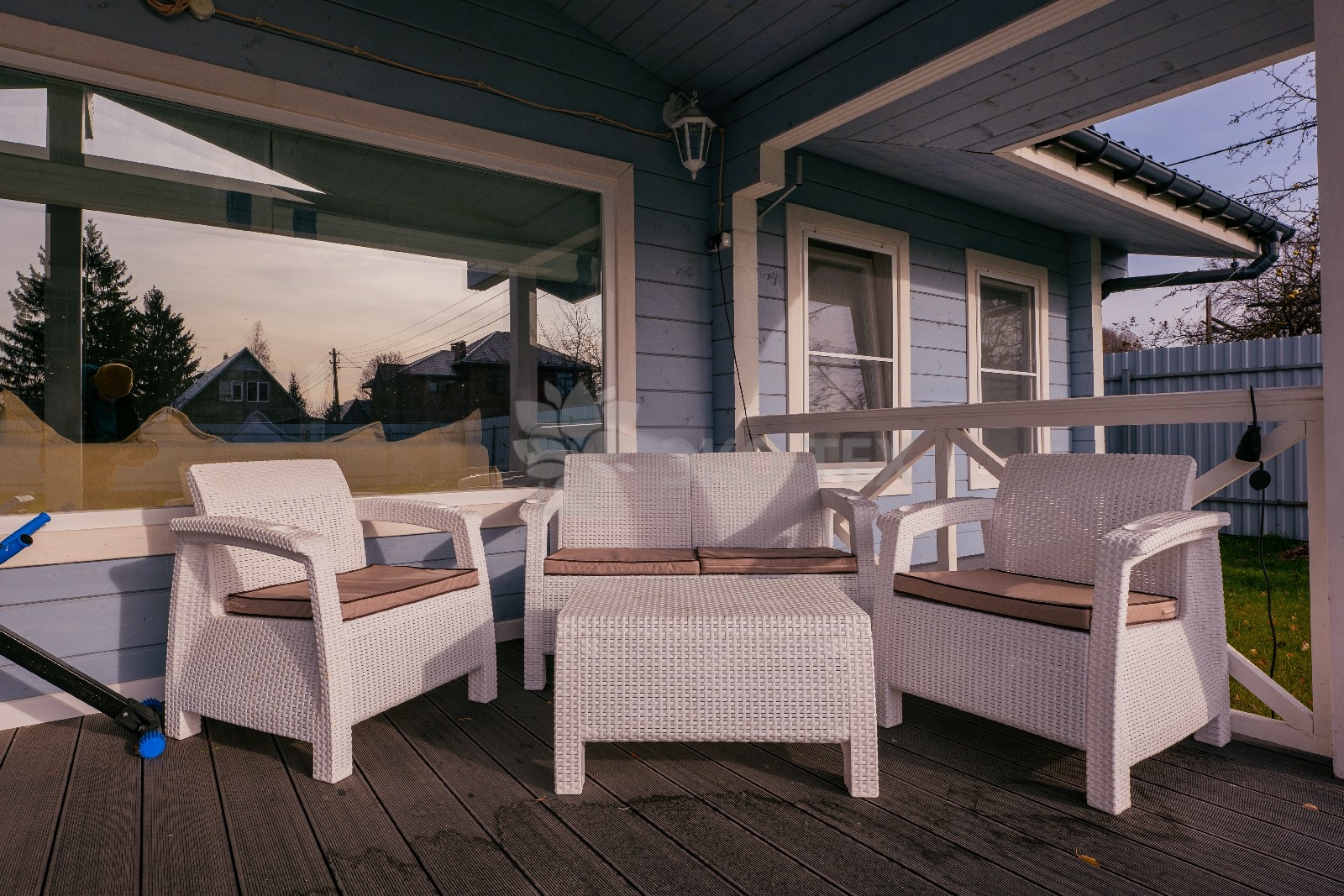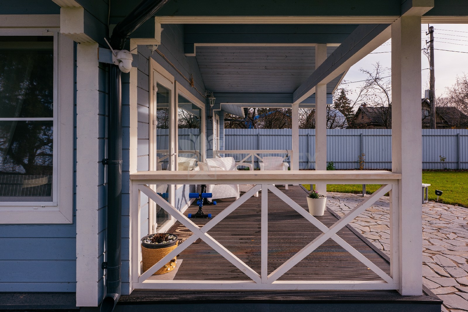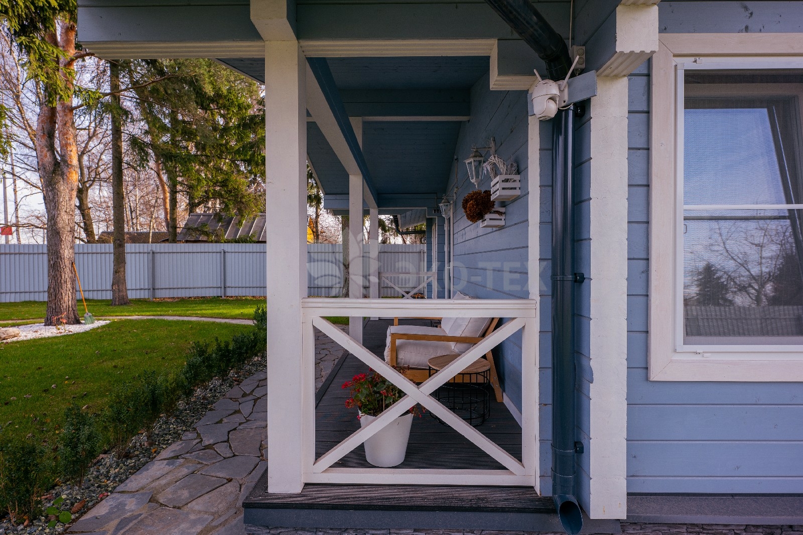 Веранда воплощает в себе одновременно надёжность и лёгкость, подобная гармония достигается за счёт изящных перил, которые, плюс ко всему, создаётся ощущение полного слияния с природой.