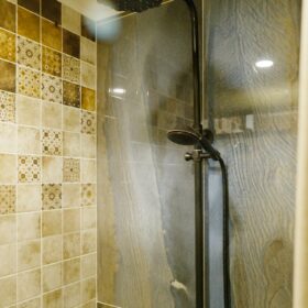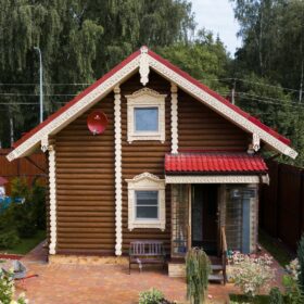Двускатная крыша, отделанная современными кровельными материалами, обеспечивает надёжную защиту от осадков. Небольшое застекленное крыльцо позволяет после банных процедур избежать резкого перепада температур и сквозняков.