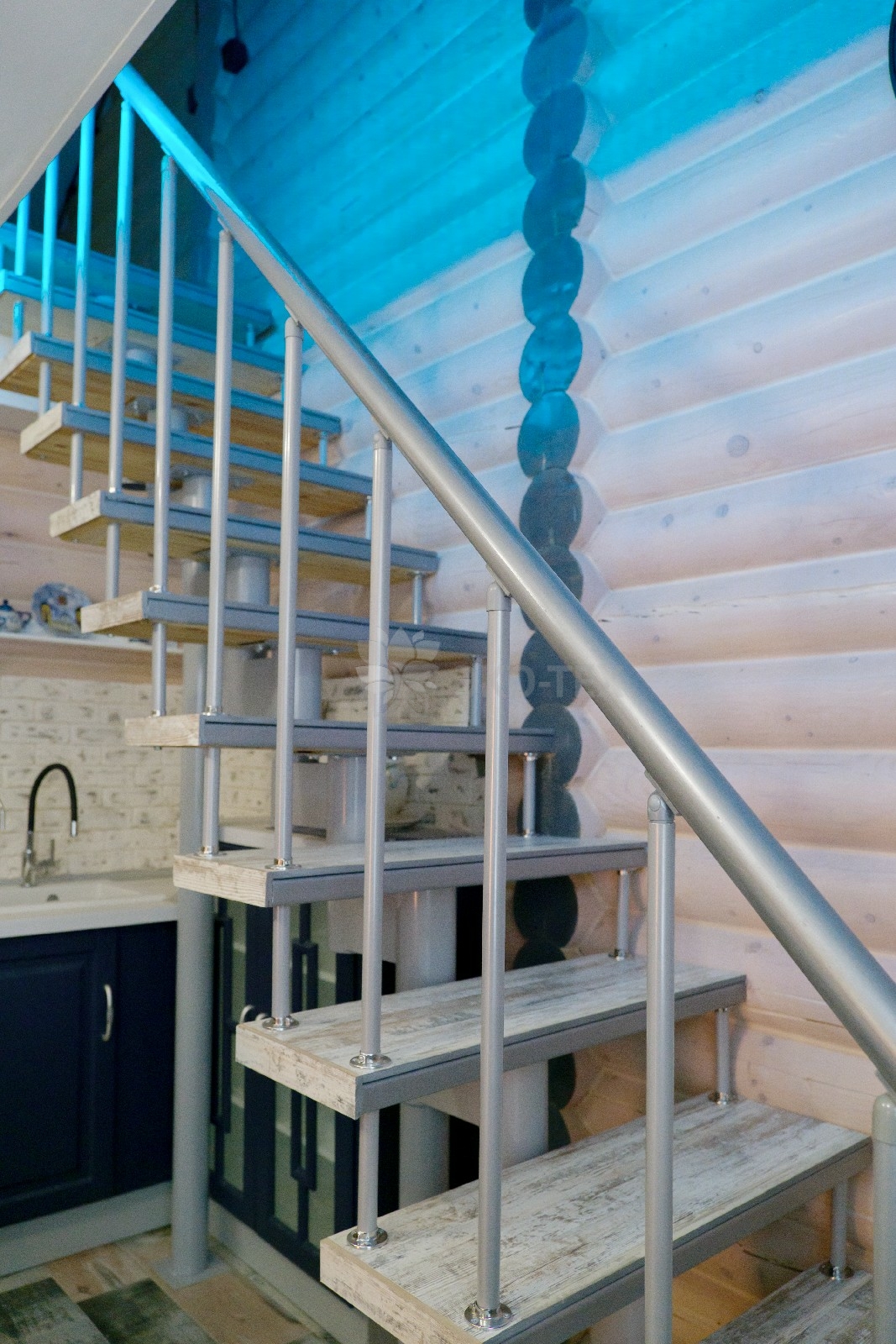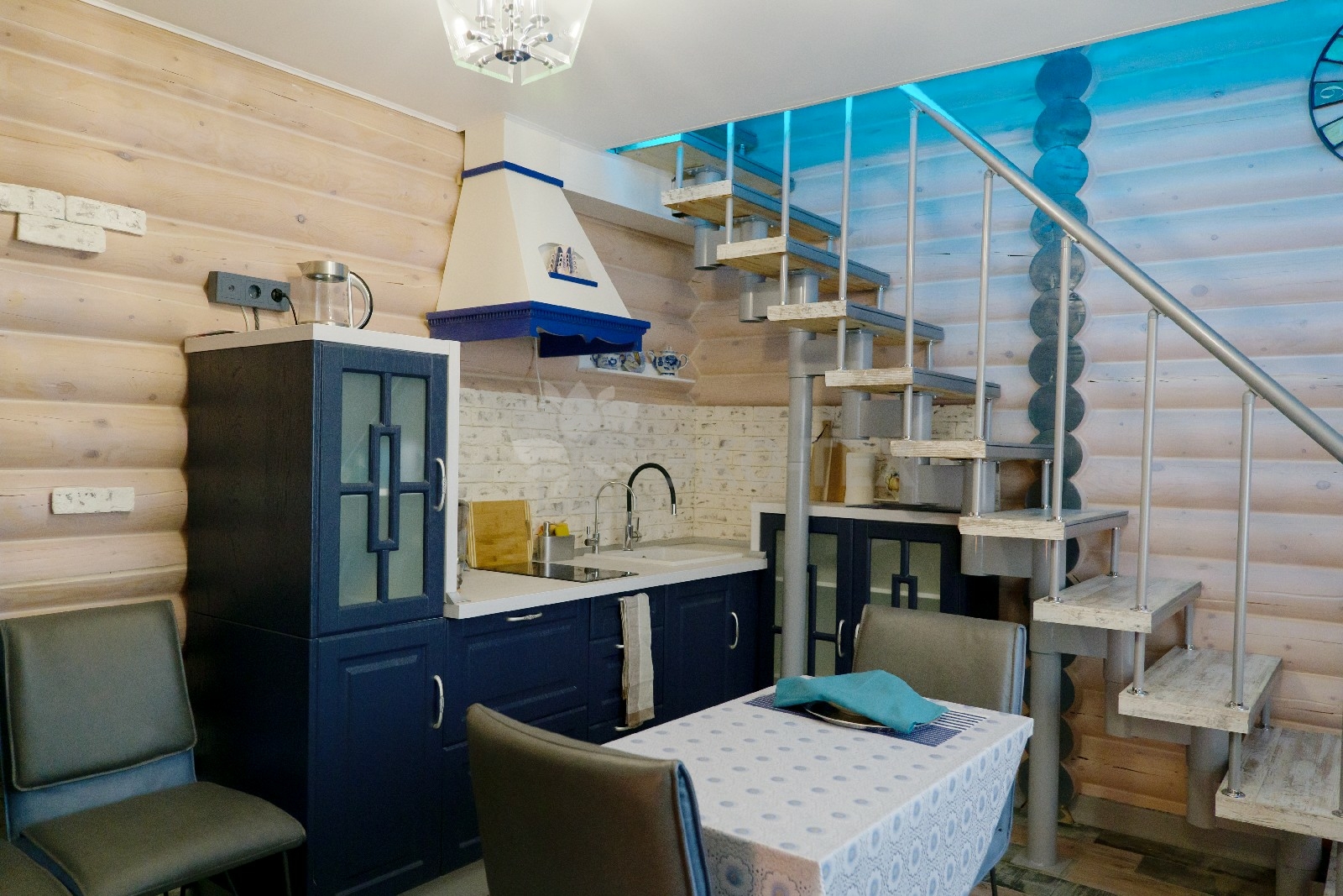 Первый этаж занимает гостиная, совмещённая со столовой и кухней, это является современным удобным архитектурным решением, при этом, за счёт грамотного зонирования, пространство имеет упорядоченную структуру. На первом этаже также расположены парная, санузел и прихожая.
