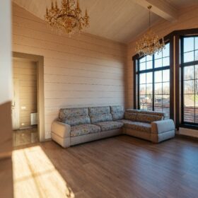 При строительстве можно снизить затраты на отделочные материалы поскольку такие стены не нуждаются в отделке, причем как внутри так и снаружи. Клееный брус можно покрыть специальным тонирующим составом, либо покрыть прозрачным лаком.