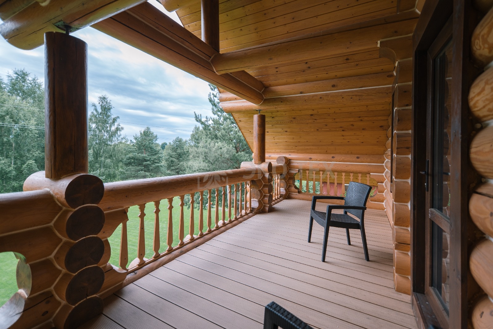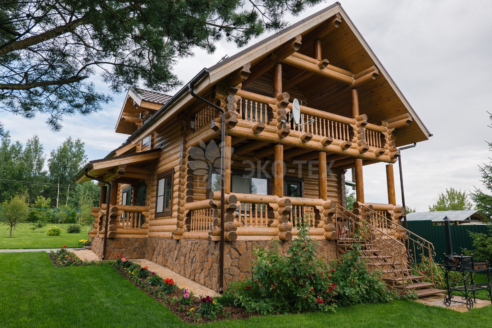 Двухэтажный большой дом из бревна с баней под одной крышей.