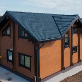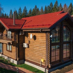 - Серый цвет кровли считается универсальным — к нему подходит любая отделка, от бревенчатых стен, до кирпичной кладки и штукатурки.